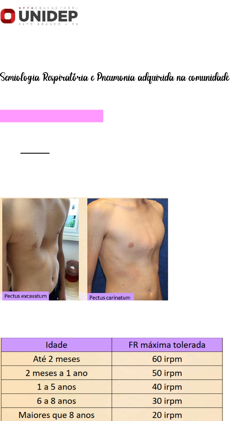 <p>Ana Julia Carlet Aquino</p><p>3º período</p><p>HAM III-PED</p><p>Semiologia sistema respiratório:</p><p> Inspeção:</p><p>-Estado geral da criança</p><p>-Formato de tórax, presença de malformações e abaulamentos: não necessariamente implica em patologia</p><p>-Padrão da respiração: observar se há taquipneia, dispneia (que implica em esforço respiratório) ou então</p><p>taquidispneia</p><p>-Frequência respiratória:</p><p>-Até dois anos → respiração abdominal</p><p>Ana Julia Carlet Aquino</p><p>3º período</p><p>-Uso de musculatura acessória</p><p>→Descompensação respiratória:</p><p>-Tiragem: intercostal, subcostal, supraesternal ou esternal</p><p>-Batimento de aleta nasal: abertura e fechamento cíclico das narinas na respiração espontânea,</p><p>dilatação das narinas durante inspiração diminui resistência da via aérea superior, diminuindo o trabalho</p><p>respiratório</p><p>-Gemência expiratória: fechamento parcial da glote durante a expiração pra manter capacidade residual</p><p>funcional e prevenir o colapso alveolar nas situações de perda de volume pulmonar; esforço respiratório</p><p>grave ou insuficiência respiratória</p><p>-Uso excessivo do abdome</p><p>-Frases entercortadas</p><p>-Alteração em sinais vitais</p><p>OBS: sempre alertar os pais sobre os sinais de gravidade, pois caso a criança comece manifestar em casa</p><p>é importante que seja detectado para que procurem ajuda</p><p> Palpação:</p><p>-Começa palpando a traqueia → pode ter desvio</p><p>-Avaliação da temperatura</p><p>-Linfonodos</p><p>-Frêmito toracovocal: mão espalmada na superfície do tórax →sentir vibração</p><p>-Verificar expansibilidade</p><p>-Frêmito brônquico e pleural</p><p> Percussão:</p><p>-Percutir cada hemitórax</p><p>-Som claro pulmonar: murmúrios vesiculares presentes</p><p> Ausculta:</p><p>-Escala grega (compara hemicorpos lateralmente) tanto no dorso quanto no tórax da criança, igual em</p><p>adultos</p><p>Exame físico normal: sem deformidades em caixa torácica, expansibilidade simétrica, sem sinais de</p><p>esforço respiratório, ausculta pulmonar com murmúrio vesicular bilateral e simétrico sem ruídos</p><p>adventícios</p><p>-Estridor: obstrução da via aérea alta, presente em casos de infecção ou laringomalacia, pode melhorar</p><p>no repouso e piorar com agitação</p><p>Ana Julia Carlet Aquino</p><p>3º período</p><p>-Sibilos: som agudo que pode ser auscultado tanto na inspiração, quanto na expiração, dentre suas</p><p>etiologias , encontram-se acumulo de secreções, edema, ou até espasmo da musculatura dos brônquios</p><p>de menor calibre</p><p>-Roncos: sons rudes e contínuos, podem ser ouvidos tanto na inspiração quanto na expiração, geralmente</p><p>estenoses ou secreções nos brônquios de menor calibre</p><p>-Estertores: finos: ouvidos ao final da inspiração e possuem curta duração, preenchimento dos alvéolos</p><p>com secreção; grossos: mais prolongados e audíveis na inspiração e na expiração</p><p>Pneumonia comunitária:</p><p>-Infecções respiratórias aguda (IRA) possuem elevada morbimortalidade na infância</p><p>-Infecção no parênquima, infiltração nos alvéolos, acometimento das vias aéreas inferiores → taquipneia</p><p>-Comunitária (pré hospitalar) X Nosocomial (hospitalar) → internação < 48hrs</p><p>→Fatores de risco: desnutrição, baixa idade, comorbidades, outros (baixo peso ao nascimento,</p><p>permanência em creche, vacinação incompleta, desmame precoce, variáveis socioeconômicas e</p><p>ambientais)</p><p>→Diferenciação:</p><p>→Etiologia:</p><p>-Difícil estabelecer diagnóstico etiológico → curso clinico costuma ser semelhante</p><p>-Vírus: agentes mais comuns, até 90% dos casos até 1 ano de vida e 50% em idade escolar → mais</p><p>comum: Vírus Sincicial Respiratório</p><p>-Maior gravidade e mortalidade: bactérias, mais comum: Streptococcus pneumoniae</p><p>Ana Julia Carlet Aquino</p><p>3º período</p><p>→Manifestações clinicas:</p><p>-Febre, tosse, taquipneia, congestão nasal, coriza, prostração, inapetência, dificuldade na amamentação,</p><p>dor abdominal, associação com otite media, vômitos</p><p>→Exame físico:</p><p>Ana Julia Carlet Aquino</p><p>3º período</p><p>-Sinais vitais: febre, hiposaturação, taquipneia</p><p>-Esforço respiratório (tiragens)</p><p>-Estertores na ausculta finos, roncos, pode haver sibilância associada</p><p>-Desidratação</p><p>-Frêmito toracovocal aumentado</p><p>-Sopro tubário → sensação de sopro no estetoscópio</p><p>-Macicez a percussão</p><p>-Dor a palpação abdominal</p><p>-Prostração intensa, mal estado geral</p><p>→Sinais de gravidade:</p><p>→Exames de imagem:</p><p>RAIO X:</p><p>-Solicita quando: há dúvida no diagnóstico, hipoxemia, desconforto respiratório, falha na resposta ao</p><p>tratamento em 48 a 72hrs ou se há piora progressiva, verificar complicações, paciente hospitalizado</p><p>O que é encontrado?</p><p>-Consolidação alveolar, pneumatoceles, derrames pleurais, abcessos → bacteriana</p><p>-Infiltrado intersticial → vírus, clamídia e mycoplasma pneumoniae</p><p>→Exames laboratoriais:</p><p>Ana Julia Carlet Aquino</p><p>3º período</p>