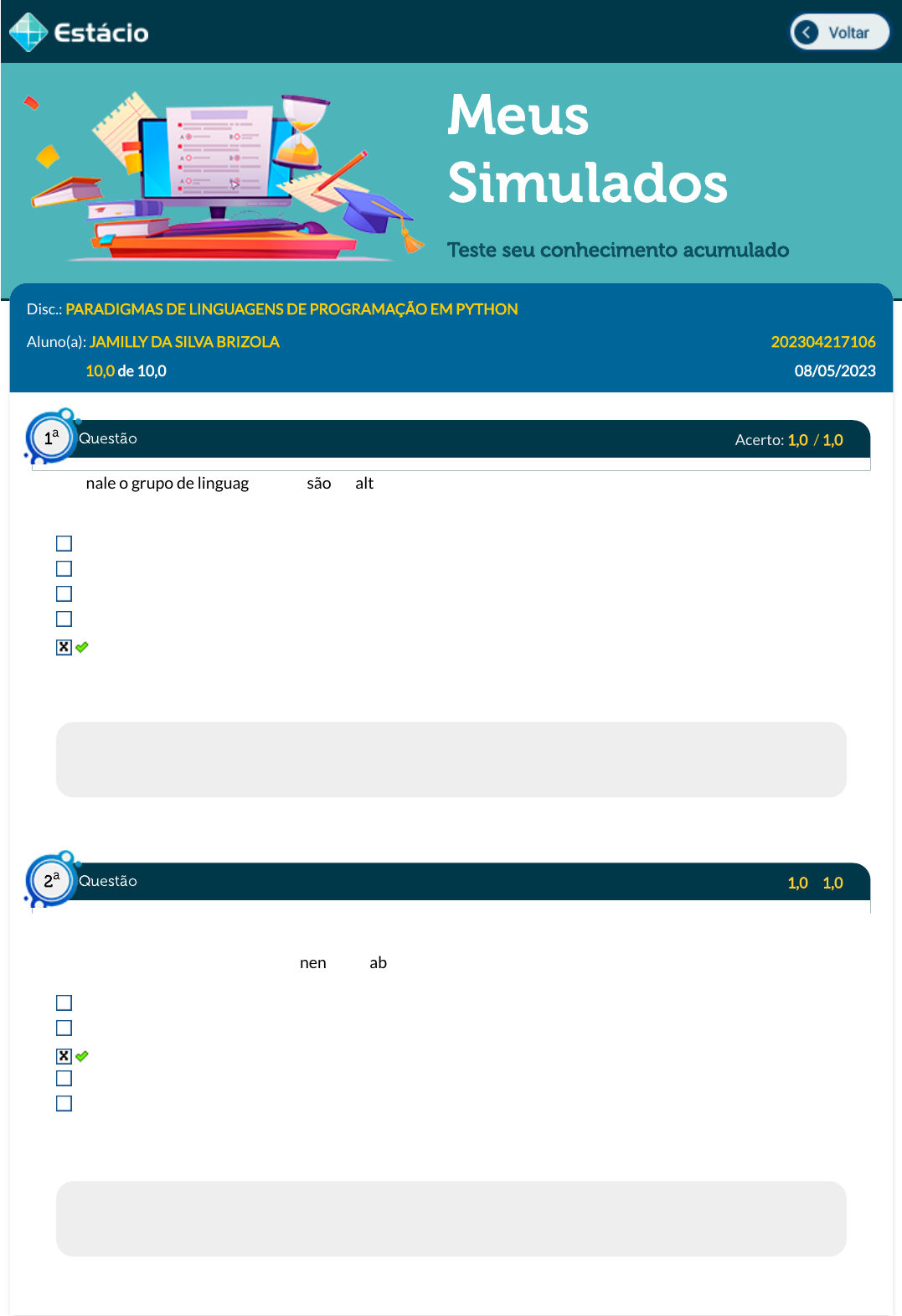<p>08/05/2023, 16:17 Estácio: Alunos</p><p>https://simulado.estacio.br/alunos/ 1/6</p><p>Meus</p><p>Simulados</p><p>Teste seu conhecimento acumulado</p><p>Disc.: PARADIGMAS DE LINGUAGENS DE PROGRAMAÇÃO EM PYTHON</p><p>Aluno(a): JAMILLY DA SILVA BRIZOLA 202304217106</p><p>Acertos: 10,0 de 10,0 08/05/2023</p><p>Acerto: 1,0 / 1,0</p><p>Assinale o grupo de linguagens que são de alto nível e atendem as características do paradigma Orientado a</p><p>objeto</p><p>Python, Java e Assembly</p><p>Phyton, Java, C++ e Delpi</p><p>Java e Fortran</p><p>Java, C++ e HTML</p><p>Java, C++, Python e Smalltalk</p><p>Respondido em 08/05/2023 17:10:02</p><p>Explicação:</p><p>A resposta correta é: Java, C++, Python e Smalltalk</p><p>Acerto: 1,0 / 1,0</p><p>Qual das linguagens abaixo possui nenhuma abstração</p><p>linguagem Assembly</p><p>linguagem Python</p><p>linguagem de máquina</p><p>linguagem HTML</p><p>linguagem JAVA</p><p>Respondido em 08/05/2023 17:06:34</p><p>Explicação:</p><p>A resposta correta é: linguagem de máquina.</p><p>Questão1</p><p>a</p><p>Questão2</p><p>a</p><p>https://simulado.estacio.br/alunos/inicio.asp</p><p>javascript:voltar();</p><p>08/05/2023, 16:17 Estácio: Alunos</p><p>https://simulado.estacio.br/alunos/ 2/6</p><p>Acerto: 1,0 / 1,0</p><p>Considere a seguinte expressão:</p><p>(True + 2)**2</p><p>Utilizando Python para avaliar a expressão, é correto a�rmar que:</p><p>A expressão vale 9.</p><p>Não será possível efetuar a operação em virtude da incompatibilidade de tipos.</p><p>A expressão vale 6.</p><p>A expressão vale 1.</p><p>A expressão vale True.</p><p>Respondido em 08/05/2023 17:10:29</p><p>Explicação:</p><p>A resposta correta é: A expressão vale 9. Vamos analisar por partes:</p><p>(True + 2)**2</p><p>(1 + 2)**2</p><p>(3)**2</p><p>9</p><p>Acerto: 1,0 / 1,0</p><p>As estruturas de dados são responsáveis por organizar e armazenar os dados de forma e�ciente, criando meios</p><p>para o usuário manuseá-los. Estruturas amplamente utilizadas e conhecidas são as pilhas, listas e �las. Com</p><p>relação a Algoritmos e Estrutura de Dados, dadas as a�rmações abaixo, assinale a alternativa CORRETA:</p><p>Python é uma linguagem compilável, a qual, após esse processo, gera um arquivo executável, do tipo</p><p>binário.</p><p>Python é uma linguagem procedural a qual não contempla orientação a objetos.</p><p>Listas, em Python, são conjuntos de valores, os quais só podem ser do mesmo tipo, acessados por um</p><p>índice numérico que inicia em 0 (zero).</p><p>Em comandos condicionais ou de repetição, a separação de blocos de código em Python é feita</p><p>utilizando a indentação.</p><p>A declaração de variáveis é algo obrigatório em Python.</p><p>Respondido em 08/05/2023 17:16:15</p><p>Explicação:</p><p>A resposta correta é: Em comandos condicionais ou de repetição, a separação de blocos de código em Python é feita</p><p>utilizando a indentação.</p><p>Python é uma linguagem interpretada que suporta programação orientada a objetos. No Python, não é necessário</p><p>declarar uma variável antes de utilizá-la e a indentação do código é fundamental entre os blocos para o seu correto</p><p>funcionamento</p><p>Questão3</p><p>a</p><p>Questão4</p><p>a</p><p>08/05/2023, 16:17 Estácio: Alunos</p><p>https://simulado.estacio.br/alunos/ 3/6</p><p>Acerto: 1,0 / 1,0</p><p>O trecho de código Python é uma função recursiva para o cálculo do fatorial de um número natural qualquer.</p><p>Entretanto, apresenta um erro de programação.</p><p>Em qual linha está o erro e como consertá-lo para que a função cumpra corretamente o seu propósito?</p><p>o código deveria ser "if (n == 1) and (n == 0):" na linha 2.</p><p>o código deveria ser "if (n == 1):" na linha 2.</p><p>o código deveria ser "return Fatorial(n) * n -1;" na linha 5.</p><p>o código deveria ser "return Fatorial(n - 1) * n;" na linha 5.</p><p>o código deveria ser "return 0" na linha 3.</p><p>Respondido em 08/05/2023 17:16:37</p><p>Explicação:</p><p>A resposta correta é: o código deveria ser "return Fatorial(n - 1) * n;" na linha 5.</p><p>Acerto: 1,0 / 1,0</p><p>Considere o seguinte trecho de um programa escrito em Python:</p><p>import math</p><p>print(sqrt(36))</p><p>Qual será o resultado da execução desse programa?</p><p>Ocorrerá um erro porque a chamada correta deveria ser math.sqrt(36)</p><p>Ocorrerá um erro porque a função print() precisa receber uma string como parâmetro</p><p>Será impresso na tela: 6</p><p>Será impresso na tela: "6"</p><p>Será impresso na tela: 6.0</p><p>Respondido em 08/05/2023 17:10:41</p><p>Explicação:</p><p>A resposta correta é: Ocorrerá um erro porque a chamada correta deveria ser math.sqrt(36)</p><p>Acerto: 1,0 / 1,0</p><p>(DPE-RJ/2014) Considere o seguinte trecho de um programa escrito na linguagem Python.</p><p>class Carro(object):</p><p>Questão5</p><p>a</p><p>Questão6</p><p>a</p><p>Questão7</p><p>a</p><p>08/05/2023, 16:17 Estácio: Alunos</p><p>https://simulado.estacio.br/alunos/ 4/6</p><p>def FaleComigo(self):</p><p>print ("Sou um carro")</p><p>class Fusca (Carro):</p><p>def FaleComUmFusca(self):</p><p>print ("Sou um Fusca")</p><p>x = Carro()</p><p>y = Fusca()</p><p>x.FaleComigo()</p><p>y.FaleComigo()</p><p>No primeiro bloco, o método FaleComigo é de�nido para a classe Carro, que simplesmente produz a mensagem</p><p>"Sou um carro" ao ser invocado. Para a classe Fusca, de�nida no segundo bloco, foi de�nido o método</p><p>FaleComUmFusca, que apenas produz a mensagem "Sou um Fusca". No terceiro bloco, os objetos x e y tornam-</p><p>se instâncias das classes Carro e Fusca, respectivamente. No quarto bloco, o método FaleComigo é invocado</p><p>para cada um dos dois objetos, x e y. Ao ser executado, esse programa produz duas linhas na sua tela de saída:</p><p>Sou um carro</p><p>Sou um carro</p><p>A mensagem produzida no comando y.FaleComigo deve-se ao mecanismo de</p><p>Interface.</p><p>Her