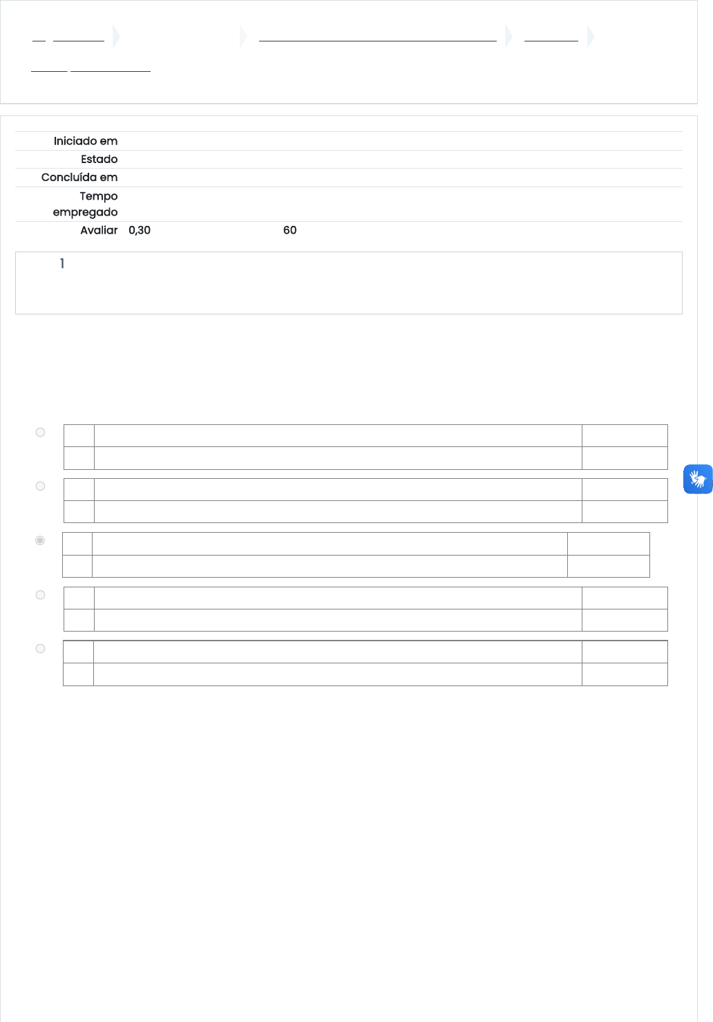 <p>Página inicial Minhas disciplinas 2024/3 - CONTABILIDADE DE AGRONEGÓCIOS UNIDADE II</p><p>Avaliação - Unidade II</p><p>Iniciado em quinta, 29 ago 2024, 10:27</p><p>Estado Finalizada</p><p>Concluída em quinta, 29 ago 2024, 11:40</p><p>Tempo</p><p>empregado</p><p>1 hora 12 minutos</p><p>Avaliar 0,30 de um máximo de 0,50(60%)</p><p>Questão 1</p><p>Correto</p><p>Atingiu 0,05 de 0,05</p><p>Uma empresa agrícola gastou R$180.000 (a prazo) para o plantio da cultura temporária de arroz. O contador da</p><p>empresa precisa realizar os registros contábeis sobre a constituição da lavoura de arroz na contabilidade.</p><p>Dessa forma, o contador realizou os seguintes lançamentos contábeis no Livro Diário da empresa rural:</p><p>a. D Cultura permanente em formação – Arroz (Ativo não Circulante) 180.000</p><p>C Mão de obra de terceiros (Ativo Circulante – Créditos) 180.000</p><p>b. D Produto Agrícola – Arroz (Ativo Circulante – Estoques) 180.000</p><p>C Contas a pagar (Passivo Circulante – obrigações) 180.000</p><p>c. D Cultura temporária em formação – Arroz (Ativo Circulante – Estoque) 180.000</p><p>C Contas a pagar (Passivo Circulante – obrigações) 180.000</p><p></p><p>d. D Cultura temporária em formação – Arroz (Ativo Circulante – Estoque) 180.000</p><p>C Banco (Ativo Circulante – Disponibilidades) 180.000</p><p>e. D Valor justo – Ativo biológico – Arroz (Ativo Circulante – Estoques) 180.000</p><p>C Contas a pagar (Passivo Circulante – obrigações) 180.000</p><p>29/08/2024, 11:39 Avaliação - Unidade II: Revisão da tentativa</p><p>https://ambienteonline.uninga.br/mod/quiz/review.php?attempt=3114250&cmid=801568 1/5</p><p>https://ambienteonline.uninga.br/</p><p>https://ambienteonline.uninga.br/course/view.php?id=28562</p><p>https://ambienteonline.uninga.br/course/view.php?id=28562§ion=3</p><p>https://ambienteonline.uninga.br/mod/quiz/view.php?id=801568</p><p>Questão 2</p><p>Incorreto</p><p>Atingiu 0,00 de 0,05</p><p>Questão 3</p><p>Incorreto</p><p>Atingiu 0,00 de 0,05</p><p>Uma empresa agrícola realizou os seguintes gastos para a formação das plantas portadoras de Peras, que</p><p>produzirão frutos ao longo da sua vida útil durante 15 anos.</p><p>Adubo 16.000,00</p><p>Mão de obra terceiros 12.000,00</p><p>Mudas 41.000,00</p><p>Mão de obra terceiros 20.000,00</p><p>Total 89.000,00</p><p>Durante o primeiro ano de safra, o contador dessa empresa agrícola deve registrar contabilmente os valores</p><p>correspondentes à depreciação das plantas portadoras da seguinte forma.</p><p>a. D Custo do Produto Agrícola – Pera (Contas de Resultado – Custos) 5.933,33</p><p>C Exaustão Acumulada (Ativo não Circulante – Imobilizado) 5.933,33</p><p></p><p>b. D Colheita em andamento – Pera (Ativo Circulante – Estoque) 5.933,33</p><p>C Exaustão Acumulada (Ativo não Circulante – Imobilizado) 5.933,33</p><p>c. D Colheita em andamento – Pera (Ativo Circulante – Estoque) 89.000,00</p><p>C Exaustão Acumulada (Ativo não Circulante – Imobilizado) 89.000,00</p><p>d. D Colheita em andamento – Pera (Ativo Circulante – Estoque) 89.000,00</p><p>C Exaustão Acumulada (Ativo não Circulante – Imobilizado) 89.000,00</p><p>e. D Produto Agrícola – Pera (Ativo Circulante – Estoques) 8.900,00</p><p>C Exaustão Acumulada (Ativo não Circulante – Imobilizado) 8.900,00</p><p>Uma cultura temporária que foi colhida, mas que não foi vendida, é classificada contabilmente como:</p><p>a. Ativo Circulante - Investimentos</p><p>b. Ativo Circulante – Cultura temporária em formação</p><p>c. Ativo Circulante – Créditos</p><p>d. Ativo Circulante – Produto Agrícola</p><p>e. Ativo Circulante - Estoque </p><p>29/08/2024, 11:39 Avaliação - Unidade II: Revisão da tentativa</p><p>https://ambienteonline.uninga.br/mod/quiz/review.php?attempt=3114250&cmid=801568 2/5</p><p>Questão 4</p><p>Correto</p><p>Atingiu 0,05 de 0,05</p><p>Questão 5</p><p>Correto</p><p>Atingiu 0,05 de 0,05</p><p>Questão 6</p><p>Correto</p><p>Atingiu 0,05 de 0,05</p><p>A principal característica das culturas temporárias é que estão sujeitas ao replantio após a colheita, ou seja, é</p><p>possível colher e arrancar as plantas do solo. Uma cultura temporária em formação, que ainda não atingiu o ponto</p><p>de colheita, é classificada no seguinte grupo de contas:</p><p>a. Ativo Circulante - Créditos</p><p>b. Ativo não Circulante – Intangível</p><p>c. Ativo Circulante - Investimentos</p><p>d. Ativo não Circulante - Investimentos</p><p>e. Ativo Circulante - Estoque </p><p>O Brasil possui participação significativa no comércio mundial de outras commodities, como feijão, algodão, frutas,</p><p>açúcar, café, carne bovina, suína e frango. Dentro desse extensivo mercado de commodities globalmente ativo, é</p><p>possível realizar uma inferência mais tempestiva sobre o valor justo. Dessa forma, qual fator é determinante para a</p><p>mensuração do valor dos produtos agrícolas na atividade rural?</p><p>a. O estágio final de formação das plantas portadoras.</p><p>b. preferencialmente no término da colheita das culturas permanentes e temporárias. </p><p>c. O fechamento dos preços em bolsas de valores de commodities.</p><p>d. O pagamento dos custos para formação das culturas.</p><p>e. O ponto de venda dos produtos agrícolas.</p><p>Assinale a alternativa que apresenta a principal característica das culturas permanentes:</p><p>a. Não ser mensurada pelo valor justo no ponto de colheita e reconhecida como estoques.</p><p>b. São permanentes vinculadas ao solo, possuindo a capacidade de gerar frutos. </p><p>c. É possível arrancar as plantas do solo e estão sujeitas ao replantio após a colheita.</p><p>d. Possuir maior representatividade econômica na atividade econômica da propriedade rural.</p><p>e. Possuir uma disponibilidade de preços de mercado amplamente consolidado.</p><p>29/08/2024, 11:39 Avaliação - Unidade II: Revisão da 