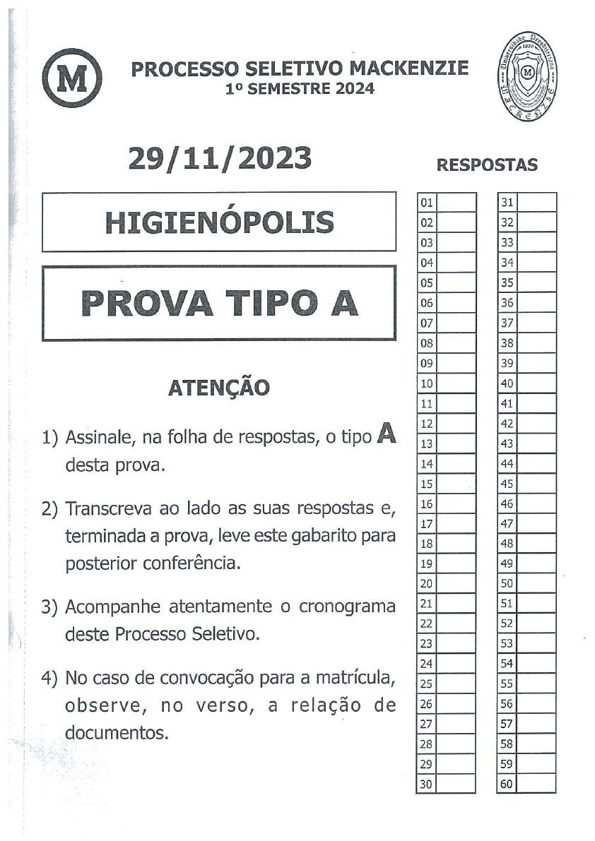 <p>PROCESSO SELETIVO MACKENZIE</p><p>1° SEMESTRE 2024o .4,,,s</p><p>‘/1 /20 3</p><p>6I 1 1</p><p>RESPOSTAS</p><p>1</p><p>ATE ÇÃO</p><p>de respostas, o tipo A</p><p>01</p><p>02</p><p>03</p><p>04</p><p>05</p><p>06</p><p>07</p><p>08</p><p>09</p><p>10</p><p>11</p><p>12</p><p>13</p><p>14</p><p>15</p><p>16</p><p>17</p><p>18</p><p>19</p><p>20</p><p>21</p><p>22</p><p>23</p><p>24</p><p>25</p><p>26</p><p>27</p><p>28</p><p>29</p><p>30</p><p>31</p><p>32</p><p>33</p><p>34</p><p>35</p><p>36</p><p>37</p><p>38</p><p>39</p><p>40</p><p>41</p><p>42</p><p>43</p><p>44</p><p>45</p><p>46</p><p>47</p><p>48</p><p>49</p><p>50</p><p>51</p><p>52</p><p>53</p><p>54</p><p>55</p><p>56</p><p>57</p><p>58</p><p>59</p><p>60</p><p>1) As~inale, na folha</p><p>desta prova.</p><p>2) Transcreva ao lado as suas respostas e,</p><p>terminada a prova, leve este gabarito para</p><p>posterior conferência.</p><p>3) Acompanhe atentamente o cronograma</p><p>deste Processo Seletivo.</p><p>• 4) No caso de convocação para a matrícula,</p><p>observe, no verso, a relação de</p><p>Para matrícula inicial, o candidato ou seu representante legal deverá digitalizar e anexar</p><p>obrigatoriamente, cópia dos seguintes documentos:</p><p>• Cédula de Identidade (R.G.).</p><p>• 1 (uma) foto 3x4, recente.</p><p>• C.P.E — Cadastro de Pessoa Física.</p><p>• Documento que comprove o local de residência do candidato.</p><p>• Certificado de conclusão do Ensino Médio.</p><p>• Histórico Escolar do Ensino Médio.</p><p>O não encaminhamento, nos prazos estabelecidos, de qnalquer dos documentos citados</p><p>acima, enseja a não aceitação da matrícula inicial.</p><p>A Universidade Presbiteriana Mackenzie reserva-se ao direito de solicitar se entender</p><p>necessário, a seujuízo, a apresentação do documento original.</p><p>Observação: O candidato que tenha realizado estudos equivalentes ao Ensino Médio</p><p>no exterior deverá apresentar prova de equivalência de estudos fornecida por autoridade</p><p>competente.</p><p>ATENÇÃO</p><p>1 - Caso o candidato possua Cédula de Identidade e Certidão de Nascimento com</p><p>divergência na grafia do nome, deverá ser apresentada cópia atualizada da certidão</p><p>de nascimento.</p><p>2 - No caso de acréscimo de nome decorrente de casamento, ainda não constante</p><p>na Cédula de Identidade, deverá ser apresentada cópia da certidão de casamento</p><p>atualizada.</p><p>3 - O Certificado de Conclusão e o Histórico Escolar do Ensino Médio poderão ser</p><p>substituídos pelo Diploma de Curso Superior, devidamente registrado.</p><p>4 - Para dispensa de disciplinas cursadas em outra instituição, o candidato deverá</p><p>apresentar:</p><p>a) Histórico Escolar contendo carga horária completa e as notas de aproveitamento;</p><p>b) Conteúdo programático das disciplinas aprovadas.</p><p>Os pedidos de equivalência/dispensa de disciplinas deverão ser feitos on-line, após a</p><p>efetivacâo da matrícula, através da opção “REQUERIMENTOS/APROVEITAMENTO</p><p>DE CREDITOS”, na área destinada ao aluno (T.I.A.), no prazo máximo de 7(sete) dias</p><p>avós essa efetivacão. Os pedidos serão analisados rigorosamente sob os aspectos de</p><p>conteúdos programáticos e suas respectivas cargas horárias, sendo que, eventualmente,</p><p>o candidato poderá sofrer um acréscimo no tempo de integralização do curso pretendido,</p><p>a depender dos resultados obtidos.</p><p>Nome:</p><p>1 1 1 1 1 1 I—EEI</p><p>REDAÇÃO, PORTUGUÊS, INGLÊS,</p><p>FÍSICA, QUÍMICA, MATEMÁTICA,</p><p>BIOLOGIA, HISTÓRIA e GEOGRAFIA</p><p>TIPO DE PROVA: A</p><p>Instruções</p><p>I.Escreva o seu nome e o seu número de inscrição neste caderno.</p><p>2. Verifique se a folha de respostas está perfeita, confira o seu número de</p><p>inscrição e assinale o tipo de prova A.</p><p>3.Verifique se a folha de redação está perfeita e confira o seu número de</p><p>inscrição.</p><p>4. Transcreva, com tinta azul ou preta, as alternativas escolhidas para a</p><p>folha de respostas, sem cometer rasuras.</p><p>5.Terminada a prova, entregue a folha de respostas, a folha de redação e</p><p>o caderno de questões ao fiscal.</p><p>6. Após o ínicio da prova, é de uma hora a permanência mínima do candidato</p><p>na sala. A duração da prova é de 4 horas, incluindo a passagem das</p><p>respostas para a folha de respostas.</p><p>29 / 11 / 2023</p><p>REDAÇÃO</p><p>A partir da leitura dos textos abaixo, redija uma dissertação com coesão e</p><p>coerência, obedecendo aos padrões da norma culta escrita.</p><p>Atenção para as orientações:</p><p>• Coloque título em seu texto.</p><p>• O tema deve ser depreendido pela leitura (verbal ou visual) de todos os textos.</p><p>• Observe os posicionamentos presentes em cada texto para elaborar sua</p><p>argumentação.</p><p>Texto 1</p><p>Injeções da polémica: em alta entre celebridades e nas redes sociais,</p><p>novos remédios para emagrecer bombam em vendas e viram alvo de</p><p>preocupação dos médicos por uso indevido.</p><p>Revista Veja, 12/04/2 023</p><p>Texto II</p><p>E</p><p>https://Ietrasdofu tu ro.wordprcss.com/charges-2/</p><p>Texto III</p><p>Hoje, aliás, surge a problemática da transformação da beleza em meio</p><p>de obter lucro: estamos ainda diante da beleza quando a finalidade não</p><p>é sua presença, mas o lucro?</p><p>Juveni Savian Filho, filósofo</p><p>pág. 2</p><p>RASCUNHO DA REDAÇÃO</p><p>01.</p><p>02.</p><p>03.</p><p>04.</p><p>05</p><p>06.</p><p>07.</p><p>08.</p><p>09.</p><p>10.</p><p>11.</p><p>12.</p><p>13.</p><p>14.</p><p>15.</p><p>16.</p><p>17.</p><p>18.</p><p>19.</p><p>20.</p><p>pág. 3 Proo~ Tipo</p><p>RASCUNHO DA REDAÇÃO</p><p>21.</p><p>22.</p><p>23.</p><p>24.</p><p>25.</p><p>26.</p><p>2.</p><p>28.</p><p>29.</p><p>30.</p><p>31.</p><p>32.</p><p>3.</p><p>34.</p><p>35.</p><p>36.</p><p>38.</p><p>39.</p><p>40.</p><p>Prova Tipo A pág. 4</p><p>PORTUGUÊS</p><p>Texto para as questões de 0