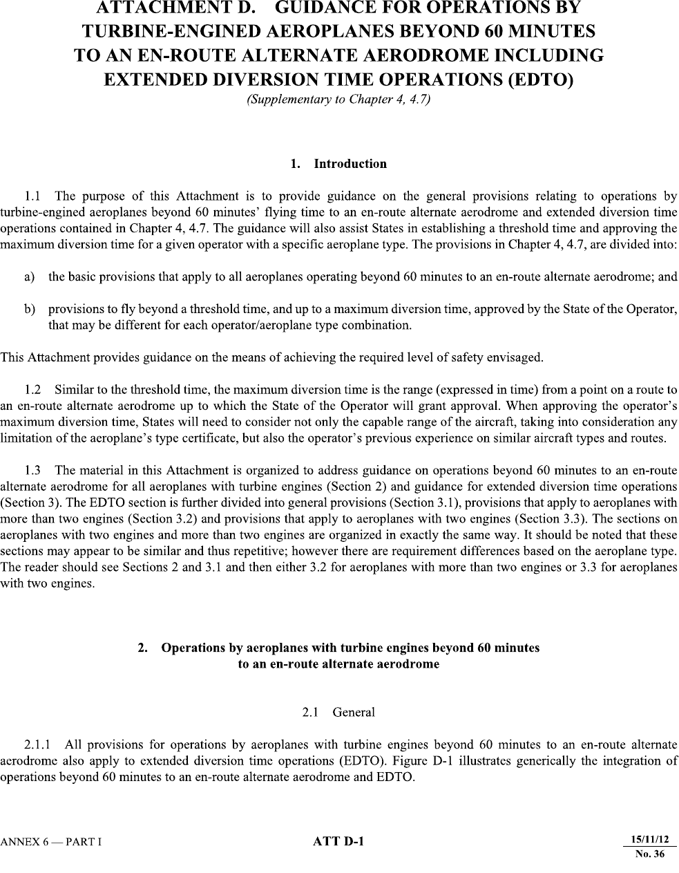 <p>ATTACHMENT D. GUIDANCE FOR OPERATIONS BY TURBINE-ENGINED AEROPLANES BEYOND 60 MINUTES TO AN EN-ROUTE ALTERNATE AERODROME INCLUDING EXTENDED DIVERSION TIME OPERATIONS (EDTO) (Supplementary to Chapter 4, 4.7) 1. Introduction 1.1 The purpose of this Attachment is to provide guidance on the general provisions relating to operations by turbine-engined aeroplanes beyond 60 minutes' flying time to an en-route alternate aerodrome and extended diversion time operations contained in Chapter 4, 4.7. The guidance will also assist States in establishing a threshold time and approving the maximum diversion time for a given operator with a specific aeroplane type. The provisions in Chapter 4, 4.7, are divided into: a) the basic provisions that apply to all aeroplanes operating beyond 60 minutes to an en-route alternate aerodrome; and b) provisions to fly beyond a threshold time, and up to a maximum diversion time, approved by the State of the Operator, that may be different for each operator/aeroplane type combination. This Attachment provides guidance on the means of achieving the required level of safety envisaged. 1.2 Similar to the threshold time, the maximum diversion time is the range (expressed in time) from a point on a route to an en-route alternate aerodrome up to which the State of the Operator will grant approval. When approving the operator's maximum diversion time, States will need to consider not only the capable range of the aircraft, taking into consideration any limitation of the aeroplane's type certificate, but also the operator's previous experience on similar aircraft types and routes. 1.3 The material in this Attachment is organized to address guidance on operations beyond 60 minutes to an en-route alternate aerodrome for all aeroplanes with turbine engines (Section 2) and guidance for extended diversion time operations (Section 3). The EDTO section is further divided into general provisions (Section 3.1), provisions that apply to aeroplanes with more than two engines (Section 3.2) and provisions that apply to aeroplanes with two engines (Section 3.3). The sections on aeroplanes with two engines and more than two engines are organized in exactly the same way. It should be noted that these sections may appear to be similar and thus repetitive; however there are requirement differences based on the aeroplane type. The reader should see Sections 2 and 3.1 and then either 3.2 for aeroplanes with more than two engines or 3.3 for aeroplanes with two engines. 2. Operations by aeroplanes with turbine engines beyond 60 minutes to an en-route alternate aerodrome 2.1 General 2.1.1 All provisions for operations by aeroplanes with turbine engines beyond 60 minutes to an en-route alternate aerodrome also apply to extended diversion time operations (EDTO). Figure D-1 illustrates generically the integration of operations beyond 60 minutes to an en-route alternate aerodrome and EDTO. ANNEX 6 PART I ATT D-1 15/11/12 No. 36</p><p>Annex 6 - Operation of Aircraft Part I Diversion range Threshold Maximum (in time) 60 minutes (e.g. 60, 75, 90, 180 minutes) diversion time Operations beyond 60 minutes OPS control and flight dispatch OPS procedures Training EDTO approval Identify alternates For twin-engined aircraft: - verify alternates above minima EDTO approval EDTO significant systems EDTO critical fuel Verify alternates above minima For twin-engined aircraft: - maintenance programme - file alternate in ATS flight plan Fixed value State State established approved (specific to (specific to aircraft type) operator and aircraft type) Figure D-1. Generic EDTO graphical representation 2.1.2 In applying the requirements for aeroplanes with turbine engines in Chapter 4, 4.7, it should be understood that: a) operational control refers to the exercise, by the operator, of responsibility for the initiation, continuation, termination or diversion of a flight; b) flight dispatch procedures refer to the method of control and supervision of flight operations. This does not imply a specific requirement for licensed flight dispatchers or a full flight following system; c) operating procedures refer to the specification of organization and methods established to exercise operational control and flight dispatch procedures in the appropriate manual(s) and should cover at least a description of responsibilities concerning the initiation, continuation, termination or diversion of each flight as well as the method of control and supervision of flight operations; and d) training programme refers to the training for pilots and flight operations officers/flight dispatchers in operations covered by this and following sections. 2.1.3 Aeroplanes with turbine engines operating beyond 60 minutes to an en-route alternate aerodrome are not required to have specific additional approval by the State of the Operator except if they engage in extended diversion time operations. 15/11/12 ATT D-2 No. 36</p><p>Attachment D Annex 6 - Operation of Aircraft 2.2 Conditions to be used when converting diversion times to distances 2.2.1 For the purpose of this guidance, an approved one-engine-inoperative (OEI) speed or approved all-engines-operative (AEO) speed is any speed within the certified flight envelope of the aeroplane. 2.2.2 Determination of the 60-minute distance - aeroplanes with two turbine engines 2.2.2.1 For determining whether a point on the route is beyond 60 minutes to an en-route alternate, the operator should select an approved OEI speed. The distance is calculated from the point of the diversion followed by cruise for 60 minutes, in ISA and still-air conditions, as shown in Figure D-2. For the purposes of computing distances, credit for driftdown may be taken. T=0 T + 60 minutes Start of diversion 60-minute distance Figure D-2. Sixty-minute distance - aeroplanes with two turbine engines 2.2.3 Determination of the 60-minute distance - aeroplanes with more than two turbine engines 2.2.3.1 For determining whether a point on the 