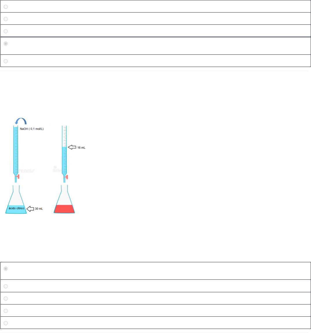 <p>Questão 1/10 - Química Orgânica</p><p>Leia o texto:</p><p>"O fenol, ou hidroxibenzeno, é líquido e incolor em temperatura ambiente [...]. [...] éteres com estruturas variadas são encontrados na natureza, os quais</p><p>atuam como sinalizadores biológicos para diferentes espécies [...]. Por fim, o aldeído e a cetona são amplamente encontrados na natureza como</p><p>fragrâncias, hormônios [...]".</p><p>Considerando o fragmento de texto e os conteúdos do livro-base Química Orgânica, relacione corretamente as propriedades físico-químicas dos grupos</p><p>funcionais às suas respectivas características:</p><p>1. Fenol</p><p>2. Éter</p><p>3. Aldeído e Cetona</p><p>( ) Possui solubilidade similar ao dos álcoois de mesma massa molecular.</p><p>( ) O composto pode fazer ligações de hidrogênio e tornar-se solúvel em água.</p><p>( ) Possui elevado ponto de ebulição em relação a alcenos.</p><p>Agora, assinale a alternativa que apresenta a sequência correta:</p><p>A 3 - 2 - 1</p><p>B 2 - 3 - 1</p><p>C 1 - 3 - 2</p><p>D 2 - 1 - 3</p><p>Você assinalou essa alternativa (D)</p><p>E 1 - 2 - 3</p><p>Questão 2/10 - Química Orgânica</p><p>LABORATÓRIO DE EXPERIMENTOS INTERDISCIPLINARES QUÍMICA</p><p>Considerando os conteúdos da Videoaula Espectrofotometria de UV-vis, parte 2 -Lab de Experimentos Interdisciplinares, Aula 1 (21.05.2021), em</p><p>que foi realizada uma titulação, responda: a figura a seguir representa os dados da titulação ocorrida na aula, com base nisso calcule o valor aproximado</p><p>da concentração de ácido cítrico, em mol/L, pelo método descrito no vídeo.</p><p>para todos verem: uma figura representa uma bureta antes da reação, sendo adicionado solução de NaOH com concentração igual a 0,1 mol/L e 30 mL</p><p>de ácido cítrico em um erlenmeyer. Após a titulação a figura mostra que foram utilizados 16 mL de solução de NaOH até a cor da solução no erlenmeyer</p><p>ficar rosa.</p><p>Dados: Reação:</p><p>1C H O + 3NaOH ? 1acetato de sódio + 3H O</p><p>A 0,018 mol/L</p><p>Você assinalou essa alternativa (A)</p><p>B 1,8 mol/L</p><p>C 0,3 mol/L</p><p>D 0,1 mol/L</p><p>E 18 mol/L</p><p>Após esta avaliação, caso queira ler o texto integralmente, ele está disponível em: SANDRINO, B. Química Orgânica. Curitiba: Intersaberes, 2020. p. 131-135.</p><p>6 8 7 2</p><p>29/08/2024, 15:18 AVA UNIVIRTUS</p><p>https://univirtus.uninter.com/ava/web/?_ga=2.98649630.1461869127.1705181875-703510587.1702335692&_gac=1.85640555.1704726982.Cjw… 1/4</p><p>Questão 3/10 - Química Orgânica</p><p>Leia o fragmento de texto:</p><p>"Amidas são compostos derivados de ácidos carboxílicos que têm grupo carbonila ligado a um átomo de nitrogênio que, por sua vez, encontra-se ligado</p><p>a hidrogênios e/ou a grupos alquilas ou arilas (R)".</p><p>A partir do excerto anterior e dos conteúdos do livro-base Química Orgânica sobre amidas, assinale a alternativa correta:</p><p>A As amidas possuem somente grupos orgânicos (alquil ou aril) ligados ao átomo de nitrogênio conectado à carbonila.</p><p>B As amidas podem apresentar hidrogênios ou, um ou dois, grupos orgânicos (alquil ou aril) ligados ao nitrogênio conectado à</p><p>carbonila.</p><p>Você assinalou essa alternativa (B)</p><p>C As amidas são classificadas em primárias (RCONHR’), secundárias (RCONR’R’’) e terciárias (RCONH ).</p><p>D As amidas devem apresentar hidrogênios e grupos orgânicos ligados a um átomo de nitrogênio conectado à carbonila.</p><p>E As amidas são classificadas em primárias (RCONHR’) e secundárias (RCONR’R’’).</p><p>Questão 4/10 - Química Orgânica</p><p>Leia o trecho de texto a seguir:</p><p>“O empacotamento é uma propriedade que determina em que extensão as moléculas individuais em um sólido se encaixam em uma rede cristalina.</p><p>Quanto mais unidas, mais energia será necessária para romper a rede e fundir o composto.”</p><p>Considerando estas informações, os conteúdos do livro-base Química Orgânica e os conteúdos da aula 3 da disciplina de Química Orgânica, a respeito</p><p>das propriedades químicas dos compostos orgânicos, assinale a alternativa correta:</p><p>A O ponto de fusão dos alcanos aumenta de acordo com o peso molecular.</p><p>Você assinalou essa alternativa (A)</p><p>B Alcanos e álcoois são solúveis em água.</p><p>C Todos os álcoois são solúveis em água.</p><p>D Aminas têm ponto de ebulição menor que dos alcanos.</p><p>E O Metanol é uma substância apolar.</p><p>Questão 5/10 - Química Orgânica</p><p>Leia o texto:</p><p>"Álcoois são de grande importância industrial e farmacológica. [...] No Brasil, desde a década de 1980, é usado como combustível ambientalmente</p><p>melhor que os derivados de petróleo, cujas fontes não são renováveis".</p><p>Considerando o extrato de texto e os conteúdos do livro-base Química Orgânica sobre propriedades físico-químicas de álcoois, assinale a alternativa</p><p>correta:</p><p>A A solubilidade dos álcoois em água é menor quando até 4 carbonos estão presentes em monoálcoois, acima dessa</p><p>quantidade, a cadeia carbônica torna o álcool cada vez mais solúvel.</p><p>B Nos álcoois, a ligação entre oxigênio e hidrogênio é muito polar, o que forma, entre suas moléculas, as interações do tipo</p><p>dipolo-dipolo.</p><p>C Nos álcoois, as temperaturas de fusão e ebulição diminuem com o aumento da massa molar.</p><p>D Os álcoois apresentam temperaturas de fusão e de ebulição menores que os alcanos, devido as interações intermoleculares</p><p>do tipo ligação de hidrogênio.</p><p>E A presença de mais grupos hidroxila (OH) em uma mesma estrutura pode aumentar a sua solubilidade em água.</p><p>Você assinalou essa alternativa (E)</p><p>Questão 6/10 - Química Orgânica</p><p>Leia o fragmento de texto a seguir:</p><p>“Estruturas em bastão são representadas em zigue-zague (/\/\), em que cada vértice ou extremi