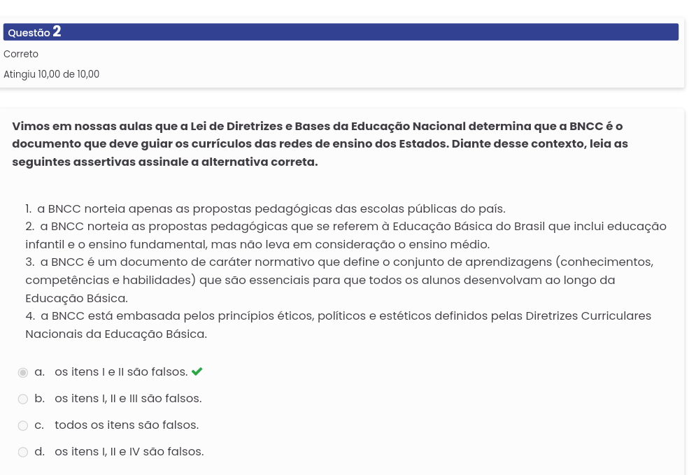 <p>Questão 2 Correto Atingiu 10,00 de 10,00 Vimos em nossas que a Lei de Diretrizes e Bases da Educação Nacional determing que a BNCC é o documento que deve guiar os currículos das redes de ensino dos Estados. Diante desse contexto, leia as seguintes assertivas assingle a alternativa correta. 1. a BNCC norteia apenas as propostas pedagógicas das escolas públicas do 2. a BNCC norteia as propostas pedagógicas que se referem à Educação Básica do Brasil que inclui educação infantil e ensino fundamental, mas não leva em consideração ensino 3. a BNCC é um documento de caráter normativo que define o conjunto de aprendizagens (conhecimentos, competências e habilidades) que são essenciais para que todos os alunos desenvolvam ao longo da Educação Básica. 4. a BNCC está embasada pelos princípios éticos, políticos e estéticos definidos pelas Diretrizes Curriculares Nacionais da Educação Básica. a. os itens e são falsos. b. os itens e III são falsos. C. todos os itens são falsos. d. os itens I, e IV são falsos.</p>