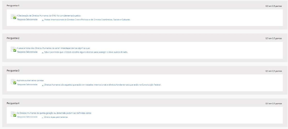 <p>Pergunta 1 0,5 em 0.5 pontos A Declaração de Direitos Humanos da ONU complementada pelos: Resposta a. Pactos de Direitos Civis Políticos e de Direitos Sociais Pergunta 2 0.5 em 0.5 pontos A característica dos Humanos de serem interdependentes significa Resposta e. Não permitido que Estado direitos para proteger de lado Pergunta 3 0,5 em pontos Assinale a alternative correta: Resposta a Direitos humanos que estão em tratados internacionais e direitos que estão na Constituição Federal Pergunta 4 em 0,5 Os Direitos Humanos de quinta geração ou dimensão podem ser Direito permanence</p><p>Pergunta 5 0,5 em pontos direitos e civis são direitos Resposta a. Primeira geração ou Pergunta 6 em 0,5 pontos Para a Direitos são Resposta Que são diferentes diversas sociedades do planeta porque adotam formas de proceder Pergunta 7 0,5 em 0,5 pontos Penas como trabalhos forçados e ser aplicadas livremente no Brasil? Resposta parque Constituição Federal veda Pergunta 8 em 0,5 pontos Direitos Humanos Resposta b. inerentes ao Pergunta 9 0,5 em 0,5 pontos Quando nos referimos Direitos de um conjunto de direitos que tem por objetivo b. A dignidade da pessoa humana.</p><p>Pergunta 10 poncos dos Direitos entre Resposta Universalidade 18 de de 2023 GMT-03:00</p><p>Pergunta 1 0,5 em 0.5 pontos É correto Resposta No a educação deve garantir pluralismo de e concepções Pergunta 2 0,5 em 0.5 poncos A Constituição Federal brasileira garante entre os direitos fundamentals direito mas veda Resposta b. Pergunta 3 0,5 em 0.5 pontos No a garantia dos direitos dos Resposta Priorização do do familia em detrimento do atendimento em Pergunta 4 em 0.5 pontos No Brasil dever do Estado em promover saúde Resposta Não des des das empresas sociedade Pergunta 5 0.5 em 0.5 sindicato de uma determinada profissional encaminhou carta para os profissionais exigindo a no de 48 sab pena de aplicação de muita de punição consubstanciada em da liberdade de da Essa decisão Resposta porque Constituição Federal garante que ninguém pode ser compelido a se ou a permanecer</p><p>Pergunta 6 Os de Saúde deverão ser compostos Selecionadas Representantes do profissionais de prestadores de serviços Pergunta 7 0.5 em 0,5 no Brasili Moradia e proteção à Pergunta 8 0.5 em 0.5 Um artista um quadro em que representados figuras Ele quodro para um museu municipal que decide não exibir porque assunto envolve regras do Constituição Federal podemos afirmar que: Resposta É a expressão da advidade e independentemente de censura ou Pergunta 9 em 0,5 pontos Um é preso após terem sido realizadas gravações pela nas quais é flagrado com a prática de corrupção. Levado caso a o magistrado determina a mediata soltura do sob alegação de que: São proves e essa não side Pergunta 10 05 em 0,5 Uma pessoa um crime contra uma criança de três assassino voltou para jantou com seus pais e à televisão Foi e 20 anos de prisão e seus foram condenados por 10 anos pelo mesmo crime pelo simples fato de serem de um criminoso Essa Resposta É inconstitucional</p><p>Pergunta 1 0 em 0 pontos que seu espanca os filhos todos os dias, por qualquer motivo e o apoio da mãe das crianças para agir dessa Você com essa mas um amigo mais velho, e que também é pal diz que todo pai tem direito por lei de educar dessa Você não é estudante de Direito e por não mento porém como que mais é Resposta Pedir a opinião de um advogado de um membro do Conselho Tutelar e se constatar que é um Pergunta 2 D em Você se candidata a uma de emprego empresa e é recusado. Seu entrevistador afirma que seu e a entrevista que fee com seus exames de saúde detectaram que você tem tendência ser por a empresa não Eles conseguiram informação sobre saúde com seu de saúde que, o informação para eles Nesse casa, Dignidade da pessoa Pergunta 3 0 em pontos que a humanidade tenha regras para dos ou seja, para que pade que não pode ser nos periodos de confitos de Resposta d. porque a deve preponderar até nos combates porque objetivo é neutralizar as ações do mas não há porque matar du praticar atos de violência além do para Pergunta 4 em caso em que o denunciado perante Corte Interamericana de Justiça por ter direitos humanos de um e pedido for acolhido pela A de de Maria da Penha Mala 18 de de 202315h35min56s GMT-03:00</p><p>Pergunta 1 0 em A Emenda Constitucional n. 45, de 2004 a federalização de crimes graves direitos com de: Resposta b. Permit que órgãos de segurança federais em casos nos quais a pressão sobre autoridades de segurança possam a correta apuração Pergunta 2 0 em 0 pontos das pétreas na Constituição podemos Resposta b. São aquelas que tratam de espectos para Republica Federative Brasil e que poderão ser modificadas uma nove assemblein nacional Pergunta 3 0 em pontos Entre os direitos fundamentals no da Constituição Federal Resposta Selecionada Direito livre direito de associação e direito à inviolabilidade do Pergunta 4 0 em 0 pontos Os Conselhos de Educação e de crianças e adolescentes, entre outros, são uma de Resposta Efetivar cidadania que deve ser par todos estrange residentes regularmente no de inclusive pelo pela participação em Conselhos de Direitos - OK 18 de Setembro de GMT-03:00</p>