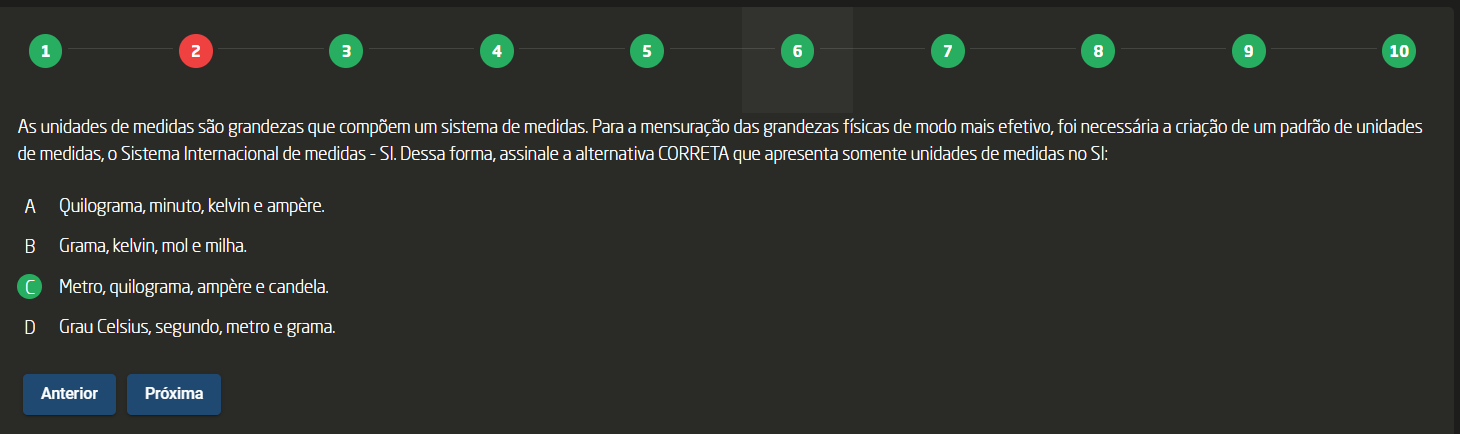 <p>1 2 3 4 5 6 7 8 10 As unidades de medidas são grandezas que compõem um sistema de medidas. Para a mensuração das grandezas físicas de modo mais efetivo, foi necessária a criação de um padrão de unidades de medidas, Sistema Internacional de medidas - SI. Dessa forma, assinale a alternativa CORRETA que apresenta somente unidades de medidas no SI: A Quilograma, minuto, kelvin e ampère. B Grama, kelvin, mol e milha. C Metro, quilograma, ampère e candela. D Grau Celsius, segundo, metro e grama. Anterior Próxima</p>