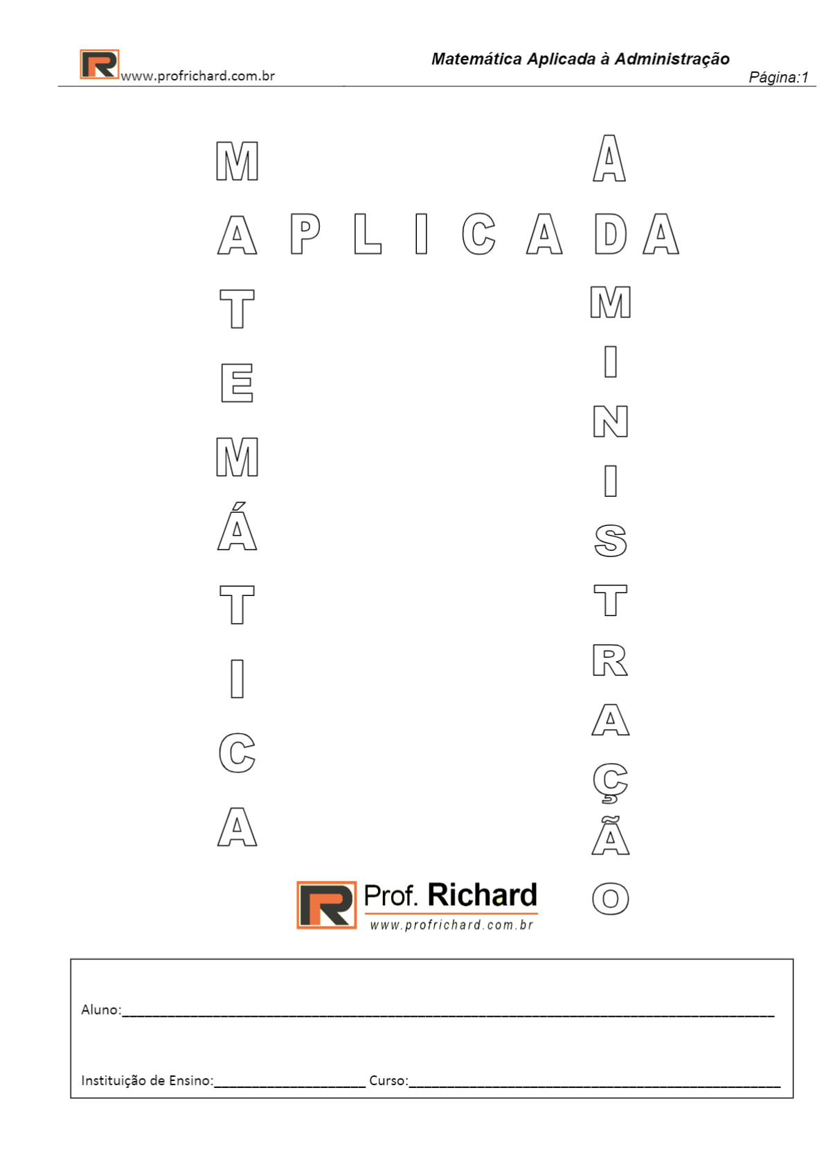<p>R Matemática Aplicada à Administração www.profrichard.com.br Página:1 APLICADA R Prof. Richard Aluno: Instituição de Ensino: Curso:</p><p>R Matemática Aplicada à Administração www.profrichard.com.br Página:2 INSTRUÇÕES GERAIS As provas são sempre individuais e sem consulta, valendo 10 (dez) pontos, sendo liberado uso de calculadora. Em dia de prova, os celulares devem ser desligados e guardados, o uso de aparelhos eletrônicos, materiais impressos e comunicação entre alunos durante a prova, acarretará em nota zero na mesma. As provas SUBSTITUTIVA e EXAME, envolvem toda a matéria do semestre. Os horários e datas de provas não serão alterados para situações individuais. Além das provas citadas anteriormente, não haverá trabalhos nem outras provas para ajudar na nota. "Existe um paralelismo fiel entre progresso social e a atividade matemática, os países socialmente atrasados são aqueles em que a atividade matemática é nula ou quase (Jacques Chapellon) "Um bom ensino da Matemática forma melhores hábitos de pensamento e habilita indivíduo a usar melhor a sua (Irene de Albuquerque) "O abandono da Matemática traz dano a todo conhecimento, pois aquele que a ignora não pode conhecer as outras ciências ou as coisas do mundo." (Roger Bacon) "Aqueles que estudam seriamente a matemática acabam tomados de uma espécie de paixão pela mesma." (Carl Friedrich Gauss) "Entre dois espíritos iguais, postos nas mesmas condições, aquele que sabe calcular é superior ao outro e adquire um vigor (Pascal) "Não há ramo da Matemática, por mais abstrato que seja, que não possa um dia vir a ser aplicado aos fenômenos do mundo real." (Lobachevsky) "Toda a educação científica que não se inicia com a Matemática é, naturalmente, imperfeita na sua base." (Auguste Conte)</p><p>R Matemática Aplicada à Administração www.profrichard.com.br Página:3 Módulo 0: Revisão de Funções Na educação básica (ensino fundamental e médio), aprendemos que quando um valor "y" depende de outro valor dizemos que "y" está em FUNÇÃO de "x". Por exemplo, dado a função y = 2 X determine o valor de y, quando: 1) X for igual a 1; 2) X for igual a 0; 3) X for igual a 2,5. Solução: 1) Quando X = 1, substituímos o X por 1 na função dada e temos: y = 2 1 = = 7. Ou seja, quando X for igual a 1, y será igual a 7. 2) Quando X = 0, substituímos o X por 0 na função dada e temos: y = 2 = 0 + 5 = 5. Ou seja, quando X for igual a 0, y será igual a 5. 3) Quando X = 2,5, substituímos o X por 2,5 na função dada e temos: y = 2 2,5 + 5 = 5 + 5 = 10. Ou seja, quando X for igual a 2,5, y será igual a 10. Pela resolução acima, percebemos que o valor de y, vai depender do valor atribuído a X, dessa forma, dizemos que o valor de y, está em FUNÇÃO do valor de X. No exemplo acima, também podemos fazer a operação inversa, ou seja, fornecer o valor de y e pedir o valor de X. Por exemplo, dado a função y = 2 determine o valor de X, quando: 4) y for igual a 7; 5) y for igual a 5; 6) y for igual a 10. Solução: 4) Quando y = 7, substituímos o y por 7 na função dada e temos: -2x 5 - 7 -2x = -2. Como queremos calcular o valor de X positivo e não o valor de X negativo, multiplicamos a equação por (-1), obtendo 2x = 2, logo X = 1. Ou seja, quando y for igual a 7, X será igual a 1. 5) Quando y=5, substituímos o y por 5 na função dada e temos: 5 = 2 X -2x = 5 -5 -2x = 0. Como queremos calcular o valor de X positivo e não o valor de X negativo, multiplicamos a equação -2x = 0, por (-1), obtendo 2x = 0, logo X = 0. Ou seja, quando y for igual a 5, X será igual a 0. 6) Quando y = 10, substituímos o y por 10 na função dada e temos: -2x = 5 -10 2x = -5. Como queremos calcular o valor de X positivo e não o valor de X negativo, multiplicamos a equação -2x = -5, por (-1), obtendo 2x = 5, logo X = 2,5. Ou seja, quando y for igual a 10, X será igual a 2,5. No estudo de funções, também podemos chamar "y" de "f(x)", ou seja, y = f(x), dessa forma a função y = 2 X + 5 também pode ser escrita, como f(x) = 2 X + 5. E, podemos ter exercícios como por exemplo: Dado a função f(x) = 2 X + 5, calcule: 7) f(1); 8) X, quando f(x) = 7. Solução: 7) Para calcular f(1), substituímos a letra na função f(x) = 2 X + 5 por 1, obtendo f(1) = 2 + 5 = 2 + 5 =</p><p>R Matemática Aplicada à Administração www.profrichard.com.br Página:4 8) Como o exercício fornece f(x) = 7, substituímos o f(x) da função f(x) = 2 X + 5 por 7, obtendo 7 = 2 X + 5 e calculamos o valor de X, da seguinte forma -2x -2x = -2, multiplicando a equação por -1, temos 2x = 2, logo X = 1. Na sequência, veremos exemplos de funções matemáticas, aplicadas ao curso de Administração. As funções que mais aparecem, são as do 1° grau, mas também podemos ter casos com funções quadráticas, funções exponenciais e funções logarítmicas. Exemplos aplicados ao curso de Administração: Dado a função q = 5000 + 200 p, onde q é a quantidade e p é o preço de determinado produto, calcule: 9) Qual a quantidade que será vendida, quando o preço for igual a ? 10) Para que o produtor consiga vender unidades, qual deverá ser o preço? Solução:9) Como o exercício forneceu que o preço é 5 reais, substituímos p (preço) por 5, na função dada, obtendo q = 5000 + 200 5 q = 5000 + 1000 = 6000 10) Como o exercício forneceu que a quantidade é 15 000 unidades, substituímos q (quantidade) por 000, na função dada, obtendo 000 = 5000 + 200 p 5 000 5000 = 200p 10 000 = 200p Observação: A função matemática acima é conhecida no curso de Administração, como função oferta e, pelos cálculos, concluímos que, quando o preço pago pelo mercado for R$ 5,00 a unidade, o produtor irá ofertar para venda 6000 unidades desse produto. Mas, se o preço de mercado for em torno de R$ 50,00, o produtor irá ofertar (colocar a venda) 15 000 unidades desse produto. Essa função oferta, será estudada em detalh