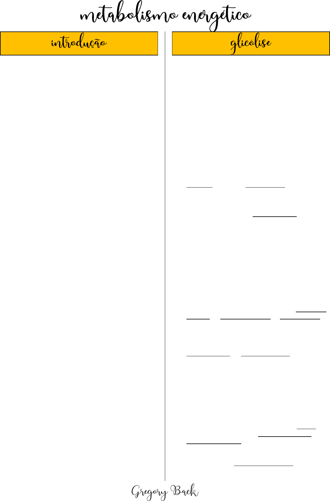 <p>BIOQUÍMICA</p><p>1</p><p> ANABO LISMO O U BIO SSÍNTESE:</p><p> Utiliza moléculas precursoras (aminoácidos,</p><p>monossacarídeos, ácidos graxos e bases</p><p>nitrogenadas) para transformá-las em</p><p>macromoléculas celulares (proteínas,</p><p>polissacarídeos, lipídeos e ácidos nucleicos), ou seja,</p><p>biomoléculas complexas são sintetizadas a partir de</p><p>reagentes mais simples</p><p> Processo divergente</p><p> EX: Gliconeogênese e Ciclo de Krebs</p><p> CATABO LISMO :</p><p> Moléculas complexas são degradadas e convertidas</p><p>em produtos menos complexos, a fim de utilizar os</p><p>produtos ou gerar energia</p><p> Processo convergente</p><p> EX: Glicólise, Ciclo de Krebs e lipólise</p><p> ANFIBO LISMO :</p><p> Agrega os processos convergentes e divergentes</p><p> Processo cíclico</p><p> EX: Ciclo de Krebs (ciclo do ácido cítrico)</p><p> Anabolismo e catabolismo são processos contínuos de</p><p>oxidação e redução, os quais formam produtos recicláveis</p><p> VIAS METABÓ LICAS:</p><p> Sequência de reações, as quais são catalisadas por</p><p>enzimas específicas</p><p> O produto de uma etapa da reação é o substrato que</p><p>será catalisado pela próxima enzima</p><p> Reguladas por enzimas reguladoras ou alostéricas ></p><p>moduladores positivos ou negativos</p><p> Ocorre feedbacks (retroalimentação) negativos e</p><p>positivos</p><p> São compartimentalizadas nas células eucarióticas</p><p> D-GLICO SE:</p><p> É a principal fonte energética no organismo humano,</p><p>pois possui oxidação rápida</p><p> Forma precursores de vias biossintéticas</p><p> É armazenada em forma de glicogênio nos músculos</p><p>e no fígado</p><p> É oxidada em piruvato (3C) pela glicólise ou ribose-5-</p><p>fosfato (RNA) pela via da pentose-fosfato</p><p> É utilizada para a biossíntese de polímeros estruturais</p><p>da matriz extracelular e de paredes celulares</p><p> Possui enzimas carreadoras específicas nas</p><p>membranas celulares, denominados GLUT, as quais</p><p>transportam glicose para o meio intracelular por</p><p>meio do processo de difusão facilitada</p><p> GLUT-1: eritrócitos (hemácias) e barreira</p><p>hemato-encefálica (cérebro)</p><p> GLUT-2: rim, fígado e células β do pâncreas</p><p> GLUT-3: neurônios e placenta</p><p> GLUT-4: músculos e tecido adiposo ></p><p>dependente de insulina</p><p> GLUT-5: intestino delgado</p><p> Não atravessa a membrana plasmática porque é uma</p><p>molécula grande e polar</p><p> O primeiro passo é captar a glicose extracelular por meio</p><p>das GLUTs e da secreção do hormônio insulina, o qual é</p><p>secretado de acordo com o aumento da concentração da</p><p>glicose no sangue</p><p> Ocorre no citosol celular</p><p> Composta por 10 reações e 2 fases</p><p> Pode ser aeróbica ou anaeróbica</p><p> Reações irreversíveis: 1, 3 e 10</p><p> Saldo líquido: 2 piruvatos + 2 NADH + 2 H+ + 2 ATP + 2 H2O</p><p> FASE PREPARATÓ RIA O U DE INVESTIMENTO :</p><p> Ocorre fosforilação da glicose e conversão desta em</p><p>gliceraldeído-3-fosfato</p><p> Não há geração de ATP mas, sim, gasto de 2 ATPs</p><p> D-frutose, D-manose e D-galactose também são</p><p>conversíveis em gliceraldeído-3-fosfato</p><p>1. Glicose é fosforilada no C6 e ativada por meio da enzima</p><p>hexocinase, formando a glicose-6-fosfato</p><p> Ocorre quebra de um ATP em ADP e participação do</p><p>cofator Mg2+</p><p> Reação reguladora de sentido único, que pode ser</p><p>revertida pela enzima glicose-6-fosfatase</p><p> Hexocinase I: cérebro, rins e fígado</p><p> Hexocinase II: músculo esquelético e fígado</p><p> Hexocinase III: ampla distribuição</p><p> Hexocinase IV ou glicocinase: fígado e células β do</p><p>pâncreas</p><p> A enzima hexocinase é inibida pela elevação da</p><p>concentração de glicose-6-fosfato e pela inibição da</p><p>enzima fosfofrutocinase; satura-se mais</p><p>rapidamente, pois possui menor Km</p><p> A enzima glicocinase não é inibida pela glicose-6-</p><p>fosfato e supre o cérebro e os músculos; metaboliza</p><p>maior quantidade de glicose, pois possui maior Km</p><p>2. Glicose-6-fosfato é convertida pela enzima fosfo-hexose</p><p>isomerase ou fosfoglico isomerase em frutose-6-fosfato</p><p> Ocorre a isomerização reversível de uma aldose em</p><p>uma cetose</p><p> Ocorre a participação do cofator Mg2+</p><p>3. Frutose-6-fosfato é fosforilada pela enzima</p><p>fosfofrutocinase-1 em frutose-1,6-bifosfato</p><p> Reação irreversível (sentido único)</p><p> Fosfofrutocinase-1 (PFK-1) é a principal enzima</p><p>reguladora da glicólise</p><p> PFK-1 é inibida por ATP, citrato e H+</p><p> PFK-1 é estimulada por ADP e AMP</p><p> Com a formação de frutose-1,6-bifosfato, o processo</p><p>continua até a formação de piruvato</p><p> Ocorre a quebra de um ATP em ADP e a participação</p><p>do cofator Mg2+</p><p>4. Frutose-1,6-bifosfato é clivada pela enzima aldolase em</p><p>trioses denominadas gliceraldeído-3-fosfato e</p><p>diidroxiacetona-fosfato</p><p> Apenas o gliceraldeído-3-fosfato segue para a fase de</p><p>pagamento</p><p> 5. A enzima triose-fosfato isomerase é capaz de</p><p>catalisar a interconversão reversível entre as trioses</p><p>Gregory Back</p><p>2</p><p> FASE DE PAGAMENTO :</p><p> Ocorre a oxidação do gliceraldeído-3-fosfato em</p><p>piruvato e a formação acoplada de ATP e NADH</p><p> Para cada molécula de glicose, entram na fase de</p><p>pagamento duas moléculas de gliceraldeído-3-</p><p>fosfato</p><p> Paga-se os 2 ATPs utilizados na fase preparatória e</p><p>gera-se 2 ATPs e 2 NADH+H+ líquidos</p><p>6. (2) Gliceraldeído-3-fosfato é oxidado pela enzima</p><p>gliceraldeído-3-fosfato desidrogenase em (2) 1,3-</p><p>bifosfoglicerato</p><p> Cada molécula de gliceraldeído-3-fosfato recebe um</p><p>fósforo inorgânico (Pi)</p><p> Ocorre a formação de 2 moléculas reduzidas de</p><p>NADH+H+, em que cada uma será convertida e