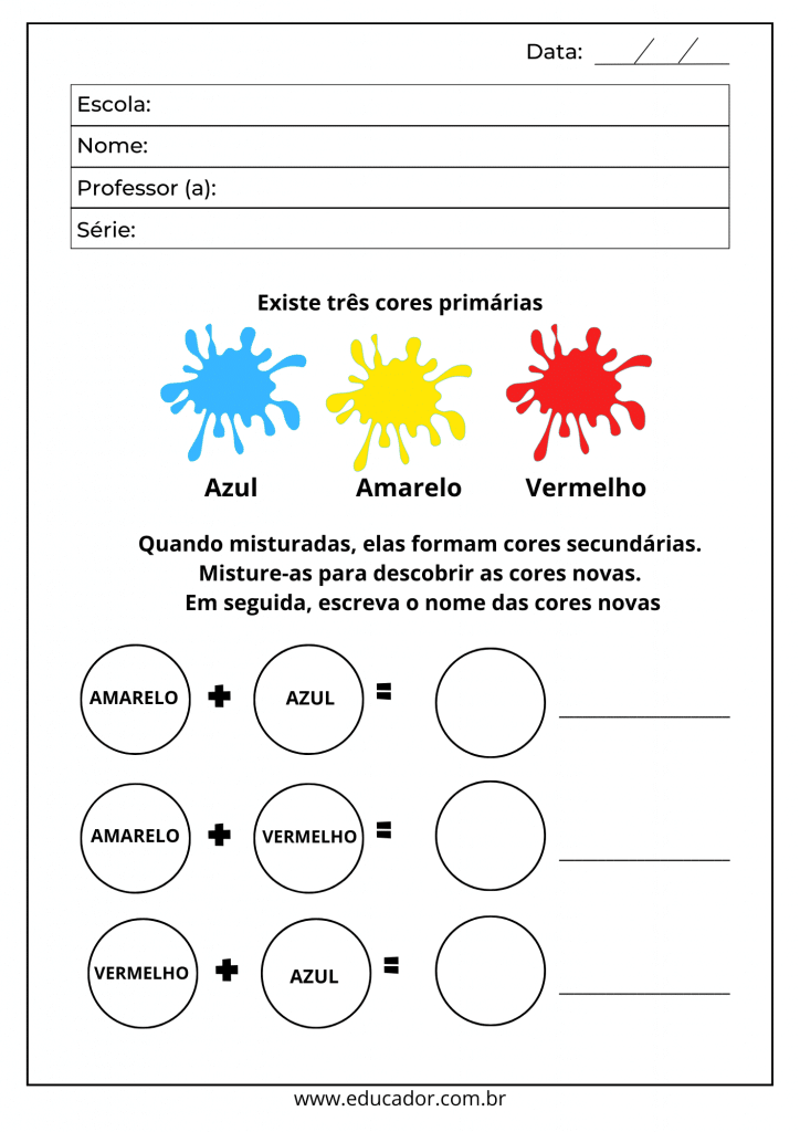 <p>Data: / / Escola: Nome: Professor (a): Série: Existe três cores primárias Azul Amarelo Vermelho Quando misturadas, elas formam cores secundárias. Misture-as para descobrir as cores novas. Em seguida, escreva o nome das cores novas AMARELO AZUL = AMARELO VERMELHO = VERMELHO = AZUL www.educador.com.br</p>