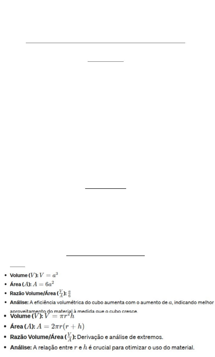<p>Nome da Prática: Análise Geométrica e Eficiência de Sólidos</p><p>Nome do Aluno:</p><p>ANÁLISE GEOMÉTRICA E EFICIÊNCIA DE SÓLIDOS</p><p>1. Introdução</p><p>Este estudo examina minuciosamente como o tamanho e as proporções dos sólidos geométricos clássicos, como cubos, cilindros, cones, pirâmides quadrangulares e esferas, influenciam suas propriedades fundamentais, como volume, área superficial e a relação entre volume e área. O objetivo central é descobrir como mudanças nas dimensões desses sólidos afetam suas características geométricas distintas. Essa análise visa identificar as configurações mais eficientes, otimizando assim o uso dessas formas em diferentes aplicações de engenharia. Isso pode resultar em projetos técnicos mais eficazes e na melhor utilização dos recursos disponíveis.</p><p>2. Metodologia</p><p>Utilizamos o método de cálculo diferencial para derivar e examinar as fórmulas de volume e área. Nossa abordagem proporcionou uma compreensão aprofundada dos conceitos, enfatizando as relações entre derivadas e taxas de variação.</p><p>3. Análise dos Resultados</p><p>3.1 Cubo</p><p>3.2 Cilindro</p><p>3.3 Cone</p><p>3.4 Pirâmide Quadrangular</p><p>3.5 Esfera</p><p>4. Conclusão</p><p>Os resultados destacam como é crucial levar em conta as formas dos objetos ao otimizar suas características geométricas para usos práticos, como no design de embalagens e estruturas. Ao analisar a relação entre o volume e a área superficial, obtemos informações valiosas para determinar qual forma sólida é a mais eficiente para diferentes aplicações.</p><p>5. Referencias</p><p>5.1 Moretti, A.C. Fundamentos de Matemática Elementar: Geometria Espacial. São Paulo: Editora Ciência Moderna, 2019.</p><p>5.2 Apostol, T.M. (1967). Calculus, Vol. 1: One-Variable calculus, with an introduction to Linear Algebra. Wiley.</p><p>5.3 Instituto Nacional de Matemática Pura e Aplicada (IMPA). Cálculo Diferencial e integral. Rio de janeiro: IMPA, 2020</p><p>image1.png</p><p>image2.png</p><p>image3.png</p><p>image4.png</p><p>image5.png</p>