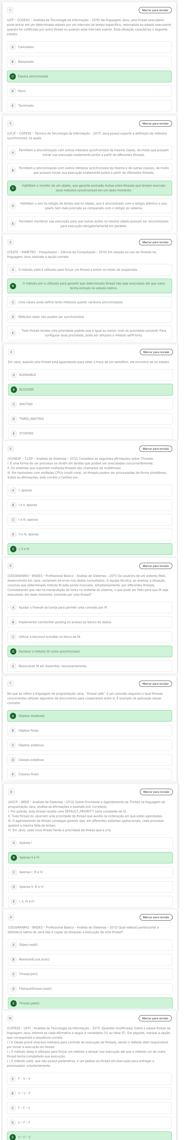 <p>1 (UFF COSEAC Analista Tecnologia 2015) Na linguagem Java uma executável estado tempo estado executável quando notificada po outra thread ou quando esse expirar Essa situação caracteriza seguinte estado A Cancelado B Bloqueado Espera sincronizada D Novo F Terminado 2 COPESE Tecnologia Java suport synchronized com com outros métodos classe que que possam classe de A execução juntos diferentes threads Permitem con outros synchronized mesma classes modo B que possam inicia sua execução partir diferentes threads Habilitam monitor objeto que garante exclusão threads que executar c seus métodos synchronize dado momento Habilitam objeto que sincronizado com que, D assim assin tem mais comparad com relógio sistema Permiten monitora sua execução para que outras mesmo objeto ser sincronizadas E para paralelo 3 revisão INMETRO Pesquisador Ciência da Computação 2010 En relação threads na linguagem Java assinale opção correta: A yield utilizado para força thread entra modo suspensão join utilizado para garantir que que determinado thread não seja executado ate que outro Uma classe pode definir tanto métodos quanto D static podem synchronized um prioridade que menor nive possível Para E configura essa pode utilizado setPriority 4 Marca Em esta par par a trava un estado RUNNABLE BLOCKED WAITING D TIMED_WAITING E STOPPED 5 Marcar para revisão TJ/SP Analista Sistemas 2012 Consider seguintes afirmações sobre Threads m tarefas podem Os sistemas que threads são (multi-core) threads podem processadas forma Sobre afirmações A B apenas apenas D apenas E 6 BNDES Profissional Sistemas 2011 Os usuários Web sistema e erros dados equipe concluiu método invocado que Consider locks executado em em somente por uma thread? A Ajusta firewal borda para uma conexão B connection pooling no acesso banco dados Utilizar lockable no bloco D come synchronized E Reescrever Assembly necessariamente 7 Marcar No que se refere programação Java segundo qual threads utilizan sincronism aplicação desse conceito A Objetos mutáveis B Objetos finais Objetos D Classes E Classes finals 8 Marcar (AOCP BRDE Analista Sistemas 2012 Sobre Prioridade Agendamento de Thread linguagem de Java Java analise afirmações correta(s) padrão thread DEFAULT que que estão agendadas thread conseque garanti que em diferentes sistemas op cada processo mesma fatia herda prioridade cria Apenas Apenas D Apenas E 9 Marcar para revisão (CESGRANRIO BNDES Profissional Básico Analise Sistemas método de bloquear execução de A B ReentrantLock lock() Thread.join() D read() E Thread.yield() 10 Marcar para revisão (COPESE UFPI Analista Tecnologia Sobre a classe thread da verdadeira (V) falsa (F) seguida, marque opção correta ... classe classe métodos execução threads sendo método star responsável thread forca um sua execução até que run de outra execução método yield pedido thread en execução para processador voluntariamente A F-V-V V-V-F</p>