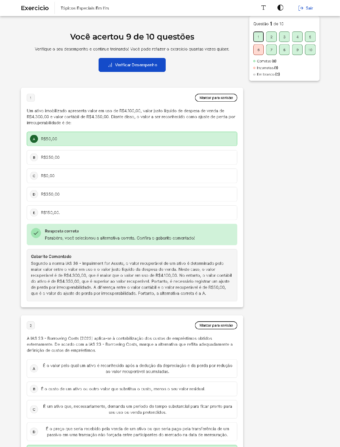 <p>Exercicio Tópicos Especiais Em Ifrs T D Sair Questão 1 de 10 Você acertou 9 de 10 questões 1 2 3 4 5 Verifique o seu desempenho e continue treinando! Você pode refazer o exercício quantas vezes quiser. 6 7 8 10 Corretas (9) Verificar Desempenho Incorretas (1) Em branco 1 Marcar para revisão Um ativo imobilizado apresenta valor em uso de R$4.100,00, valor justo líquido de despesa de venda de R$4.300,00 e valor contábil de Diante disso, valor a ser reconhecido como ajuste de perda por irrecuperabilidade é de: A R$50,00 B R$250,00 C R$0,00 D R$350,00 E Resposta correta Parabéns, você selecionou a alternativa correta. Confira o gabarito comentado! Gabarito Comentado Segundo a norma IAS 36 - Impairment for Assets, valor recuperável de um ativo é determinado pelo maior valor entre o valor em uso e o valor justo líquido da despesa de venda. Neste caso, o valor recuperável é de R$4.300,00, que é maior que o valor em uso de R$4.100,00. No entanto, o valor contábil do ativo é de que é superior ao valor Portanto, é necessário registrar um ajuste de perda por irrecuperabilidade. A diferença entre o valor contábil e valor recuperável é de R$50,00, que é o valor do ajuste de perda por irrecuperabilidade. Portanto, a alternativa correta é a A. 2 Marcar para revisão A IAS 23 Borrowing Costs (2022) aplica-se à contabilização dos custos de empréstimos obtidos externamente. De acordo com a IAS 23 Borrowing Costs, marque a alternativa que reflita adequadamente a definição de custos de empréstimos. É valor pelo qual um ativo é reconhecido após a dedução da depreciação e da perda por redução A ao valor recuperável acumuladas. B É custo de um ativo ou outro valor que substitua custo, menos seu valor residual. É um ativo que, necessariamente, demanda um período de tempo substancial para ficar pronto para C seu uso ou venda pretendidos. É preço que seria recebido pela venda de um ativo ou que seria pago pela transferência de um D passivo em uma transação não forçada entre participantes do mercado na data de mensuração.</p><p>E São juros e outros custos que a entidade incorre em conexão com empréstimo de recursos. Resposta correta Parabéns, você selecionou a alternativa correta. Confira o gabarito comentado! Gabarito Comentado Conforme a norma IAS 23 Borrowing Costs, os custos de empréstimos são definidos como os juros e outros custos que a entidade tem que arcar em relação ao empréstimo de recursos. Esses custos podem incluir, por exemplo, juros sobre descobertos bancários e empréstimos, amortizações de descontos ou prêmios relacionados a empréstimos e custos de financiamento de arrendamentos financeiros. Portanto, a alternativa E está correta, pois reflete adequadamente essa definição 3 Marcar para revisão A empresa ABC tem plantações de árvores de café no sul do Estado da Bahia. o café colhido é avaliado pelo valor justo menos despesas de venda e contabilizado no estoque, no grupo do Ativo Circulante no Balanço Patrimonial. No final do exercício social, o valor contábil do estoque de café era R$31.000,00 e o seu valor justo menos despesas de venda era estoque de café seria registrado na escrituração mercantil da empresa ABC no final do exercício social pelo valor de: A R$33.000,00, com reconhecimento de uma perda de R$2.000,00 no resultado B R$31.000,00, com reconhecimento de uma perda de R$2.000,00 no resultado C R$33.000,00, com reconhecimento de um ganho de R$2.000,00 no resultado D R$31.000,00, com reconhecimento de um ganho de R$2.000,00 no resultado E Resposta correta Parabéns, você selecionou a alternativa correta. Confira o gabarito comentado! Gabarito Comentado Segundo a norma IAS 2 Inventories, valor contábil do estoque de produtos agrícolas deve ser mensurado pelo custo histórico ou pelo valor realizável líquido, prevalecendo menor entre os Neste caso, o valor contábil do estoque de café é R$31.000,00, que é menor que valor justo menos as despesas de venda, que é R$33.000,00. Portanto, de acordo com a norma, estoque de café deve ser registrado pelo valor de R$31.000,00, que é o menor valor. 4 Marcar para revisão No que se refere à IAS 41 Agriculture, a entidade é encorajada a fornecer uma descrição da quantidade de cada grupo de ativos biológicos, distinguindo entre consumíveis e de produção ou entre maduros e imaturos, conforme apropriado. Com base nessa informação e considerando a IAS 41 Agriculture, são exemplos de ativos biológicos consumíveis, EXCETO: A Plantações de milho e trigo. B Árvores para a produção de madeira C Rebanhos de animais mantidos para a produção de carne</p><p>Piantas portagoras para por mais ge um periodo E Plantações de Resposta correta Parabéns, você selecionou a alternativa correta. Confira gabarito comentado! Gabarito Comentado Os ativos biológicos consumíveis são aqueles que podem ser colhidos como produto agrícola ou vendidos como ativos biológicos. Alguns exemplos desses ativos são os rebanhos de animais mantidos para a produção de carne, rebanhos mantidos para venda, produção de peixe, plantações de milho e trigo, produto de planta portadora e árvores para a produção de madeira. No entanto. as plantas portadoras mantidas para produzirem frutos por mais de um período não se enquadram nessa categoria, pois elas não são consumidas ou vendidas após a colheita, mas continuam a produzir ao longo de vários períodos. Portanto, a alternativa D é a correta. 5 Marcar para revisão Uma Sociedade Empresária tem como atividade principal a produção e a comercialização de milho. Essa sociedade também desenvolve, em menor escala, atividade de comercialização de fubá, canjica, amido e todos resultantes do processamento do milho colhido. Sabe-se que, ao encerrar último exercício social, faziam parte dos Ativos dessa sociedade e estavam registrados em seu Balanço Uma lavoura de milho no ponto de colheita; 120 toneladas 