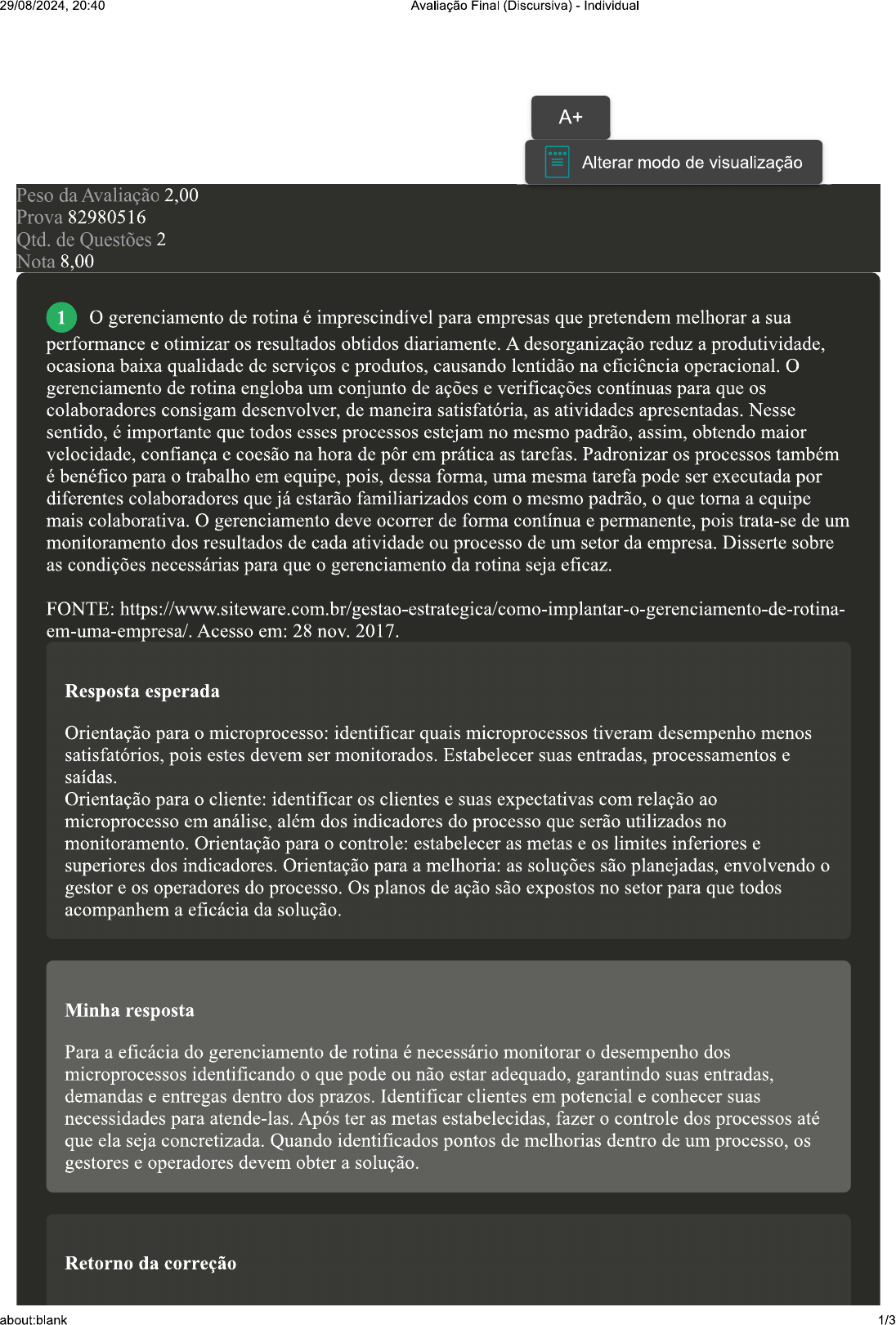 <p>20:40 Avaliação Final (Discursiva) Individual A+ Alterar modo de visualização Peso da Avaliação 2,00 Prova 82980516 Qtd. de Questões 2 Nota 8,00 1 O gerenciamento de rotina é imprescindível para empresas que pretendem melhorar a sua performance e otimizar os resultados obtidos diariamente. A desorganização reduz a produtividade, ocasiona baixa qualidade de serviços e produtos, causando lentidão na eficiência operacional. O gerenciamento de rotina engloba um conjunto de ações e verificações contínuas para que os colaboradores consigam desenvolver, de maneira satisfatória, as atividades apresentadas. Nesse sentido, é importante que todos esses processos estejam no mesmo padrão, assim, obtendo maior velocidade, confiança e coesão na hora de pôr em prática as tarefas. Padronizar os processos também é benéfico para trabalho em equipe, pois, dessa forma, uma mesma tarefa pode ser executada por diferentes colaboradores que já estarão familiarizados com mesmo padrão, que torna a equipe mais colaborativa. O gerenciamento deve ocorrer de forma contínua e permanente, pois trata-se de um monitoramento dos resultados de cada atividade ou processo de um setor da empresa. Disserte sobre as condições necessárias para que gerenciamento da rotina seja eficaz. FONTE: Acesso em: 28 nov. 2017. Resposta esperada Orientação para microprocesso: identificar quais microprocessos tiveram desempenho menos satisfatórios, pois estes devem ser monitorados. Estabelecer suas entradas, processamentos e saídas. Orientação para cliente: identificar os clientes e suas expectativas com relação ao microprocesso em análise, além dos indicadores do processo que serão utilizados no monitoramento. Orientação para controle: estabelecer as metas e os limites inferiores e superiores dos indicadores. Orientação para a melhoria: as soluções são planejadas, envolvendo gestor e os operadores do processo. Os planos de ação são expostos no setor para que todos acompanhem a eficácia da solução. Minha resposta Para a eficácia do gerenciamento de rotina é necessário monitorar desempenho dos microprocessos identificando que pode ou não estar adequado, garantindo suas entradas, demandas e entregas dentro dos prazos. Identificar clientes em potencial e conhecer suas necessidades para atende-las. Após ter as metas estabelecidas, fazer controle dos processos até que ela seja concretizada. Quando identificados pontos de melhorias dentro de um processo, os gestores e operadores devem obter a solução. Retorno da correção about:blank 1/3</p><p>29/08/2024, 20:40 Avaliação Final (Discursiva) Individual Prezado acadêmico, sua resposta contemplou alguns dos elementos da questão com base nos materiais disponibilizados, porém, poderia ter explorado mais os conteúdos fundamentais da disciplina) 2 Segundo Juran (2009), existem várias formas para classificar as necessidades dos clientes; são elas: sempre perguntar por que cliente está comprando este produto ou serviço e qual necessidade ele está buscando suprir. Dessa forma, além de vender produto ou serviço, estaremos, também, atendendo às necessidades intrínsecas do nosso cliente. As necessidades humanas podem ser classificadas quanto às: necessidades declaradas e reais; necessidades percebidas; necessidades culturais; necessidades em função de usos inesperados. Disserte sobre cada uma dessas necessidades, contemplando os detalhes e a importância de distingui-las em cada segmento de atividade industrial. FONTE: JURAN, J. M. A qualidade desde projeto: novos passos para planejamento da qualidade em produtos e serviços. São Paulo: Cengage Learning, 2009. Resposta esperada Necessidade declarada e necessidade real: é quando nosso cliente declara suas necessidades em termos bem específicos, conforme os bens que ele deseja adquirir, contudo, precisamos buscar sempre entender qual necessidade real ele busca atender com tal produto ou serviço. Necessidades percebidas: cliente declara sua necessidade se baseando em suas percepções e, geralmente, estas percepções estão ligadas ao produto. Contudo, é muito comum ocorrer uma diferença entre a percepção do cliente e a do fornecedor. Necessidades culturais: em qualquer tipo de organização empresarial, em que existirem processos para transformação de produtos e serviços aos clientes externos, existe cliente interno. Cliente interno pode ser desde seu colega de trabalho, como também da alta direção, ou pessoas de áreas de apoio. Além disso, temos os processos internos, em que cada qual executa sua etapa e repassa para a fase seguinte, ou seja, para seu cliente interno. Necessidades em função de usos inesperados: não raramente falhas de qualidade nos produtos, são causadas por uso inadequado por parte dos clientes. Desta forma, é defendido um estreitamento entre a equipe de desenvolvimento de produtos, processos e serviços das empresas com os seus clientes, principalmente para entender uso real destes produtos e serviços por parte do cliente. Negligenciar desejo real do cliente pode ter sérias consequências. Independente do seu ramo de atividade, é imprescindível comunicar-se com seus clientes, não menosprezando-o, pois negócio depende Minha resposta Necessidades declaradas e reais: é quando cliente declara que ele quer um produto ou serviço, mas é necessário entender qual a necessidade dele, por exemplo ele quer um celular para trabalho que seja barato apenas para ligações e mensagens WhatsApp. Necessidades percebidas: É a percepção que cliente tem pelo produto. Por exemplo ao ir em uma panificadora temos a prateleira com pães já embalados, e no balcão a atendente tem os mesmos pães, porém, apenas expostos sem embalagens. Na percepção do cliente pão do balcão é mais fresco. Necessidades culturais: Nas organizações existem os clientes internos e externos, os clientes internos são os colaboradores e até mesmo os os diretores.