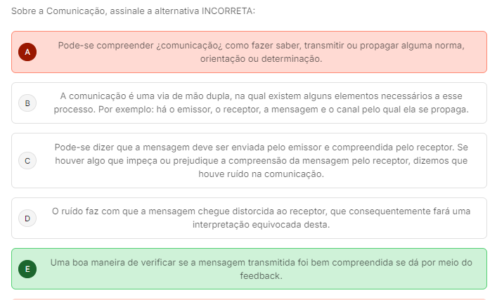 <p>Sobre a Comunicação, assinale a alternativa INCORRETA: Pode-se compreender como fazer saber, transmitir ou propagar alguma norma, A orientação ou determinação. A comunicação é uma via de mão dupla, na qual existem alguns elementos necessários a esse B processo. Por exemplo: há O emissor, receptor, a mensagem e O canal pelo qual ela se propaga. Pode-se dizer que a mensagem deve ser enviada pelo emissor e compreendida pelo receptor. Se C houver algo que impeça ou prejudique a compreensão da mensagem pelo receptor, dizemos que houve ruido na comunicação. faz com que a mensagem chegue distorcida ao receptor, que consequentemente fará uma D interpretação equivocada desta. Uma boa maneira de verificar se a mensagem transmitida foi bem compreendida se dá por meio do E feedback.</p>