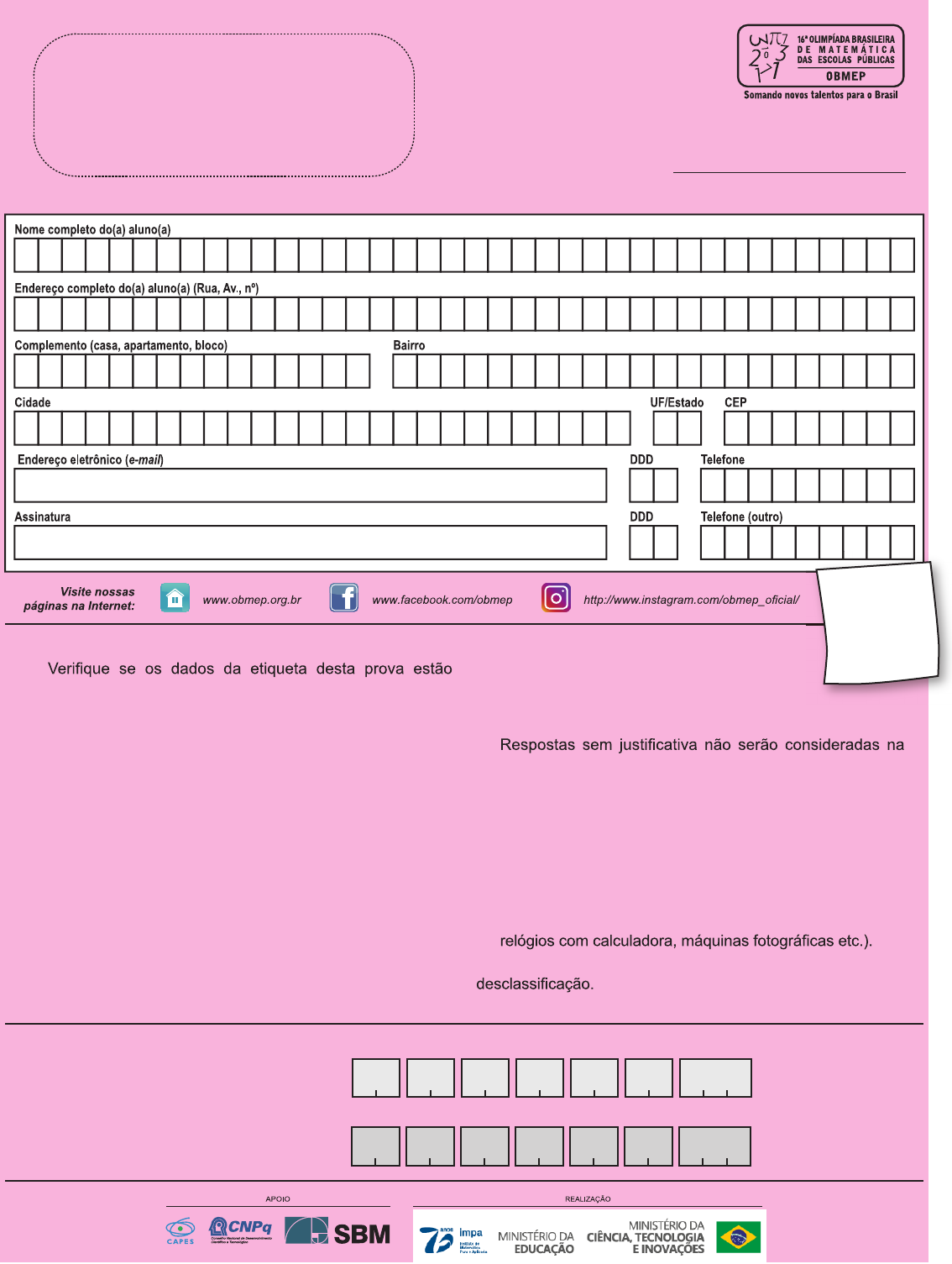 <p>2ª FASE – 06 de novembro de 2021</p><p>Nível 2</p><p>8º e 9º anos do Ensino Fundamental</p><p>Cole aqui a etiqueta com os dados do aluno.</p><p>Preencha</p><p>e confira</p><p>os dados</p><p>acima com</p><p>muita atenção!</p><p>Correção Regional</p><p>1</p><p>CR</p><p>2</p><p>CR</p><p>3</p><p>CR</p><p>4</p><p>CR</p><p>5</p><p>CR</p><p>6</p><p>CR</p><p>Total</p><p>CR</p><p>Correção Nacional</p><p>1</p><p>CN</p><p>2</p><p>CN</p><p>3</p><p>CN</p><p>4</p><p>CN</p><p>5</p><p>CN</p><p>6</p><p>CN</p><p>Total</p><p>CN</p><p>INSTRUÇÕES</p><p>1.</p><p>corretos. Caso as informações não estejam corretas,</p><p>comunique o erro ao aplicador imediatamente.</p><p>2. Preencha cuidadosamente todos os seus dados no</p><p>quadro acima. Utilize letra de forma, colocando uma letra/</p><p>dígito em cada quadradinho e deixando um espaço em</p><p>branco entre cada palavra.</p><p>3. Lembre-se de assinar o quadro acima e a lista de</p><p>presença.</p><p>4. A prova pode ser feita a lápis ou a caneta.</p><p>5. A duração da prova é de 3 horas. Você só poderá deixar</p><p>a sala de prova 45 minutos após o início da prova. Ao</p><p>terminar a prova, entregue-a ao aplicador.</p><p>6. A solução de cada questão deve ser escrita na página</p><p>reservada para ela, de maneira organizada e legível.</p><p>Evite escrever as soluções na folha de rascunho.</p><p>7. Na correção serão considerados todos os raciocínios</p><p>que você apresentar. Tente resolver o</p><p>maior número possível de itens de todas as</p><p>questões, principalmente o item (a) de cada</p><p>questão.</p><p>8.</p><p>correção.</p><p>9. Não escreva nos espaços sombreados.</p><p>10. Não é permitido:</p><p>a. usar instrumentos de desenho, calculadoras ou</p><p>qualquer fonte de consulta;</p><p>b. comunicar-se com outras pessoas, além do aplicador</p><p>de provas;</p><p>c. usar quaisquer aparelhos eletrônicos (celulares, tablets,</p><p>O não cumprimento dessas regras resultará em sua</p><p>Boa prova!</p><p>TOTAL CR CN</p><p>NÍVEL 2 Respostas sem justificativa não serão consideradas.2</p><p>1. Gabriel gosta de preencher</p><p>quadriculados 3 × 3 com números</p><p>de forma que quaisquer três deles,</p><p>alinhados na horizontal, vertical</p><p>ou diagonal, tenham a seguinte</p><p>propriedade: o número central deve</p><p>ser a média aritmética dos seus dois</p><p>vizinhos.</p><p>Complete o preenchimento do quadriculado abaixo, iniciado por Gabriel. a)</p><p>CR CN</p><p>CR CN</p><p>Preencha o quadriculado abaixo seguindo a mesma instrução indicada anteriormente. b)</p><p>c) Qual será a soma dos nove números do quadriculado abaixo após Gabriel terminar de preenchê-lo?</p><p>CR CN</p><p>2</p><p>10</p><p>14</p><p>7</p><p>9</p><p>20</p><p>14 30</p><p>19 11 11 =</p><p>14 =</p><p>17 =</p><p>1422</p><p>3</p><p>6</p><p>1725 9 25 + 9</p><p>2</p><p>22 + 6</p><p>2</p><p>19 + 3</p><p>2 22 =</p><p>14 =</p><p>6 = 3 + 9</p><p>2</p><p>11 + 17</p><p>2</p><p>19 + 25</p><p>2</p><p>14 = 25 + 3</p><p>2</p><p>14 = 19 + 9</p><p>2</p><p>2</p><p>10</p><p>14</p><p>7</p><p>9</p><p>20</p><p>14 30</p><p>19 11 11 =</p><p>14 =</p><p>17 =</p><p>1422</p><p>3</p><p>6</p><p>1725 9 25 + 9</p><p>2</p><p>22 + 6</p><p>2</p><p>19 + 3</p><p>2 22 =</p><p>14 =</p><p>6 = 3 + 9</p><p>2</p><p>11 + 17</p><p>2</p><p>19 + 25</p><p>2</p><p>14 = 25 + 3</p><p>2</p><p>14 = 19 + 9</p><p>2</p><p>2</p><p>10</p><p>14</p><p>7</p><p>9</p><p>20</p><p>14 30</p><p>19 11 11 =</p><p>14 =</p><p>17 =</p><p>1422</p><p>3</p><p>6</p><p>1725 9 25 + 9</p><p>2</p><p>22 + 6</p><p>2</p><p>19 + 3</p><p>2 22 =</p><p>14 =</p><p>6 = 3 + 9</p><p>2</p><p>11 + 17</p><p>2</p><p>19 + 25</p><p>2</p><p>14 = 25 + 3</p><p>2</p><p>14 = 19 + 9</p><p>2</p><p>2</p><p>10</p><p>14</p><p>7</p><p>9</p><p>20</p><p>14 30</p><p>19 11 11 =</p><p>14 =</p><p>17 =</p><p>1422</p><p>3</p><p>6</p><p>1725 9 25 + 9</p><p>2</p><p>22 + 6</p><p>2</p><p>19 + 3</p><p>2 22 =</p><p>14 =</p><p>6 = 3 + 9</p><p>2</p><p>11 + 17</p><p>2</p><p>19 + 25</p><p>2</p><p>14 = 25 + 3</p><p>2</p><p>14 = 19 + 9</p><p>2</p><p>TOTAL CR CN</p><p>NÍVEL 2Respostas sem justificativa não serão consideradas. 3</p><p>2.</p><p>CR CN</p><p>CR CN</p><p>Em quantas divisões Joãozinho obteve como resultado um número maior do que 0,5?b)</p><p>c) Quantos resultados diferentes foram obtidos por Joãozinho?</p><p>CR CN</p><p>Joãozinho fez todas as divisões possíveis com dois números diferentes pertencentes ao conjunto</p><p>Em quantas divisões Joãozinho obteve como resultado um número inteiro?a)</p><p>2</p><p>5</p><p>5</p><p>2como resultado 0,4) e (obteve como resultado 2,5).</p><p>{1, 2, 3, 4, 5, 6, 7, 8, 9}. Por exemplo, com os números 2 e 5, ele fez as seguintes divisões: (obteve</p><p>TOTAL CR CN</p><p>NÍVEL 2 Respostas sem justificativa não serão consideradas.4</p><p>Julieta calcula as somas do tipo 9 + 99 + 999 + ⋯ + 999⋯93.</p><p>Calcule a soma 9 + 99 + 999 + ⋯ + 999⋯9a)</p><p>CR CN</p><p>CR CN</p><p>Quantos algarismos 0 há no resultado da soma 9 + 99 + 999 + ⋯ + 999⋯9 ? b)</p><p>c) Explique por que a maneira como Julieta calcula essas somas é correta.</p><p>CR CN</p><p>da seguinte maneira: ela pensa no número 111⋯1 ,</p><p>da mesma maneira que Julieta.</p><p>n “noves”</p><p>n “uns”</p><p>7 “noves”</p><p>2021 “noves”</p><p>multiplica-o por 10 e subtrai n.</p><p>Por exemplo,</p><p>9 + 99 + 999 + 9999 + 99999 = 11111 0 – 5 = 111105.</p><p>5 “uns”</p><p>TOTAL CR CN</p><p>NÍVEL 2Respostas sem justificativa não serão consideradas. 5</p><p>Maria pinta, em seu caderno, fi guras formadas por trapézios</p><p>e hexágonos. Cada hexágono pode ser pintado de azul, bege</p><p>ou cinza, e cada trapézio, de azul ou preto. Polígonos com um</p><p>lado em comum não podem ter a mesma cor. A fi gura ao lado é</p><p>um exemplo de uma pintura feita por Maria.</p><p>4.</p><p>De quantas maneiras Maria pode pintar a fi gura abaixo?a)</p><p>CR CN</p><p>CR CN</p><p>De quantas maneiras Maria pode 
