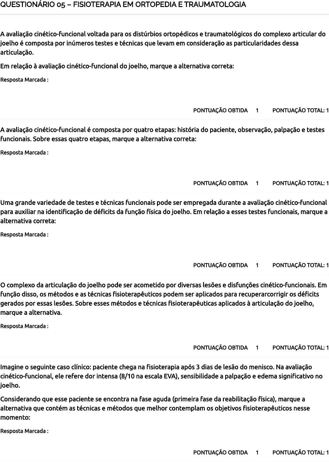 <p>QUESTIONÁRIO 05 – FISIOTERAPIA EM ORTOPEDIA E TRAUMATOLOGIA</p><p>PONTUAÇÃO TOTAL: 1PONTUAÇÃO OBTIDA 1</p><p>A avaliação cinético-funcional voltada para os distúrbios ortopédicos e traumatológicos do complexo articular do</p><p>joelho é composta por inúmeros testes e técnicas que levam em consideração as particularidades dessa</p><p>articulação.</p><p>Em relação à avaliação cinético-funcional do joelho, marque a alternativa correta:</p><p>Resposta Marcada :</p><p>Esse momento exige que o �sioterapeuta tenha domínio sobre os conhecimentos da anatomia humana e</p><p>biomecânica.</p><p>PONTUAÇÃO TOTAL: 1PONTUAÇÃO OBTIDA 1</p><p>A avaliação cinético-funcional é composta por quatro etapas: história do paciente, observação, palpação e testes</p><p>funcionais. Sobre essas quatro etapas, marque a alternativa correta:</p><p>Resposta Marcada :</p><p>Exemplos dos testes funcionais do joelho são: testes patelares e avaliação da circunferência para tro�smo</p><p>muscular e edema articular.</p><p>PONTUAÇÃO TOTAL: 1PONTUAÇÃO OBTIDA 1</p><p>Uma grande variedade de testes e técnicas funcionais pode ser empregada durante a avaliação cinético-funcional</p><p>para auxiliar na identi�cação de dé�cits da função física do joelho. Em relação a esses testes funcionais, marque a</p><p>alternativa correta:</p><p>Resposta Marcada :</p><p>Os testes de re�exos do joelho incluem: tendão patelar e isquiotibiais mediais, além dos dermátomos</p><p>correspondentes.</p><p>PONTUAÇÃO TOTAL: 1PONTUAÇÃO OBTIDA 1</p><p>O complexo da articulação do joelho pode ser acometido por diversas lesões e disfunções cinético-funcionais. Em</p><p>função disso, os métodos e as técnicas �sioterapêuticos podem ser aplicados para recuperarcorrigir os dé�cits</p><p>gerados por essas lesões. Sobre esses métodos e técnicas �sioterapêuticas aplicados à articulação do joelho,</p><p>marque a alternativa.</p><p>Resposta Marcada :</p><p>O ultrassom e o laser favorecem a cicatrização e controlam o edema e a dor.</p><p>PONTUAÇÃO TOTAL: 1PONTUAÇÃO OBTIDA 1</p><p>Imagine o seguinte caso clínico: paciente chega na �sioterapia após 3 dias de lesão do menisco. Na avaliação</p><p>cinético-funcional, ele refere dor intensa (8/10 na escala EVA), sensibilidade a palpação e edema signi�cativo no</p><p>joelho.</p><p>Considerando que esse paciente se encontra na fase aguda (primeira fase da reabilitação física), marque a</p><p>alternativa que contém as técnicas e métodos que melhor contemplam os objetivos �sioterapêuticos nesse</p><p>momento:</p><p>Resposta Marcada :</p><p>TENS, corrente interferencial, crioterapia, laser e ultrassom.</p><p>29/08/2024, 10:07 Course Status – AVA Saúde Unifaveni</p><p>https://ava.saude.unifaveni.com.br/course-status/ 1/2</p><p>5 / 5Total de Pontos</p><p>29/08/2024, 10:07 Course Status – AVA Saúde Unifaveni</p><p>https://ava.saude.unifaveni.com.br/course-status/ 2/2</p>