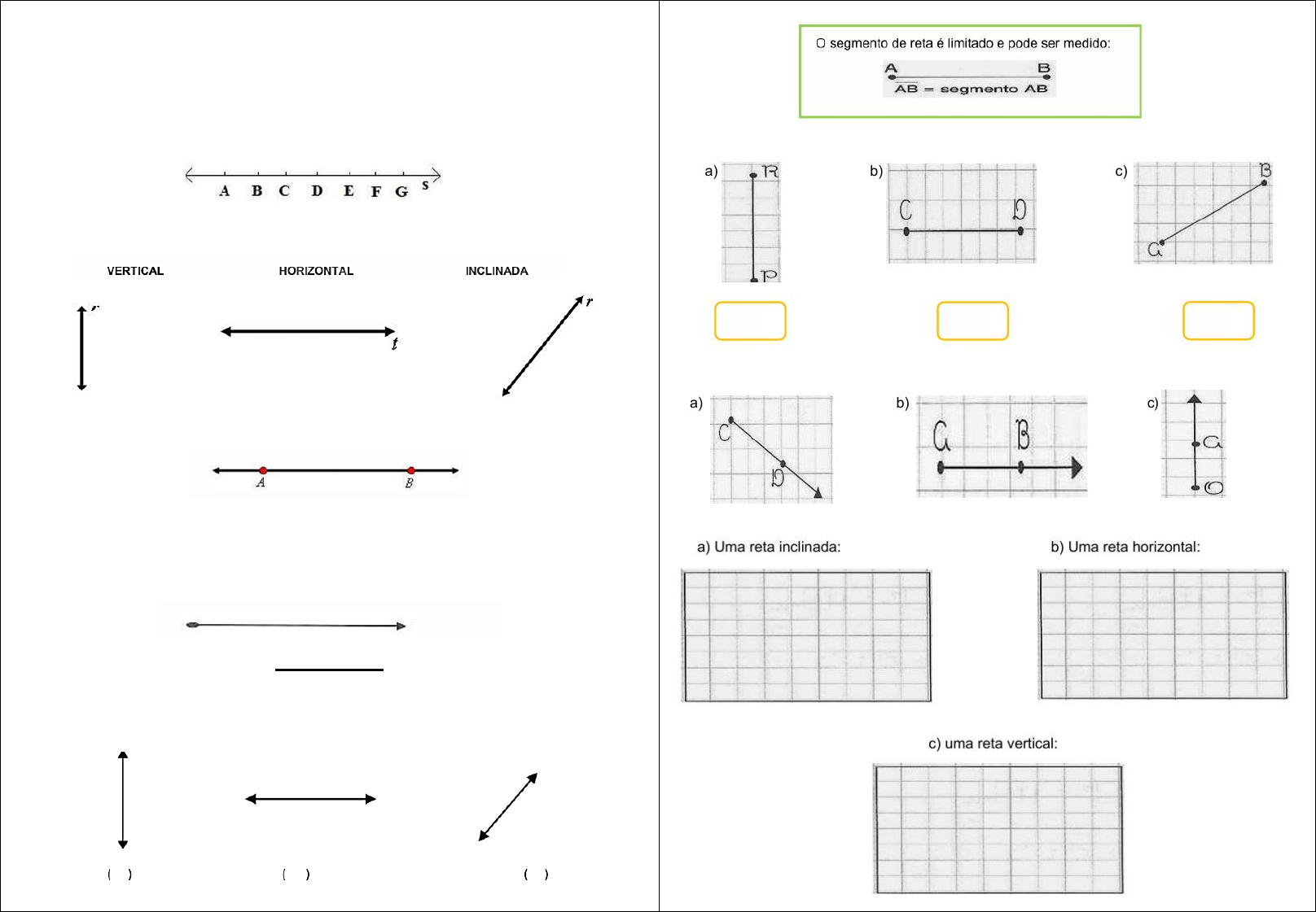 <p>RETAS</p><p>Na matemática, as retas são linhas infinitas formadas por pontos. Sendo</p><p>ilimitada nos dois sentidos. Elas são representadas por letras minúsculas e</p><p>devem ser desenhadas com setas para os dois lados, indicando que não</p><p>possuem fim. Já os pontos da reta são indicados por letras maiúsculas.</p><p>Exemplo:</p><p>Uma reta pode ser construída em três posições: horizontal, vertical ou</p><p>inclinada:</p><p>SEGMENTO DE RETA</p><p>O segmento de reta é limitado por dois pontos da reta. Observe:</p><p>A parte entre os pontos A e B é chamado de segmento de reta.</p><p>SEMIRRETA</p><p>A semirreta possui origem, mas é ilimitada no outro sentido, isto é, possui</p><p>início, mas não tem fim:</p><p>ATIVIDADES</p><p>1) Correlacione as posições das retas:</p><p>(A) Inclinada (B) Horizontal (C) Vertical</p><p>2) Represente os seguintes segmentos.</p><p>3) Circule os pontos de origem das semirretas:</p><p>4) Utilizando a malha quadriculada, desenhe a reta que se pede:</p>