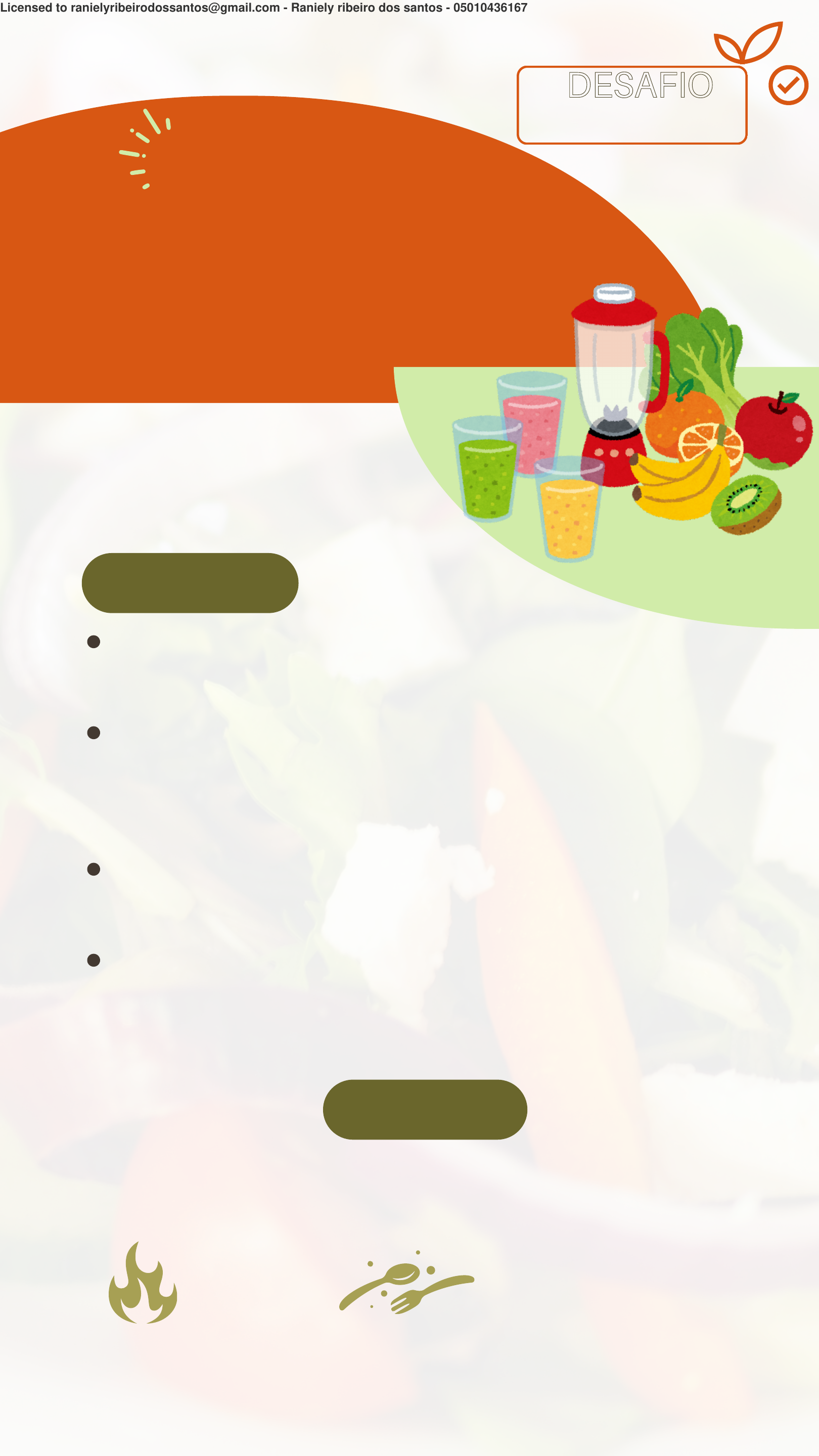 <p>Vitamina</p><p>2 bananas (200g) – 200</p><p>calorias</p><p>2 colheres de sopa de</p><p>pasta de amendoim</p><p>(32g) – 190 calorias</p><p>1 xícara de leite integral</p><p>(240ml) – 150 calorias</p><p>1 colher de sopa de mel</p><p>(21g) – 64 calorias</p><p>Banana com pasta de</p><p>amendoim</p><p>Ingredientes</p><p>Preparando</p><p>Bata todos os ingredientes no</p><p>liquidificador por 1 minuto.</p><p>604 calorias Rende 1 copo</p><p>DESAFIO</p><p>30 DIAS</p><p>Licensed to ranielyribeirodossantos@gmail.com - Raniely ribeiro dos santos - 05010436167</p><p>Vitamina</p><p>1 abacate médio (200g)</p><p>– 320 calorias</p><p>1 xícara de leite de coco</p><p>(240ml) – 552 calorias</p><p>1 banana (100g) – 100</p><p>calorias</p><p>1 colher de sopa de mel</p><p>(21g) – 64 calorias</p><p>Abacate com leite de coco</p><p>Ingredientes</p><p>Preparando</p><p>Bata todos os ingredientes no</p><p>liquidificador por 1 minuto.</p><p>1036 calorias Rende 1 copo</p><p>DESAFIO</p><p>30 DIAS</p><p>Licensed to ranielyribeirodossantos@gmail.com - Raniely ribeiro dos santos - 05010436167</p><p>Vitamina</p><p>1 xícara de leite integral</p><p>(240ml) – 150 calorias</p><p>2 colheres de sopa de</p><p>aveia (20g) – 76 calorias</p><p>5 damascos secos (35g)</p><p>– 84 calorias</p><p>10 amêndoas (12g) – 84</p><p>calorias</p><p>1 colher de sopa de mel</p><p>(21g) – 64 calorias</p><p>de Aveia com Frutas Secas</p><p>Ingredientes</p><p>Preparando</p><p>Bata todos os ingredientes no</p><p>liquidificador por 1 minuto.</p><p>458 calorias Rende 1 copo</p><p>DESAFIO</p><p>30 DIAS</p><p>Licensed to ranielyribeirodossantos@gmail.com - Raniely ribeiro dos santos - 05010436167</p><p>Vitamina</p><p>1 xícara de iogurte grego</p><p>(240ml) – 200 calorias</p><p>1 xícara de morangos</p><p>(150g) – 48 calorias</p><p>10 castanhas de caju</p><p>(20g) – 110 calorias</p><p>1 colher de sopa de mel</p><p>(21g) – 64 calorias</p><p>de Iogurte com Morango e</p><p>Castanhas</p><p>Ingredientes</p><p>Preparando</p><p>Bata todos os ingredientes no</p><p>liquidificador por 1 minuto.</p><p>422 calorias Rende 1 copo</p><p>DESAFIO</p><p>30 DIAS</p><p>Licensed to ranielyribeirodossantos@gmail.com - Raniely ribeiro dos santos - 05010436167</p><p>Vitamina</p><p>2 bananas maduras</p><p>2 colheres de sopa de</p><p>aveia</p><p>1 colher de sopa de mel</p><p>1 xícara de leite integral</p><p>1 colher de sopa de</p><p>manteiga de amendoim</p><p>de Banana com Aveia</p><p>Ingredientes</p><p>Preparando</p><p>Bata todos os ingredientes no</p><p>liquidificador por 1 minuto.</p><p>450 calorias Rende 1 copo</p><p>DESAFIO</p><p>30 DIAS</p><p>Licensed to ranielyribeirodossantos@gmail.com - Raniely ribeiro dos santos - 05010436167</p><p>Vitamina</p><p>1 xícara de morangos</p><p>1 copo de iogurte natural</p><p>integral (200g)</p><p>2 colheres de sopa de</p><p>mel</p><p>1 banana</p><p>de Morango com Iogurte</p><p>Ingredientes</p><p>Preparando</p><p>Bata todos os ingredientes no</p><p>liquidificador por 1 minuto.</p><p>350 calorias Rende 1 copo</p><p>DESAFIO</p><p>30 DIAS</p><p>Licensed to ranielyribeirodossantos@gmail.com - Raniely ribeiro dos santos - 05010436167</p><p>Vitamina</p><p>1 manga grande</p><p>1 xícara de leite de coco</p><p>2 colheres de sopa de</p><p>açúcar</p><p>1/2 xícara de água de</p><p>coco</p><p>de Manga com Coco</p><p>Ingredientes</p><p>Preparando</p><p>Bata todos os ingredientes no</p><p>liquidificador por 1 minuto.</p><p>400 calorias Rende 1 copo</p><p>DESAFIO</p><p>30 DIAS</p><p>Licensed to ranielyribeirodossantos@gmail.com - Raniely ribeiro dos santos - 05010436167</p><p>Vitamina</p><p>1 manga grande</p><p>1 xícara de leite de coco</p><p>2 colheres de sopa de</p><p>açúcar</p><p>1/2 xícara de água de</p><p>coco</p><p>de Amendoim com Cacau</p><p>Ingredientes</p><p>Preparando</p><p>Bata todos os ingredientes no</p><p>liquidificador por 1 minuto.</p><p>400 calorias Rende 1 copo</p><p>DESAFIO</p><p>30 DIAS</p><p>Licensed to ranielyribeirodossantos@gmail.com - Raniely ribeiro dos santos - 05010436167</p><p>Vitamina</p><p>2 colheres de sopa de</p><p>pasta de amendoim</p><p>1 colher de sopa de</p><p>cacau em pó</p><p>1 xícara de leite integral</p><p>1 banana madura</p><p>1 colher de sopa de mel</p><p>de Amendoim com Cacau</p><p>Ingredientes</p><p>Preparando</p><p>Bata todos os ingredientes no</p><p>liquidificador por 1 minuto.</p><p>400 calorias Rende 1 copo</p><p>DESAFIO</p><p>30 DIAS</p><p>Licensed to ranielyribeirodossantos@gmail.com - Raniely ribeiro dos santos - 05010436167</p><p>Vitamina</p><p>2 bananas médias (210 calorias)</p><p>1 copo de leite integral (150</p><p>calorias)</p><p>2 colheres de sopa de cacau em pó</p><p>(24 calorias)</p><p>1/4 de xícara de aveia (77 calorias)</p><p>2 colheres de sopa de mel (128</p><p>calorias)</p><p>1 colher de sopa de manteiga de</p><p>amêndoa (98 calorias)</p><p>de Chocolate com Banana</p><p>Ingredientes</p><p>Preparando</p><p>Bata todos os ingredientes no</p><p>liquidificador por 1 minuto.</p><p>687 calorias Rende 1 copo</p><p>DESAFIO</p><p>30 DIAS</p><p>Licensed to ranielyribeirodossantos@gmail.com - Raniely ribeiro dos santos - 05010436167</p>