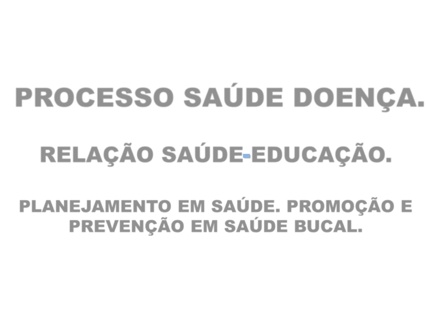<p>PROCESSO SAÚDE DOENÇA.</p><p>RELAÇÃO SAÚDE-EDUCAÇÃO.</p><p>PLANEJAMENTO EM SAÚDE. PROMOÇÃO E</p><p>PREVENÇÃO EM SAÚDE BUCAL.</p><p>O que é saúde?</p><p>SAÚDEDOENÇA</p><p>SAÚDE X DOENÇA</p><p>ausência de doenças físicas e mentais.</p><p>❑Não apenas!</p><p>❑ Durante muito tempo, predominou o</p><p>entendimento de que saúde era sinônimo de</p><p>SAÚDE - DEFINIÇÃO</p><p>Segundo a OMS: “Saúde é um estado de</p><p>completo bem estar físico, mental e social, e</p><p>não apenas a ausência de doença ou</p><p>enfermidade.”</p><p>Segundo Spencer: “Saúde é uma perfeita</p><p>adaptação de um organismo ao seu</p><p>ambiente.”</p><p>Segundo HOYMAN: “Saúde é um</p><p>ajustamento pessoal ótimo para uma vida</p><p>completa, frutífera e criativa.”</p><p>CONCEITO AMPLIADO</p><p>FINAL DA VIII CNS</p><p>DE SAÚDE – RELATÓRIO</p><p>❑A maior parte das doenças que existem em todos os países, acontece por conta</p><p>das condições em que as pessoas nascem, vivem, trabalham e envelhecem” (OMS).</p><p>O que é Saúde Bucal?</p><p>1- Hálito puro</p><p>2- Sorriso harmônico</p><p>3- Gengivas Saudáveis</p><p>A Saúde Bucal é composta por vários</p><p>fatores , que juntos necessitam de</p><p>uma boa higiene bucal!</p><p>Como garantir uma boa higiene bucal?</p><p>CUIDADOS DIÁRIOS PREVENTIVOS!!!!!</p><p>Boa Escovação</p><p>Uso correto do fio dental</p><p>MOTIVAÇÃO!!!</p><p>EDUCAÇÃO - DEFINIÇÃO</p><p>“A Educação é um processo rico e</p><p>enriquecedor, pois contém o germe da</p><p>crítica, reflexão e consequência.”</p><p>Artur da Távola</p><p>EDUCAÇÃO EM SAÚDE</p><p>X</p><p>PROMOÇÃO EM SAÚDE</p><p>A Educação em Saúde, diferente da informação em</p><p>saúde, procura desencadear mudanças de</p><p>comportamento individual, enquanto a Promoção</p><p>em Saúde, visa procurar mudanças de</p><p>comportamento organizacional, capazes de</p><p>beneficiar a saúde de camadas mais amplas da</p><p>população, particularmente e não exclusivamente,</p><p>por meio da legislação.</p><p>EDUCAÇÃO EM SAÚDE:</p><p>•Identificação do problema</p><p>•Resultado visado</p><p>•Adequação do conteúdo ao nível da</p><p>população e dos meios utilizados</p><p>• Prevenção de bloqueios à</p><p>comunicação</p><p>•Avaliação</p><p>EDUCAÇÃO EM SAÚDE: ABORDAGEM TEÓRICA</p><p>•Domínio Cognitivo</p><p>•Domínio Afetivo</p><p>•Domínio Psicomotor</p><p>Determinantes Sociais da Doença</p><p>•Condições econômicas, políticas e ambientais</p><p>( pobreza, moradia, saneamento, emprego,etc.)</p><p>•Contexto social e comunitário ( normas</p><p>sociais,religião, etc.)</p><p>•Comportamento relacionado à saúde bucal (dieta,</p><p>higiene,fumo, álcool, etc.)</p><p>• Indivíduo (sexo, idade,herança genética,etc.)</p><p>“A Carta de Ottawa, resultante da I Conferência</p><p>Internacional em Promoção de Saúde da OMS,</p><p>(novembro de 1986),divide a responsabilidade da</p><p>promoção de saúde entre os serviços de saúde,</p><p>grupos comunitários, profissionais de saúde e</p><p>governos; todos devem trabalhar juntos.”</p><p>A Promoção de Saúde caracteriza-se por tentar</p><p>agir nos determinantes sociais da doença e,</p><p>através de ações em parceria com vários setores</p><p>da sociedade, proporcionar aos cidadãos os meios</p><p>necessários para melhorar sua saúde e exercer um</p><p>maior controle sobre a mesma.</p><p>“TRATAMENTO DENTÁRIO NÃO TRAZ</p><p>CURA DEFINITIVA PARA AS DOENÇAS</p><p>BUCAIS”</p><p>Problemas que mais acometem a cavidade bucal</p><p>CÁRIE DENTÁRIA</p><p>DOENÇA PERIODONTAL</p><p>MALOCLUSÃO</p><p>CÂNCER BUCAL</p><p>FLUOROSE DENTÁRIA</p><p>Cárie – Fatores de Risco</p><p>• Fatores culturais e sócio-econômicos;</p><p>• Dificuldade de acesso aos serviços e</p><p>programas de saúde bucal;</p><p>• Falta de acesso ao flúor;</p><p>• Deficiente controle de placa;</p><p>• Consumo excessivo e freqüente de açúcar;</p><p>• Xerostomia;</p><p>• Doenças Endócrinas.</p><p>Doença Periodontal - Fatores de risco</p><p>• Fatores culturais e sócio-econômicos;</p><p>• Doenças metabólicas (diabetes, hipertensão);</p><p>• Alterações hormonais;</p><p>• Tabagismo;</p><p>• Ausência de controle de placa;</p><p>• Presença de fatores retentivos de placa;</p><p>• Imunodepressão e stress.</p><p>Câncer Bucal - Fatores de risco</p><p>• Hereditariedade;</p><p>• Fatores culturais e sócio-econômicos;</p><p>• Tabagismo (uso de cachimbos, hábitos de mascar</p><p>fumo, etc);</p><p>• Etilismo;</p><p>• Exposição à radiação solar;</p><p>• Ausência de controle de placa;</p><p>• Uso de próteses dentárias mal-ajustadas;</p><p>• Deficiência imunológica.</p><p>Trauma – Fatores de Risco</p><p>• Quedas (crianças e idosos);</p><p>• Traumas e acidentes;</p><p>• Ausência de instrumentos de proteção (cintos de</p><p>segurança, protetores bucais e faciais na prática de</p><p>esportes, capacetes, uso de assentos especiais para o</p><p>transporte de crianças pequenas);</p><p>• Maloclusão (overjet acentuado);</p><p>• Hábitos parafuncionais (uso dos dentes para abrir ou</p><p>cortar objetos).</p><p>Maloclusão – Fatores de Risco</p><p>• Hereditariedade (padrões de crescimento dento-facial,</p><p>tamanho dos dentes, tônus da musculatura facial);</p><p>• Alterações de desenvolvimento;</p><p>• Traumatismo pré e pós-natais;</p><p>• Fatores sistêmicos (distúrbios endócrinos, síndromes);</p><p>• Fatores locais (obstrução nasal, tumores, doença periodontal,</p><p>cárie dentária, perdas ósseas e migrações dentárias);</p><p>• Extração precoce de dentes decíduos;</p><p>• Função mastigatória reduzida (alimentos processados ou</p><p>refinados e ausência de alimentação fibrosa);</p><p>• Hábitos parafuncionais (sucção de chupeta, polegar, lábio, uso</p><p>de mamadeira