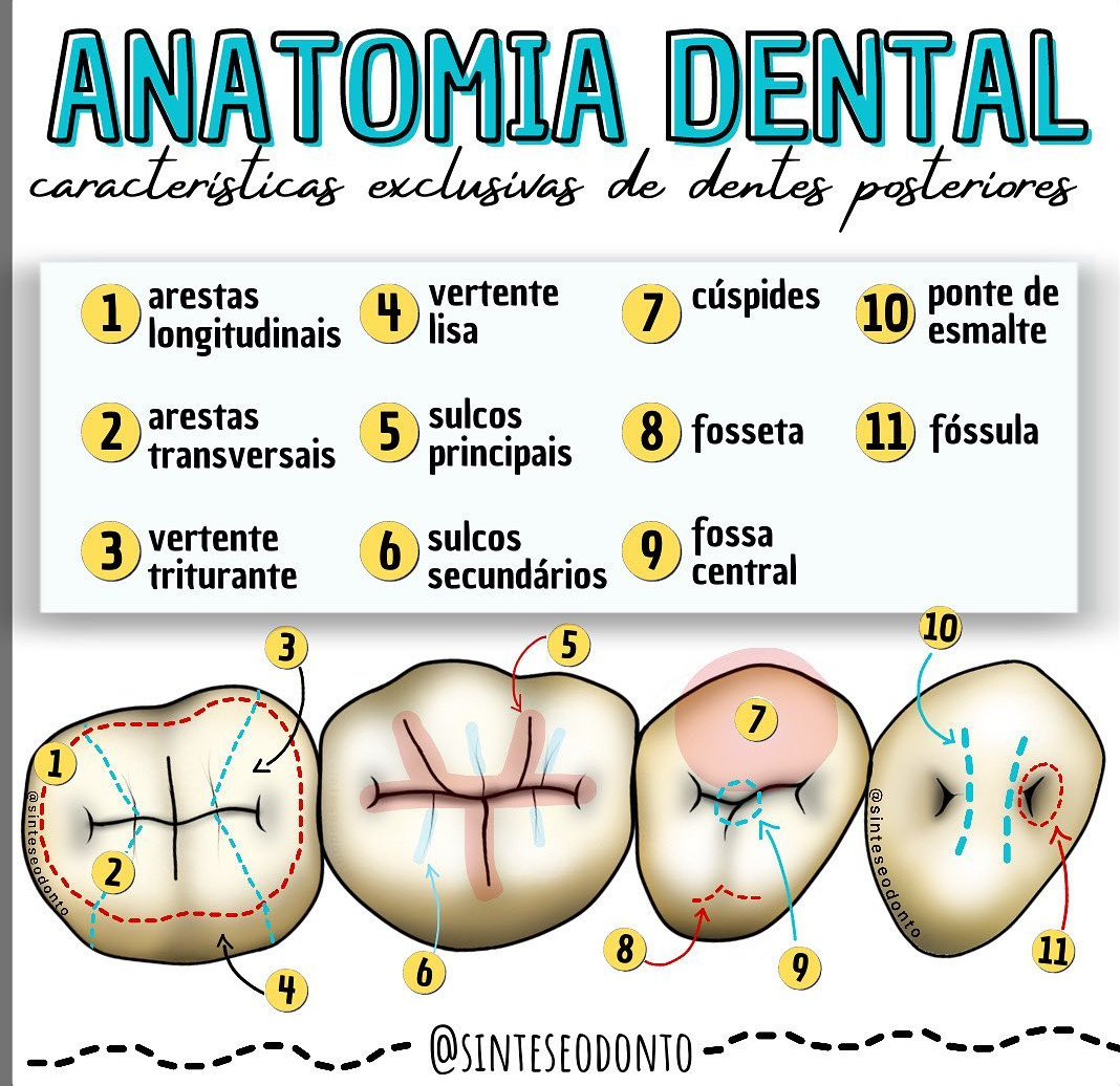 <p>ANATOMIA DENTAL caracteristicas exclusivas de dentes posteriores 1 arestas 4 vertente 7 cúspides lisa 10 ponte de longitudinais esmalte 2 arestas 5 sulcos 8 fosseta 11 transversais principais fóssula 3 vertente 6 sulcos 9 fossa triturante secundários central 10 3 5 7 1 @ 2 8 6 9 11 4 @SINTESEODONTO</p>