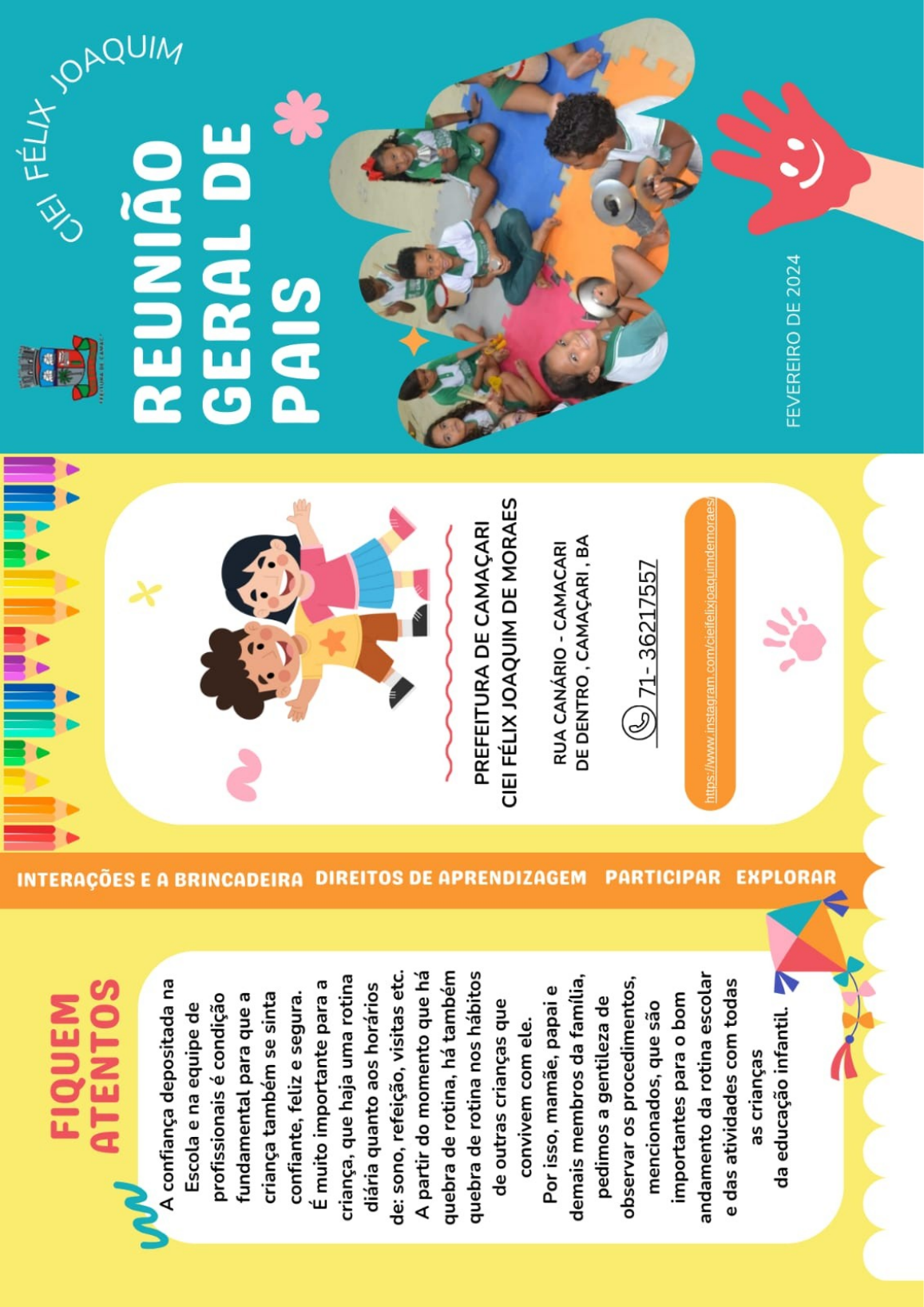 <p>FÉLIX FIQUEM ATENTOS w REUNIÃO A confiança depositada na Escola e na equipe de profissionais é condição GERAL DE fundamental para que a criança também se sinta PAIS confiante, feliz e segura. É muito importante para a criança, que haja uma rotina diária quanto aos horários de: sono, refeição, visitas etc. A partir do momento que há DE quebra de rotina, há também quebra de rotina nos hábitos PREFEITURA DE CAMAÇARI de outras crianças que CIEI FÉLIX JOAQUIM DE MORAES convivem com ele. Por isso, mamãe, papai e RUA CANÁRIO - CAMACARI demais membros da família, DE DENTRO , CAMAÇARI , BA pedimos a gentileza de observar os procedimentos, mencionados, que são importantes para o bom 71- 36217557 andamento da rotina escolar e das atividades com todas as crianças FEVEREIRO DE 2024 da educação infantil.</p><p>HORÁRIO DE ASSUNTOS ENTRADA E COMPLEMENTARES SAÍDA HORÁRIO DAS AULAS: 8H ÀS 16H. ALIMENTAÇÃO ROUPAS E UNIFORMES Com o acerto do horário da permanência da criança As refeições são preparadas na cozinha da Escola. o na Escola, os pais contam com a tolerância de 15 cardápio é elaborado por nutricionista e publicado no Para maior conforto, pedimos que enviem minutos antes ou depois desse horário. Caso a mural da escola. roupas folgadas e short com elástico na criança precise chegar ou ir embora, em horário DOCES e outros: Não deixar que a criança entre na cintura, evitando os jeans e outras roupas diferente do habitual, a Escola deverá ser escola comendo ou chupando tais doces e também não com zíper, e deve vir MARCADO, de maneira comunicada previamente. traga na mochila. que seja facilmente encontrado. Caso queria fazer ANIVERSÁRIO na escola, agendar ENTREGA DOS ALUNOS: evitar mudar de portador, Não será permitida a entrada da criança com com professor e coordenação com 3 dias de quando necessário avisar a escola com antecedência. joias, brinquedos e outros objetos, pois a antecedência. Escola não se responsabiliza por eles. FALTAS: deverão ser justificadas, em caso de doença Caso seu filho tenha alguma restrição alimentar com atestado médico a partir do 3° dia; procure a coordenação pedagógica. CONTATO ESCOLA-FAMÍLIA Os pais/responsáveis deverão, deixar no portão de HIGIENE E SAÚDE entrada e na saída, pegar a criança na porta da sala. A Escola não se responsabiliza pelos recados Não é permitida a circulação de pais, parentesou transmitidos verbalmente no portão. Os As crianças tomarão um banho, diariamente antes do conhecidos pelo recinto escolar,sem prévia mesmos devem ser enviados por meio do, almoço. Exceto em extrema necessidade. WHATSAPP ou TELEFONE. autorização. o MATERIAL DE HIGIENE, é trazido pelos pais e ficará A Escola NÃO fornece os endereços e telefones das Quando houver necessidade a equipe escolar na Escola, em local apropriado, sendo reposto sempre podem chamar os pais para uma conversa famílias dos alunos e funcionários, sem prévia que solicitado pelas educadoras. particular. Ou, ao contrário, os pais podem autorização deles. Não será permitida a entrada de criança com qualquer tipo marcar uma reunião particular, na escola, Somente os pais, ou pessoas previamente de doença, contagiosa ou qualquer sintoma não desde que seja agendado. autorizadas por que podem RETIRAR a criança esclarecido. MEDICAMENTOS: programar o horário para A CARTEIRINHA DE IDENTIFICAÇÃO será a da Escola. Qualquer mudança ou imprevistodeve ser que não coincidam com período em que aluno fica na documentação da criança na escola, quando escola. Se necessário a família vem ministrar. comunicado antecipadamente à secretaria, caso houver necessidade de outra pessoa pegar a PIOLHO: Olhar sempre a cabeça da criança, e usar contrário, a criança não sairá da Escola até se criança, deve apresentar a mesma. medicamento quando necessário. conseguir entrar em contato com os responsáveis.</p>