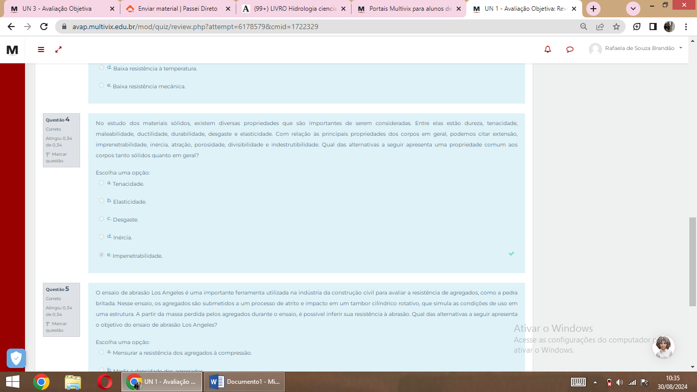 <p>M UN 3 Avaliação Objetiva Enviar materia Passei Direto x A (99+) LIVRO Hidrologia ciencia x M Portais Multivix para alunos de M UN 1 Avaliação Objetiva: Rev + A M Rafaela de Souza Brandão d. Baixa resistência à temperatura Baixa resistência Questão 4 No dos materiais existem diversas propriedades que são importantes de serem consideradas Entre elas estão tenacidade Correto ductilidade desgaste e Com relação às principais propriedades dos corpos em geral, podemos citar Atingiu 0.34 de divisibilidade e Qual das alternativas a seguir apresenta uma propriedade comum aos Marcar corpos tanto sólidos quanto em geral? questão Escolha uma opção a Tenacidade b d. e Impenetrabilidade Questão 5 de abrasão Los Angeles é uma importante ferramenta utilizada na indústria da construção civil para avaliar a resistência de agregados como a pedra Correto britada Nesse os agregados são submetidos a um processo de atrito impacto em um tambor que simula as condições de uso em Atingiu 0.34 de 0.34 uma estrutura A partir da massa perdida pelos agregados durante é possível inferir sua resistência à Qual das alternativas a seguir apresenta do de abrasão Los Angeles? questão Ativar Windows Escolha uma Acesse as configurações do computador ativar Windows a resistência dos agregados à compressão b 10:35 UN 1 Avaliação W Documento1 Mi... 30/08/2024</p>