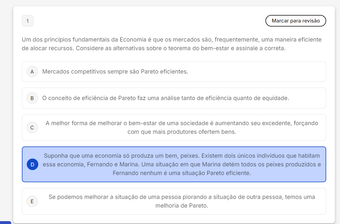 <p>1 Marcar para revisão Um dos princípios fundamentais da Economia é que os mercados são, frequentemente, uma maneira eficiente de alocar recursos. Considere as alternativas sobre o teorema do bem-estar e assinale a correta. A Mercados competitivos sempre são Pareto eficientes. B conceito de eficiência de Pareto faz uma análise tanto de eficiência quanto de equidade. A melhor forma de melhorar o bem-estar de uma sociedade é aumentando seu excedente, forçando C com que mais produtores ofertem bens Suponha que uma economia só produza um bem, peixes. Existem dois únicos indivíduos que habitam D essa economia, Fernando e Marina. Uma situação em que Marina detém todos os peixes produzidos e Fernando nenhum é uma situação Pareto Se podemos melhorar a situação de uma pessoa piorando a situação de outra pessoa, temos uma E melhoria de Pareto.</p>