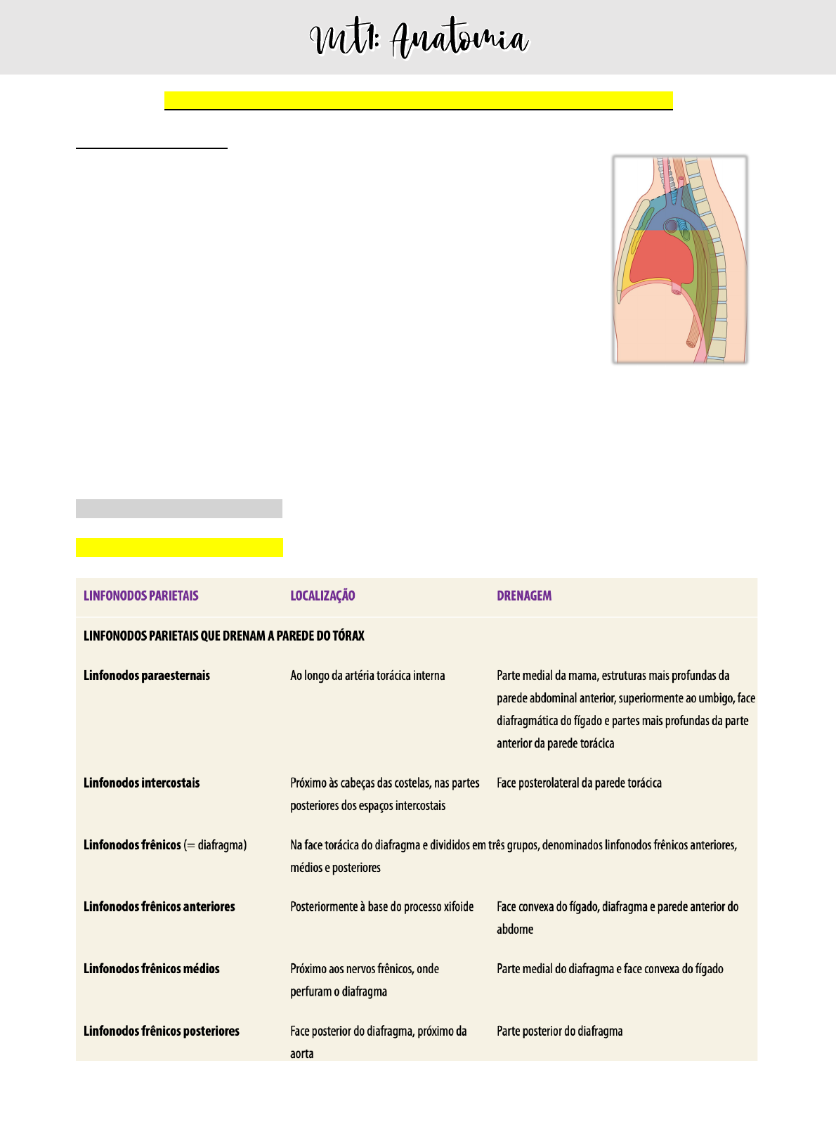 <p>1</p><p>AULAS 3 e 4 - DRENAGEM LINFÁTICA DO TÓRAX E ABDOMEN</p><p>CAIXA TORÁCICA:</p><p>§ Sistemas respiratório e circulatório</p><p>§ Mediastino</p><p>§ Cavidades pulmonares</p><p>MEDIASTINO</p><p>§ Superior</p><p>§ Inferior</p><p>o ANTERIOR</p><p>o MÉDIO</p><p>o POSTERIOR</p><p>Um mediastino central, um compartimento interposto entre as duas cavidades pulmonares e</p><p>separando-as completamente, que contém praticamente todas as outras estruturas torácicas</p><p>– coração, partes torácicas dos grandes vasos, parte torácica da traqueia, esôfago, timo e</p><p>outras estruturas (p. ex., linfonodos). Estende-se verticalmente da abertura superior do tórax</p><p>até o diafragma e anteroposteriormente do esterno até os corpos vertebrais torácicos.</p><p>LINFONODOS DO TÓRAX</p><p>LINFONODOS PARIETAIS</p><p>2</p><p>LINFONODOS VISCERAIS</p><p>PAREDE DO TÓRAX</p><p>§ Linfonodos paraesternais</p><p>o Drenam parte medial da mama, diafragma, EIC e pleura costal, podendo disseminar</p><p>CA de mama para pulmão, mediastino e fígado;</p><p>§ Linfonodos intercostais</p><p>o Localizados na extremidade vertebral do EIC. Os superiores drenam para o ducto</p><p>torácico ou Ducto linf. Dir, enquanto os inferiores drenam para a cisterna do quilo.</p><p>§ Linfonodos frênicos</p><p>o Drenagem dos últimos EIC, pericárdio, diafragma e fígado para linfonodos</p><p>paraesternais ou mediastinais posteriores (porção posterior da superfície torácica do</p><p>diafragma)</p><p>3</p><p>4</p><p>§ A linfa da pele da mama, com exceção da papila e da aréola, drena para os linfonodos</p><p>axilares, cervicais profundos inferiores e infraclaviculares ipsilaterais e, também, para os</p><p>linfonodos paraesternais de ambos os lados.</p><p>§ A linfa dos linfonodos axilares drena para os linfonodos claviculares (infraclaviculares e</p><p>supraclaviculares) e daí para o tronco linfático subclávio, que também drena a linfa do</p><p>membro superior.</p><p>§ A linfa dos linfonodos paraesternais entra nos troncos linfáticos broncomediastinais, que</p><p>também drena linfa das vísceras torácicas.</p><p>§ A terminação dos troncos linfáticos varia; tradicionalmente, esses troncos se fundem um</p><p>ao outro e com o tronco linfático jugular, drenando a cabeça e o pescoço para formar um</p><p>ducto linfático direito curto no lado direito ou entrando no ducto torácico do lado</p><p>esquerdo.</p><p>§ No entanto, em muitos casos (talvez na maioria), os troncos se abrem</p><p>independentemente na junção das veias jugular interna e subclávia, no ângulo venoso</p><p>direito ou esquerdo, que formam as veias braquiocefálicas direita e esquerda.</p><p>§ Em alguns casos, eles se abrem em duas veias imediatamente antes do ângulo.</p><p>Ducto torácico e troncos linfáticos.</p><p>A. A parte torácica da aorta foi ligeiramente desviada para a esquerda e a veia ázigo, para</p><p>a direita, a fim de expor o ducto torácico. Aproximadamente no plano transverso do tórax</p><p>(ângulo do esterno, nível do disco intervertebral TIV–TV), o ducto torácico segue para a</p><p>esquerda e continua a ascender até o pescoço, onde curva-se lateralmente para entrar no</p><p>ângulo venoso esquerdo. O ducto linfático direito é formado pela união dos equivalentes</p><p>contralaterais dos ductos que se unem ao término do ducto torácico.</p><p>B. Linfonodos e vias linfáticas que drenam a cavidade torácica.</p><p>5</p><p>DRENAGEM LINFÁTICA</p><p>§ Os vasos linfáticos da parede do tórax drenam principalmente em linfonodos associados</p><p>às artérias torácicas internas (linfonodos paraesternais), às cabeças e colos das costelas</p><p>(linfonodos intercostais) e ao diafragma (linfonodos frênicos).</p><p>§ Os linfonodos frênicos estão posteriores ao xifoide e em áreas onde os nervos frênicos</p><p>penetram no diafragma.</p><p>§ Eles também estão presentes em regiões onde o diafragma se fixa à coluna vertebral.</p><p>§ Linfonodos paraesternais drenam para os troncos broncomediastinais.</p><p>§ Linfonodos intercostais da região superior do tórax também drenam para os troncos</p><p>broncomediastinais, enquanto os linfonodos intercostais da região inferior do tórax</p><p>drenam para o ducto torácico.</p><p>§ Os linfonodos associados ao diafragma se interconectam com linfonodos paraesternais,</p><p>pré-vertebrais, justaesofágicos, linfonodos braquiocefálicos (anteriores às veias</p><p>braquiocefálicas no mediastino superior) e linfonodos aórticos laterais e lombares (no</p><p>abdome).</p><p>6</p><p>7</p><p>DRENAGEM LINFÁTICA DA TRAQUÉIA</p><p>DRENAGEM LINFÁTICA DO ESÔFAGO</p><p>8</p><p>BRÔNQUICA</p><p>O aumento dos linfonodos traqueobronquiais (carinais) inferiores pode alargar o</p><p>ângulo entre os brônquios principais. Nesta peça, o ducto torácico entra na veia</p><p>subclávia esquerda.</p><p>PLEURAS E PULMÕES</p><p>9</p><p>§ PLEURA VISCERAL</p><p>o PLEXO LINFÁTICO SUPERFICIAL/SUBPLEURAL</p><p>§ PLEURA PARIETAL</p><p>o LINFONODOS DA PAREDE TORÁCICA (INTERCOSTAIS, PARAESTERNAIS,</p><p>MEDIASTINAIS E FRÊNICOS) E LINFONODOS AXILARES (CERVICAL)</p><p>§ Os plexos linfáticos pulmonares comunicam-se livremente.</p><p>§ O plexo linfático superficial/subpleural situa-se profundamente à pleura visceral e drena</p><p>o parênquima (tecido) pulmonar e a pleura visceral.</p><p>§ Os vasos linfáticos desse plexo superficial drenam para os linfonodos broncopulmonares</p><p>no hilo do pulmão.</p><p>§ O plexo linfático profundo está localizado na tela submucosa dos brônquios e no tecido</p><p>conjuntivo peribrônquico.</p><p>§ Sua principal função é a drenagem das estruturas que formam a raiz do pulmão.</p><p>§ Os vasos linfáticos desse plexo profundo drenam inicialmente para os linfonodos</p><p>pulmonares intrínsecos, localizados ao longo dos brônquios lobares.</p><p>§ Os vasos linfáticos que saem desses linfonodos continuam a segu
