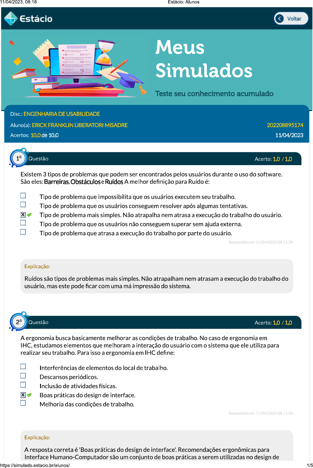 <p>11/04/2023, 08:18 Estácio: Alunos Estácio Voltar Meus Simulados Teste seu conhecimento acumulado Disc.: ENGENHARIA DE USABILIDADE Aluno(a): ERICK FRANKLIN LIBERATORI MISADRE 202208895174 Acertos: 10,0 de 10,0 11/04/2023 Questão Acerto: 1,0 / 1,0 Existem 3 tipos de problemas que podem ser encontrados pelos usuários durante o uso do software. São eles: Barreiras, Obstáculose Ruídos A melhor definição para Ruído é: Tipo de problema que impossibilita que os usuários executem seu trabalho. Tipo de problema que os usuários conseguem resolver após algumas tentativas. Tipo de problema mais simples. Não atrapalha nem atrasa a execução do trabalho do usuário. Tipo de problema que os usuários não conseguem superar sem ajuda externa. Tipo de problema que atrasa a execução do trabalho por parte do usuário. Respondido em 11/04/2023 08:11:34 Explicação: Ruídos são tipos de problemas mais simples. Não atrapalham nem atrasam a execução do trabalho do usuário, mas este pode ficar com uma má impressão do sistema. Questão Acerto: A ergonomia busca basicamente melhorar as condições de trabalho. No caso de ergonomia em IHC, estudamos elementos que melhoram a interação do usuário com o sistema que ele utiliza para realizar seu trabalho. Para isso a ergonomia em IHC define: Interferências de elementos do local de trabalho. Descansos periódicos. Inclusão de atividades físicas. Boas práticas do design de interface. Melhoria das condições de trabalho. Respondido em 11/04/2023 08:11:56 Explicação: A resposta correta é 'Boas práticas do design de Recomendações ergonômicas para Interface Humano-Computador são um conjunto de boas práticas a serem utilizadas no design de https://simulado.estacio.br/alunos/ 1/5</p><p>11/04/2023, 08:18 Estácio: Alunos interfaces. Questão Acerto: 1,0 / 1,0 O Ergodesign busca acabar com as diferenças que existem entre as disciplinas de Ergonomia e Design. Qual das práticas de design citadas abaixo já traz embutido o conceito de Ergodesign? Design Centrado no Usuário. Interface Design de Interface. UX Writing. Design de interação. Respondido em 11/04/2023 08:06:09 Explicação: A resposta correta é 'Design Centrado no Muitas vezes, mesmo que não se fale o nome 'Ergodesign', isso já está sendo utilizado, pois vem embutido nos conceitos de 'design centrado no usuário', 'experiência do emocional' etc., dado que trata justamente da relação do usuário com uma interface qualquer. Questão Acerto: (FADESP/2019 Adaptada) Usabilidade é um termo muito utilizado para definir o grau de facilidade que as pessoas têm ao utilizar, por exemplo, ferramentas, sites ou até mesmo produtos. Seu objetivo é entender se o usuário consegue localizar as funções e compreender como tudo funciona rapidamente e, caso seja identificado algum problema, os erros são estudados e corrigidos. Disponível em: Acesso em: 23 set. 2022. Acerca dos conceitos sobre a avaliação de Interface Humano-Computador, qual técnica de usabilidade consiste em solicitar a usuários a realização de tarefas de teste previamente estabelecidas para a avaliação da interface a ser estudada? Uso de guidelines e checklists. Etnografia. Avaliação heurística. Ensaios de interação. Uso de questionários e entrevistas. Respondido em 11/04/2023 08:12:34 Explicação: Resposta correta: Ensaios de interação. Os mecanismos de avaliação mais frequentemente empregados em ensaios de interação são observações, questionários, entrevistas, verbalização de procedimentos, interação construtiva, ensaio retrospectivo, captura automática diretamente da aplicação, discussões em grupo focal, e retorno imediato de opiniões do usuário. Questão Acerto: 1,0 / 1,0 https://simulado.estacio.br/alunos/ 2/5</p><p>11/04/2023, 08:18 Estácio: Alunos processo de avaliação de usabilidade é constituído de quatro macro atividades para cada ciclo de avaliações realizadas. As técnicas de avaliação de interface seguem, em geral, quais passos? Preparação, execução, análise de dados coletados e relato dos resultados. Preparação, implementação, testes e ensaios. Análise, preparação, documentação e diagnóstico inicial. Preparação, análise de dados resultantes, documentação e atividade prática. Análise, preparação, implementação e discussão. Respondido em 11/04/2023 08:12:18 Explicação: As técnicas de avaliação de interface seguem, em geral, os seguintes passos: preparação, execução ou coleta de dados, análise e interpretação dos dados, consolidação e relato dos resultados. Questão Acerto: A usabilidade é um termo utilizado para definir a facilidade com que as pessoas empregam uma ferramenta ou mesmo um objeto para realizar uma tarefa. No ambiente de software, os sistemas são as ferramentas utilizadas para a execução de tarefas pelo usuário e encontramos na usabilidade o momento do diálogo entre o usuário e a interface do software. Disponível em: https://www.teclogica.com.br/o-que-e-usabilidade/ Acesso em: 23 set. 2022. Avaliação de usabilidade pode ser entendida como: Uma ferramenta geral aplicada no estágio final do projeto, excluindo a prototipagem. procedimento para aquisição de informações sobre a usabilidade ou potencial usabilidade de um sistema, a fim de aprimorar recursos em uma interface em desenvolvimento. Estudo do diálogo humano-computador que busca economia de tempo, diminuição da carga cognitiva e rapidez de decisões. Estratégia adotada pelo arquiteto de software para excluir o usuário de emitir opiniões. Técnica realizada com os desenvolvedores de um sistema, visando maximizar o seu desempenho. Respondido em 11/04/2023 08:17:04 Explicação: Resposta correta: o procedimento para aquisição de informação sobre a usabilidade ou potencial usabilidade de um sistema, a fim de tanto aprimorar recursos numa interface em desenvolvimento e seu material de suporte quanto avaliar uma interface já ava