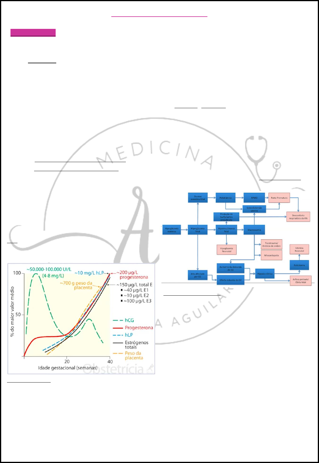 <p>Ana Clara Aguilar de Almeida – Internato em Ginecologia e Obstetrícia – Ago. 2024</p><p>1</p><p>Diabetes Gestacional</p><p>- FISIOPATOLOGIA:</p><p>▪ hLP (Hormônio Lactogênio Placentário)</p><p>AUMENTA A RESISTÊNCIA INSULÍNICA na</p><p>gravidez</p><p>o feto normalmente não produz a sua própria glicose e</p><p>sim ele vai receber a glicose da mãe através de</p><p>mecanismos de difusão facilitada que ocorre na placenta</p><p>– vai ocorrer a passagem de onde tem mais concentração</p><p>de glicose para onde tem menos concentração de glicose.</p><p>Para que a glicose que está na corrente sanguínea da mãe</p><p>seja passada para o feto, a placenta produz um hormônio</p><p>chamado LACTOGÊNIO PLACENTÁRIO (hLP) – terá a</p><p>função de aumentar a resistência insulínica na gravidez, o</p><p>que faz com que assim que a mãe recebe a glicose através</p><p>da dieta, ela não seja internalizada nas células maternas</p><p>e permaneça na corrente sanguínea. Assim, ela fica em</p><p>excesso na corrente e pelo processo de difusão facilitada</p><p>passa para o feto. Terá uma glicose na corrente sanguínea</p><p>da mãe e pouca glicose na corrente sanguínea do feto.</p><p>Obs.: Isso descrito acima, é um processo que ocorre em</p><p>todas as gestantes – é normal.</p><p>No gráfico acima:</p><p>A medida em que a gestação vai evoluindo, o hLP vai</p><p>aumentando suas concentrações – ou seja, a fase em que</p><p>há mais risco de ocorrer diabetes gestacional será mais</p><p>para o final da gestação.</p><p>Entretanto, não adianta que esse diagnóstico seja feito no</p><p>final da gestação, pois não terá tempo hábil para agir e</p><p>controlar. Assim, através de um consenso de especialistas</p><p>foi decidido que aproximadamente entre 24-28 semanas</p><p>de gestação, deve realizar o teste TOTG para avaliar a</p><p>resistência insulínica e a chance de desenvolver diabetes.</p><p>Nessa fase da gestação (24-28 semanas), a paciente já</p><p>pode ter uma resistência insulínica importante e terá</p><p>tempo hábil para adequar e evitar consequências para o</p><p>feto e para a mãe.</p><p>Na gestante NORMAL (sem diabetes), a maioria da</p><p>glicose passa para o feto e assim ela começa a utilizar</p><p>como energia lipídeos e proteínas, assim o pâncreas</p><p>materno tende a produzir mais insulina ainda para tentar</p><p>compensar e internalizar o restante de glicose que tenha</p><p>circulante.</p><p>Caso o pâncreas não consiga produzir essa insulina</p><p>“extra” para internalizar o que tenha de glicose</p><p>circulante, ela vai desenvolver uma HIPERGLICEMIA.</p><p>No fluxograma acima: Consequências da Hiperglicemia</p><p>Materna</p><p>Se a mãe está hiperglicêmica, ou seja, ela não produziu a</p><p>insulina necessária para acabar de internalizar a glicose,</p><p>o bebê vai acabar recebendo por difusão toda a glicose</p><p>que “sobrou”, assim consequentemente terá uma</p><p>HIPERGLICEMIA FETAL.</p><p>O rim do bebê entende que tem tanta glicose circulante</p><p>no organismo fetal que ele acaba filtrando a glicose. Mas,</p><p>junto com a glicose tende a ir também água, o que vai ter</p><p>consequentemente uma DIURESE OSMÓTICA FETAL.</p><p>Normalmente, é o rim responsável pela formação do</p><p>líquido amniótico, assim, neste caso, como muita água</p><p>será filtrada pelo rim junto com a glicose, acaba</p><p>ocorrendo uma POLIDRÂMNIA.</p><p>Um bebê polidrâmnio terá mais risco de ROTURA</p><p>PREMATURA DE MEMBRANAS OVULARES (RPMO) e</p><p>Ana Clara Aguilar de Almeida – Internato em Ginecologia e Obstetrícia – Ago. 2024</p><p>2</p><p>SOBREDISTENSÃO UTERINA – consequentemente pode</p><p>ter o risco de um PARTO PREMATURO.</p><p>Normalmente, o bebê não produz a sua própria glicose,</p><p>entretanto ele consegue produzir sua própria insulina. A</p><p>insulina normalmente atrapalha a produção de</p><p>surfactante no pulmão, e por isso será um bebê que vai</p><p>nascer com mais DESCONFORTO RESPIRATÓRIO ao</p><p>nascer – ou seja, será um bebê de parto prematuro e com</p><p>mais risco de desconforto respiratório quando recém-</p><p>nascido.</p><p>No bebê hiperglicêmico, a Hb glicada se liga ao O2 (tem</p><p>alta afinidade) e não solta para os tecidos que precisa.</p><p>Assim, consequentemente terá uma oferta reduzida de</p><p>oxigênio (esse bebê precisa de mais oxigênio do que</p><p>deveria por ser macrossômico).</p><p>A insulina é muito parecida com hormônio de</p><p>crescimento, e por isso ela vai estimular a produção de</p><p>IGF1, gerando um crescimento fetal – MACROSSOMIA.</p><p>Um bebê macrossômico terá mais chances de ter traumas</p><p>durante o parto, distocia de ombros e tendencia a</p><p>cardiopatias (coração precisa trabalhar mais).</p><p>Além disso, ele terá alta demanda de oxigênio,</p><p>entretanto, neste caso a oferta estará reduzida pela alta</p><p>afinidade com Hb glicada, assim esse bebê também pode</p><p>ter uma HIPÓXIA CRÔNICA. Pode ser um bebê que de</p><p>manhã escuta bem os batimentos cardíacos, mas de</p><p>tarde pode não escutar mais gerando o ÓBITO FETAL.</p><p>Para tentar compensar a falta de oxigênio, o bebê tende</p><p>a produzir mais hemácias para tentar utilizar o oxigênio</p><p>que tiver “sobrando”, assim ele terá uma POLICITEMIA –</p><p>no momento em que nasce, o excesso de hemácias sofre</p><p>morte celular e consequentemente terá ICTERÍCIA</p><p>NEONATAL.</p><p>O bebê será hiperinsulinêmico para tentar compensar a</p><p>quantidade de glicose que chega pela mãe, mas quem</p><p>manda a glicose para ele é a placenta. Portanto, no</p><p>momento do parto que vai retirar a placenta, vai retirar</p><p>também o aporte de glicose, gerando uma</p><p>HIPERINSULINEMIA e o bebê desenvolve HIPOGLICEMIA</p><p>PÓS PARTO.</p><p>No fluxograma acima: Efeitos a longo prazo da DM na</p><p>gestação – Ciclo vicioso da Síndrom