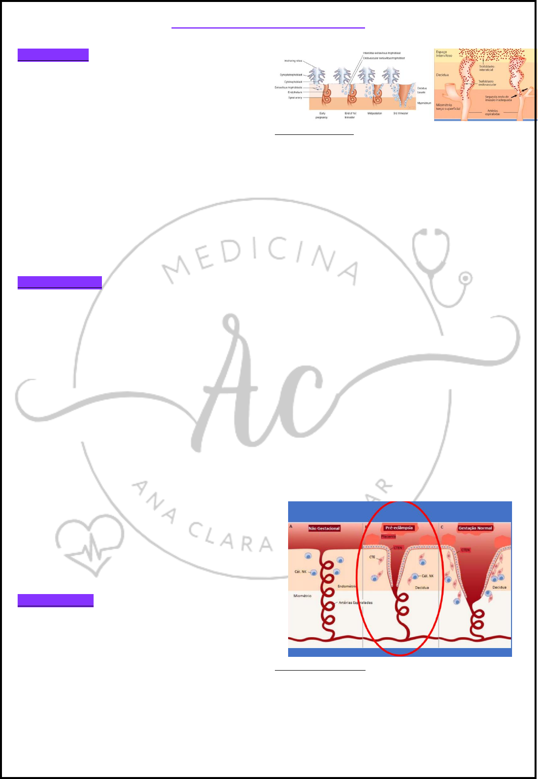<p>Ana Clara Aguilar de Almeida – Internato em Ginecologia e Obstetrícia – Ago. 2024</p><p>1</p><p>Hipertensão na Gravidez</p><p>- COMPLICAÇÕES:</p><p>▪ Morte materna – 10-15%</p><p>Um dos principais motivos de morte materna</p><p>▪ Insuficiência renal</p><p>▪ Acidente vascular cerebral</p><p>▪ Insuficiência cardíaca</p><p>▪ Edema agudo de pulmão</p><p>▪ Coagulopatia</p><p>▪ Insuficiência hepática</p><p>▪ Prematuridade</p><p>▪ CIUR</p><p>▪ Oligoâmnio</p><p>▪ Morte perinatal</p><p>- FATORES DE RISCO:</p><p>▪ Nuliparidade (2x)</p><p>▪ Troca de parceiro</p><p>▪ HAS prévia à gestação</p><p>▪ Nível socioeconômico desfavorável</p><p>▪ Extremos da vida reprodutiva – < 18 e > 40 anos</p><p>▪ História familiar de DHEG (3x)</p><p>▪ Obesidade – quanto > IMC pré-gestacional maior</p><p>o risco</p><p>▪ Gestação múltipla (pré-eclâmpsia precoce)</p><p>▪ Doença trofoblástica gestacional – pré-</p><p>eclâmpsia precoce</p><p>▪ DHEG na gestação pregressa – aumenta a chance</p><p>de desenvolver na gestação atual em até 8x</p><p>▪ Diabetes mellitus</p><p>▪ Doença renal crônica</p><p>▪ Doenças do colágeno</p><p>▪ Trombofilias – Síndrome dos anticorpos</p><p>antifosfolípes</p><p>- FISIOPATOLOGIA:</p><p>▪ Desconhecida – algumas teorias</p><p>o Genética</p><p>o Desequilíbrio angiogênico</p><p>o Imune</p><p>o Deficiência nutricional</p><p>▪ Deficiência da invasão trofoblástica</p><p>A fisiopatologia da pré-eclâmpsia ainda é desconhecida,</p><p>mas a teoria mais aceita atualmente é a deficiência da</p><p>invasão trofoblástica</p><p>Na imagem acima:</p><p>Nas imagens é possível visualizar a Decídua (endométrio</p><p>na gestação) e o miométrio.</p><p>Na decídua existem as artérias espiraladas, que são</p><p>artérias com alta resistência, de pequeno volume.</p><p>No início da gestação, tem a primeira onda de invasão</p><p>trofoblástica, em que as células do trofoblasto invadem a</p><p>decídua e destroem a camada média dessas artérias,</p><p>fazendo com que ocorra a vasodilatação (ficam</p><p>aproximadamente 2-3x mais dilatadas do que antes da</p><p>gestação).</p><p>Quando há a segunda onda de invasão trofoblástica, com</p><p>aproximadamente 20 semanas, ela será mais profunda do</p><p>que a primeira, destruindo ainda mais a camada média</p><p>das artérias espiraladas, fazendo com que elas dilatem</p><p>ainda mais (acomete até +- no início do miométrio).</p><p>Normalmente, no final da gestação, essas artérias</p><p>espiraladas terão um diâmetro 8x maior do que no início</p><p>da gestação.</p><p>Espaço interviloso = onde ocorrem as trocas gasosas e de</p><p>glicose</p><p>Na imagem acima: Artérias espiraladas antes da</p><p>gestação, durante a gestação NORMAL, e durante a</p><p>gestação com PRÉ-ECLÂMPIA</p><p>Quando ocorre a primeira invasão trofoblástica e não</p><p>ocorre a segunda invasão, a artéria espiralada ficará</p><p>dilatada em sua superfície, mas no miométrio</p><p>Ana Clara Aguilar de Almeida – Internato em Ginecologia e Obstetrícia – Ago. 2024</p><p>2</p><p>(profundidade) ela fica do tamanho do início da gestação</p><p>(não vai vasodilatar).</p><p>▪ Redução do fluxo sanguíneo no espaço</p><p>interviloso</p><p>▪ Lesão endotelial com vasoespasmos – liberação</p><p>de vasoconstritores sistêmicos</p><p>▪ Aumento da permeabilidade capilar</p><p>▪ Ativação da coagulação</p><p>Se tiver uma artéria espiralada com alta resistência, com</p><p>passagem de pouco fluxo, terá uma redução do fluxo</p><p>sanguíneo no espaço interviloso, o que</p><p>consequentemente gera uma lesão endotelial com</p><p>vasoespasmo.</p><p>O vaso com lesão vai soltar substâncias vasoconstritoras</p><p>e ao invés de vasodilatar, vai ter vasconstrição – isso gera</p><p>um aumento de permeabilidade capilar e ativação da</p><p>coagulação.</p><p>Em resumo:</p><p>1. Invasão trofoblástica inadequada</p><p>2. Perfusão placentária reduzida</p><p>3. Consequentemente:</p><p>a. Isquemia</p><p>b. Lesão endotelial</p><p>c. Vasoespasmo arteriolar</p><p>d. Aumento da permeabilidade capilar</p><p>e. Ativação da coagulação</p><p>GRAVIDEZ NORMAL:</p><p>*BAIXO Débito Cardíaco</p><p>*BAIXA Resistência vascular sistêmica</p><p>*PA NORMAL ou DIMINUÍDA</p><p>GRAVIDEZ COM PRÉ-ECLÂMPSIA:</p><p>*ALTO Débito Cardíaco</p><p>*ALTA Resistência Vascular Sistêmica</p><p>*ALTA PA</p><p>Normalmente, a gestante libera substâncias</p><p>vasodilatadoras em todo o corpo e será naturalmente</p><p>vasodilatada – e isso vai acabar se compensando,</p><p>havendo uma pressão arterial normal ou mais baixa.</p><p>Já na gravidez com pré-eclâmpsia ocorre ao contrário,</p><p>pois se há vasoespasmo e vasoconstrição devido a lesão</p><p>endotelial, terá aumento da PA.</p><p>- ALTERAÇÕES SISTÊMICAS:</p><p>▪ Vasoconstrição sistêmica</p><p>▪ Isquemia devido a redução do fluxo sanguíneo</p><p>▪ Lesão endotelial</p><p>▪ Aumento da permeabilidade</p><p>▪ Ativação da coagulação com gasto plaquetário</p><p>Rins:</p><p>▪ Redução da perfusão renal</p><p>▪ Redução da filtração glomerular – Aumento de</p><p>Creatinina e Uréia, ácido úrico</p><p>▪ Lesão glomerular – aumento da permeabilidade</p><p>de proteínas – proteinúria urinária</p><p>▪ Oligúria e IRA</p><p>SNC:</p><p>▪ Redução da perfusão cerebral por</p><p>vasoconstrição</p><p>▪ Isquemia cerebral</p><p>▪ Hipertensão cerebral – ruptura de artérias</p><p>cerebrais com hemorragia cerebral</p><p>▪ Aumento da permeabilidade com edema</p><p>cerebral</p><p>▪ CONVULSÕES – ECLÂMPSIA</p><p>Fígado:</p><p>▪ Redução da perfusão hepática</p><p>▪ Isquemia, necrose e hemorragias periportais</p><p>▪ Aumento dos níveis de TGO/TGP</p><p>Placenta:</p><p>▪ Redução da perfusão útero-placentária</p><p>▪ Insuficiê