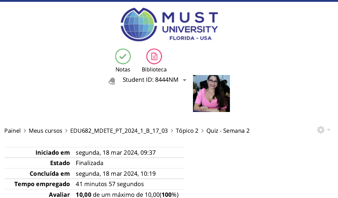 <p>Painel Meus cursos EDU682_MDETE_PT_2024_1_B_17_03 Tópico 2 Quiz - Semana 2</p><p>Student ID: 8444NM</p><p>Notas Biblioteca</p><p>Iniciado em segunda, 18 mar 2024, 09:37</p><p>Estado Finalizada</p><p>Concluída em segunda, 18 mar 2024, 10:19</p><p>Tempo empregado 41 minutos 57 segundos</p><p>Avaliar 10,00 de um máximo de 10,00(100%)</p><p> </p><p>https://my.mustedu.com/my/</p><p>https://my.mustedu.com/course/view.php?id=1066</p><p>https://my.mustedu.com/course/view.php?id=1066#section-2</p><p>https://my.mustedu.com/mod/quiz/view.php?id=85885</p><p>https://my.mustedu.com/</p><p>https://my.mustedu.com/</p><p>https://my.mustedu.com/user/view.php?id=8222&course=1066</p><p>https://my.mustedu.com/custom/minhas_notas.php</p><p>Questão 1 Correto Atingiu 1,00 de 1,00</p><p>Durante as aulas sobre a Aprendizagem Baseada em Equipes, foram apresentadas algumas</p><p>características. Dentre as alternativas abaixo, assinale a única que contém uma característica</p><p>correta.</p><p>Escolha uma opção:</p><p>a. Para que a metodologia funcione, os estudantes precisam conhecer previamente como</p><p>trabalhar em equipe.</p><p>b. Os alunos não precisam se preparar previamente para desenvolver esta atividade em</p><p>sala de aula.</p><p>c.</p><p>Nesta metodologia, os estudantes são divididos em grupos que precisam trabalhar no</p><p>mesmo espaço físico e precisam desenvolver uma atividade que é proposta pelo professor,</p><p>em que �ca evidenciada a necessidade de construção e elaboração do conhecimento de</p><p>forma conjunta.</p><p>d. É uma metodologia que está baseada no behaviorismo.</p><p>Sua resposta está correta.</p><p>A resposta correta é:</p><p>Nesta metodologia, os estudantes são divididos em grupos que precisam trabalhar no mesmo espaço</p><p>físico e precisam desenvolver uma atividade que é proposta pelo professor, em que �ca evidenciada a</p><p>necessidade de construção e elaboração do conhecimento de forma conjunta.</p><p>Questão 2 Correto Atingiu 1,00 de 1,00</p><p>A Aprendizagem Baseada em Equipes tem como um de seus objetivos desenvolver nos alunos</p><p>níveis avançados de aprendizagem, como realizar análises, aplicações, avaliações e ser criativo.</p><p>Vimos que há 4 aspectos que são essenciais para que eles sejam atingidos. Dentre as</p><p>seguintes alternativas, assinale a que contém um desses aspectos.</p><p>Escolha uma opção:</p><p>a. É preciso responsabilizar os estudantes pela qualidade desenvolvida no trabalho</p><p>individual e grupal.</p><p>b. É preciso propor tarefas para a equipe, que promovam o aprendizado individual. O</p><p>grupo não é relevante.</p><p>c. Não é necessário que o feedback ocorra com frequência, pode nem ocorrer visto que os</p><p>estudantes estão acompanhando tudo.</p><p>d. Não é necessário que as equipes sejam permanentes, podem ser trocadas no meio do</p><p>processo.</p><p>Sua resposta está correta.</p><p>A resposta correta é: É preciso responsabilizar os estudantes pela qualidade desenvolvida no trabalho</p><p>individual e grupal.</p><p>Questão 3 Correto Atingiu 1,00 de 1,00</p><p>Vimos que a Peer Instruction apresenta alguns objetivos inerentes. Leia as alternativas abaixo</p><p>e assinale a que contenha um objetivo pertinente.</p><p>Escolha uma opção:</p><p>a. Não é preciso que os estudantes aprendam com fontes de estudo primárias.</p><p>b. Não é necessária a interação em sala de aula neste tipo de metodologia.</p><p>c. Aumentar a produtividade dos alunos, assim como o seu interesse pelas aulas;</p><p>d. O feedback precisa acontecer, porém ao �nalizar o semestre ou ano, para melhor</p><p>análise do que foi desenvolvido.</p><p>Sua resposta está correta.</p><p>A resposta correta é: Aumentar a produtividade dos alunos, assim como o seu interesse pelas aulas;</p><p>Questão 4 Correto Atingiu 1,00 de 1,00</p><p>Identi�que, dentre as alternativas abaixo, uma vantagem da Aprendizagem Baseada em</p><p>Problemas.</p><p>Escolha uma opção:</p><p>a. A di�culdade em se institucionalizar uma inovação e o medo de mudanças, pode</p><p>inviabilizar a sua aplicação, não só pelos professores, mas os alunos também podem se</p><p>mostrar resistentes, visto que nem todos são ou querem ser proativos.</p><p>b. Desenvolvimento do senso crítico e das habilidades de comunicação.</p><p>c. Não é centrado no estudante.</p><p>d. Não há transmissão tradicional de conhecimento, o que pode causar desconforto nos</p><p>professores.</p><p>Sua resposta está correta.</p><p>A resposta correta é: Desenvolvimento do senso crítico e das habilidades de comunicação.</p><p>Questão 5 Correto Atingiu 1,00 de 1,00</p><p>Dentre as alternativas abaixo, identi�que qual a função do professor na Instrução entre Pares.</p><p>Escolha uma opção:</p><p>a. A função do professor é auxiliar o estudante a reaprender coisas que ele já aprendeu,</p><p>mas que não estão devidamente assimiladas, portanto, precisa reforçar.</p><p>b. A função do professor é auxiliar o estudante a aprender coisas que ele não conseguiria</p><p>aprender sozinho.</p><p>c. A função do professor é auxiliar o estudante a relembrar coisas que ele aprendeu há</p><p>algum tempo.</p><p>d. A função do professor é auxiliar o estudante a aprender coisas que ele consegue</p><p>aprender sozinho.</p><p>Sua resposta está correta.</p><p>A resposta correta é: A função do professor é auxiliar o estudante a aprender coisas que ele não</p><p>conseguiria aprender sozinho.</p><p>Questão 6 Correto Atingiu 1,00 de 1,00</p><p>Vimos, em nossas aulas, que a Instrução pelos Pares surge depois da compreensão do</p><p>conceito de Zona de Desenvolvimento Proximal (ZDP), de Vygotsky. Ao estudar a</p><p>aprendizagem do ser humano, ele identi�cou que existem coisas que as pessoas aprendem a</p><p>fazer sozinhas, coisas que aprendem com o auxílio de outras pessoas e coisas que elas ainda</p><p>não conseguem aprender (em determi