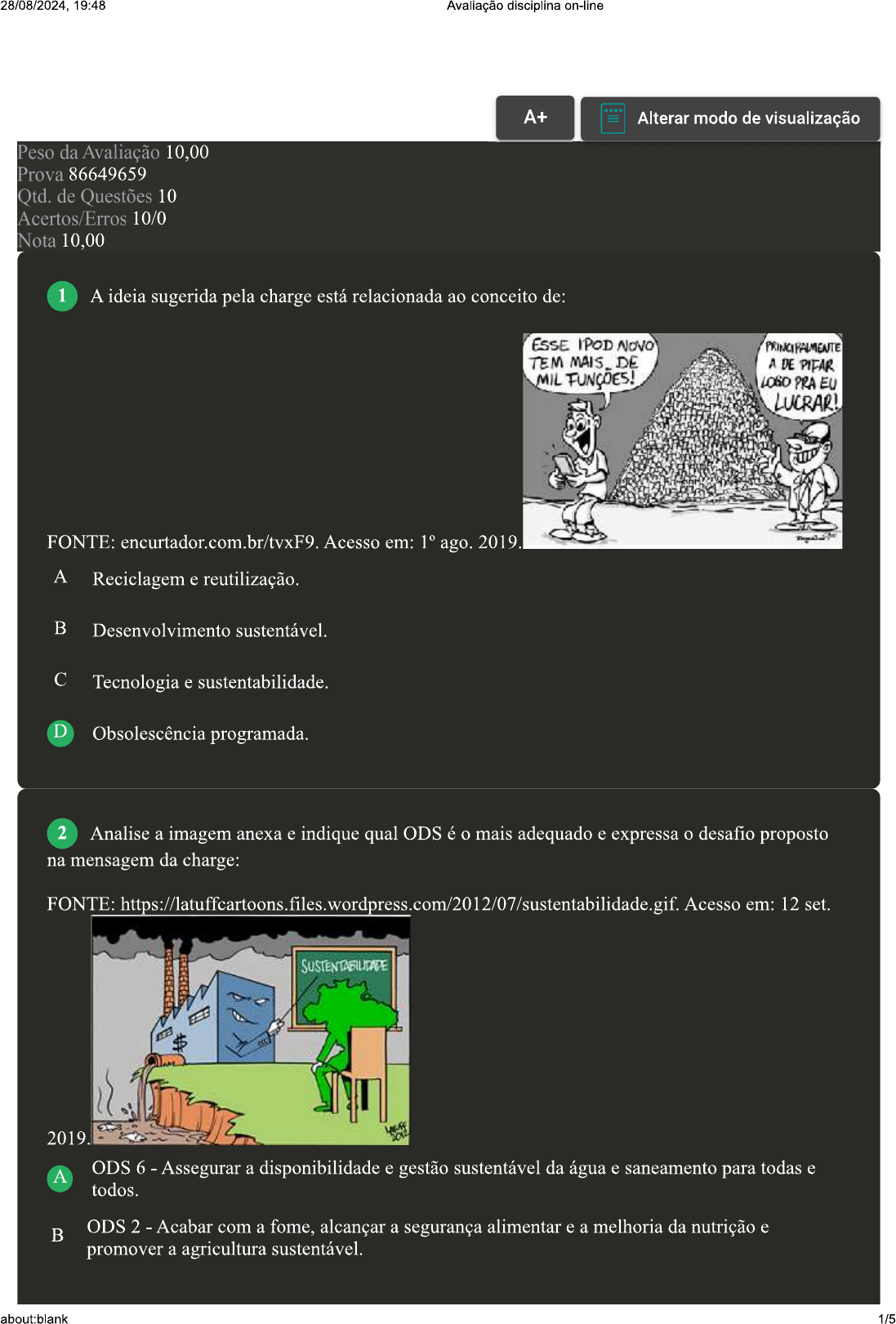 <p>28/08/2024, 19:48 Avaliação disciplina on-line A+ Alterar modo de visualização Peso da Avaliação 10,00 Prova 86649659 Qtd. de Questões 10 Acertos/Erros 10/0 Nota 10,00 1 A ideia sugerida pela charge está relacionada ao conceito de: ESSE IPOD NOVO PRINCIPALMENTE TEM DE A DE PIFAR MIL FUNÇÕES! PRA EU LUCRAR! FONTE: encurtador.com.br/tvxF9. Acesso em: 1° ago. 2019. A Reciclagem e reutilização. B Desenvolvimento sustentável. C Tecnologia e sustentabilidade. D Obsolescência programada. 2 Analise a imagem anexa e indique qual ODS é mais adequado e expressa desafio proposto na mensagem da charge: FONTE:https://latuffcartoons.files.wordpress.com/2012/07/sustentabilidade.gif.Acesso em: 12 set. 2019 A ODS 6 Assegurar a disponibilidade e gestão sustentável da água e saneamento para todas e todos. B ODS 2 - Acabar com a fome, alcançar a segurança alimentar e a melhoria da nutrição e promover a agricultura sustentável.</p><p>28/08/2024, 19:48 Avaliação disciplina on-line C ODS 11 Tornar as cidades e os assentamentos humanos inclusivos, seguros, resilientes e sustentáveis. D ODS 7 Assegurar acesso confiável, sustentável, moderno e preço acessível à energia para todas e todos. 3 Quando escolhemos um produto, por exemplo, na prateleira de um supermercado, espera-se que as informações constantes no rótulo sejam suficientes para tomar a decisão entre uma opção e outra. Esse direito à informação está previsto na Política Nacional de Relações de Consumo. Onde consta esta política? A Código de Defesa do Consumidor. B Código de Defesa do Idoso. C Código de Defesa do Trabalhador. D Código de Defesa do Meio Ambiente. 4 Se 20% da população mundial, que habita principalmente os países do hemisfério norte. consome 80% dos recursos naturais e energia do planeta e produz mais de 80% da poluição e degradação dos ecossistemas; e 80% da população mundial, que habita principalmente os países pobres do hemisfério sul, possuem apenas 20% dos recursos naturais. assinale a alternativa CORRETA: FONTE: Acesso em: 12 set. 2019 (adaptado). A Se os países do sul alcançarem os mesmos padrões de consumo dos países do norte está garantida a sustentabilidade do planeta. B Os países pobres do hemisfério sul são os principais responsáveis pela poluição mundial e os países ricos do hemisfério norte tornam mundo mais sustentável. A desigualdade apresentada entre os países do hemisfério sul e norte com relação ao consumo refletem a necessidade de união de esforços em prol da sustentabilidade planetária. D Quando a riqueza supera a ética ambiental e consumo domina os desejos humanos, a consequência será a sustentabilidade. 5 Considerando as informações da figura anexa, analise as sentenças a seguir: I- O consumidor é levado a adquirir produtos que não necessita para viver, mas que agrada seu ego. II- Pelo excesso de consumo muitos se endividam, chegando ao ponto de ter seu nome em listas de inadimplentes. III- A figura expressa a ideia de consumo sustentável. IV- Fica evidente a importância do nome nas embalagens para promover a sustentabilidade. Assinale a alternativa CORRETA: about:blank 2/5</p><p>28/08/2024, 19:48 Avaliação disciplina on-line FONTE: http://marianomarinho.blogspot.com/2015/09/humor.htm Acesso em: 12 set. 2019. Acilo o PROCURA NOME NAS SPC QUE LATINHAS DO ACHA- REFRIGERANTE + A As sentenças I, III e IV estão corretas. B As sentenças III e IV estão corretas. C As sentenças I e II estão corretas. D As sentenças II e III estão corretas. 6 Observe a figura e. a partir das ideias sugeridas, avalie as asserções a seguir e a relação proposta entre elas. I- A utilização dos recursos naturais é imprescindível para a sobrevivência humana e cada pessoa deve utilizar esses recursos para realizar seus PORQUE II- Construir móveis utilizando madeiras de reflorestamento é uma forma de poupar florestas nativas e assim favorecer O desenvolvimento sustentável. Mãe?! Um armário ou uma 0 que eu ser mesinho de centrol quando crescer?? Assinale a alternativa CORRETA: A As asserções I e II são proposições verdadeiras, mas a II não é uma justificativa correta de I. B A asserção I é uma proposição falsa, e a II é uma proposição verdadeira. C A asserção I é uma proposição verdadeira, e a II é uma proposição falsa. D As asserções I e II são proposições verdadeiras, e a II é uma justificativa correta da I. about:blank 3/5</p><p>28/08/2024, 19:48 Avaliação disciplina on-line 7 O conceito de resiliência pode ser entendido como a capacidade de se recuperar após sofrer um dano. Neste sentido, com relação à resiliência de nosso planeta, assinale a alternativa CORRETA: A O consumidor consciente pode evitar que a resiliência do planeta seja afetada pelo homem e assim promover a desigualdade. B Quem consome de modo sustentável reduz a resiliência do planeta Terra. C O a contaminação dos rios e mares, acúmulo de lixo e resíduos diversos são exemplos que aumentam a resiliência do planeta. D O consumismo está afetando negativamente os limites de resiliência da Terra 8 Materiais como plástico, papel, metal e vidro são facilmente reconhecidos como potencialmente recicláveis, contudo, é possível constatar que boa parte da população não sabe onde destinar corretamente os resíduos eletrônicos como pilhas, baterias, aparelhos celulares, etc. Como é denominado conjunto de ações que reintegra esses resíduos na cadeia produtiva? A Logística contemplativa. B Logística contínua. C Logística permanente. D Logística reversa. 9 Ao visualizar essa questão você está utilizando recursos naturais! Já pensou nisso? Observe que os smartphones, tablets, computadores, notebooks e quaisquer outros meios de comunicação são fabricados a partir de alguma matéria-prima de origem natural, como minérios de ferro e derivados do petróleo. Sobre as relações de consumo e sustentabilidade, analise 