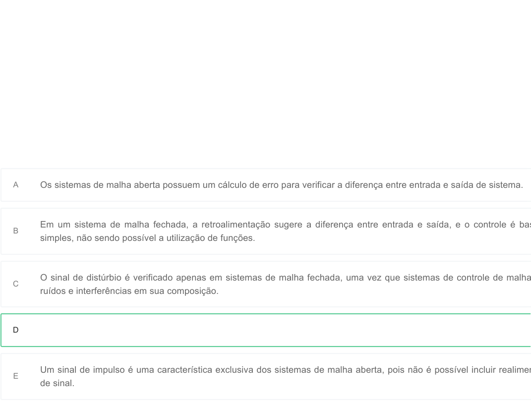 <p>Leia o trecho a seguir:</p><p>Denominamos sistemas de controle de malha fechada (ou realimentação) aqueles os quais a saída tem um efeito na entrada de</p><p>tal maneira que esta se ajuste com base na saída. Um sistema poderia ser o sistema de controle de temperatura de um</p><p>ambiente "medindo-se a temperatura ambiente real e comparando-a com a temperatura de referência (temperatura desejada), o</p><p>termostato ativa ou desativa o equipamento de aquecimento ou resfriamento (...)" (OGATA, 2010, p. 06).</p><p>OGATA, K. Engenharia de controle moderno. 5. ed. São Paulo: Pearson Prentice Hall, 2010.</p><p>A partir do texto e dos princípios de sistemas de malha aberta e fechada, assinale a alternativa correta.</p><p>Selecione a resposta:</p><p>D Tratamos sistemas de controle de malha aberta como aqueles em que a ação de controle é totalmente independente da</p><p>A Os sistemas de malha aberta possuem um cálculo de erro para verificar a diferença entre entrada e saída de sistema.</p><p>B</p><p>Em um sistema de malha fechada, a retroalimentação sugere a diferença entre entrada e saída, e o controle é bas</p><p>simples, não sendo possível a utilização de funções.</p><p>C</p><p>O sinal de distúrbio é verificado apenas em sistemas de malha fechada, uma vez que sistemas de controle de malha</p><p>ruídos e interferências em sua composição.</p><p>E</p><p>Um sinal de impulso é uma característica exclusiva dos sistemas de malha aberta, pois não é possível incluir realimen</p><p>de sinal.</p>