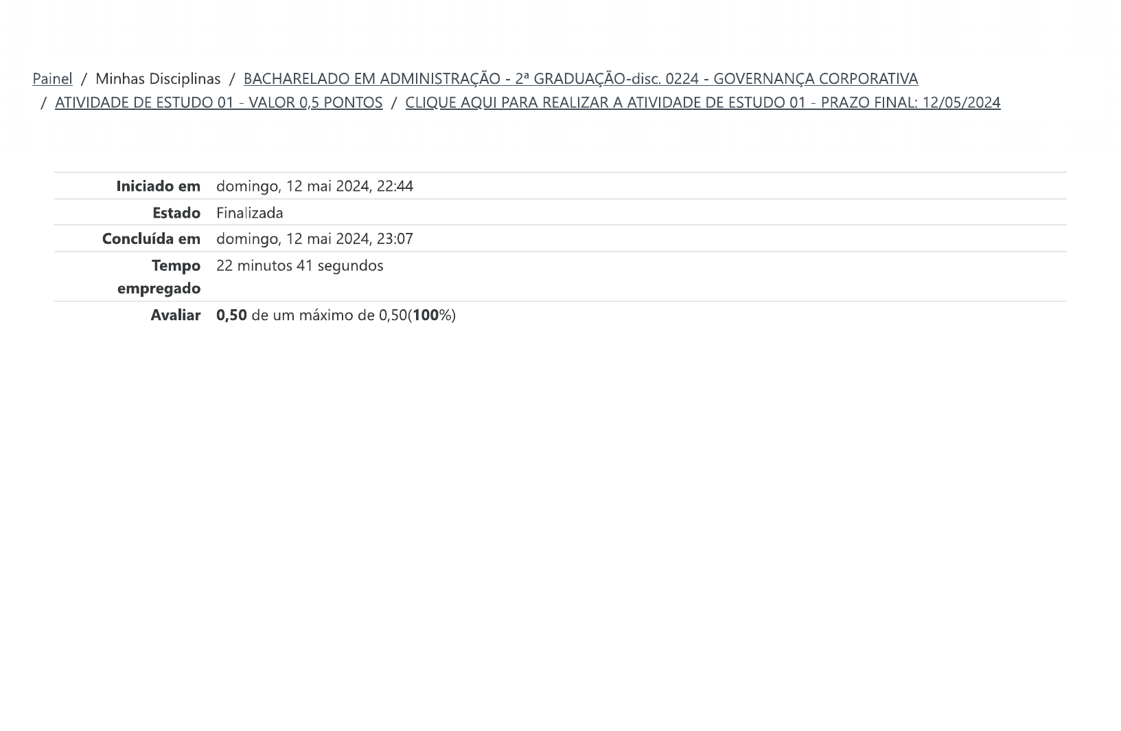 <p>Painel / Minhas Disciplinas / BACHARELADO EM ADMINISTRAÇÃO - GRADUAÇÃO-disc. 0224 - GOVERNANÇA CORPORATIVA / ATIVIDADE DE ESTUDO 01 - VALOR 0,5 PONTOS / CLIQUE AQUI PARA REALIZAR A ATIVIDADE DE ESTUDO 01 - PRAZO FINAL: 12/05/2024 Iniciado em domingo, 12 mai 2024, 22:44 Estado Finalizada Concluída em domingo, 12 mai 2024, 23:07 Tempo 22 minutos 41 segundos empregado Avaliar 0,50 de um máximo de 0,50(100%)</p><p>Questão 1 Completo Não existe um conceito único para definir a expressão governança corporativa, pois cada autor e cada organização Atingiu 0,05 de formam seus próprios conceitos. De acordo com os nossos estudos, todos os conceitos a seguir referem-se à Governança 0,05 Corporativa, exceto: a. Para a Organização para Cooperação e Desenvolvimento Econômico OCDE (1999), a governança corporativa é o sistema pelo qual as corporações são dirigidas e controladas. b. Sob outro enfoque, Silva (2006, p. 5) define que a governança corporativa é "um conjunto de princípios e práticas que procura minimizar os potenciais conflitos de interesse entre os diferentes agentes da companhia (stakeholders) visando reduzir o custo de capital e aumentar tanto o valor da empresa quanto o retorno aos seus acionistas". C. Enquanto para Silveira (2010) a governança corporativa é um conjunto de mecanismos que funciona para assegurar que as tomadas de decisões referentes à corporação proporcionem a maximização de geração de valor de longo prazo para o negócio. d. O Conselho Federal de Contabilidade (CFC) define Governança Corporativa como uma área/setor das empresas comerciais, com função estritamente comercial. e. Já o Instituto Brasileiro de Governança Corporativa IBGC (2009) define a governança corporativa como um "sistema pelo qual as organizações são dirigidas, monitoradas e incentivadas, envolvendo os relacionamentos entre proprietários, conselho de administração, diretoria e órgãos de controle". Sua resposta está correta.</p><p>Questão 2 Completo Inicialmente, a governança corporativa estava focada no conflito entre o agente e o principal (JENSEN e MECKING, 1976). Atingiu 0,05 de Não é de hoje que a conduta entre ambos vem sendo discutida, mas o grande marco histórico que trouxe realmente a 0,05 orientação da governança aconteceu mais precisamente no ano de 1992, ano em que houve a divulgação do Relatório Verifique, segundo as seguintes alternativas, qual palavra preenche corretamente a lacuna acima. a. Administração. b. Diretoria. C. Auditoria Externa. d. Cadbury. e. Auditoria Interna. Sua resposta está correta.</p><p>Questão 3 Completo Ao longo do século XX, a economia dos diferentes países tornou-se cada vez mais marcada pela integração aos Atingiu 0,05 de dinamismos do comércio internacional, assim como pela expansão das transações financeiras em escala global (PORTAL 0,05 IBGC, 2018). Assinale a alternativa que melhor ilustra os fatos ocorridos nas companhias dessas nações. a. As companhias foram objeto de grandes transformações, uma vez que o acentuado ritmo de crescimento de suas atividades promoveu uma readequação de sua estrutura de controle, decorrente da separação entre a propriedade e o mercado de capitais. b. As companhias foram objeto de várias mudanças, uma vez que o acelerado ritmo de crescimento de suas atividades não promoveu uma readequação de sua estrutura de controle, decorrente da separação entre a propriedade e a gestão empresarial. C. As companhias foram objeto de sensíveis transformações, uma vez que o acentuado ritmo de crescimento de suas atividades promoveu uma readequação de sua estrutura de controle, decorrente da separação entre a propriedade e a gestão empresarial. d. As companhias foram objeto de sensíveis mudanças, uma vez que o exaustivo ritmo de crescimento de suas atividades não promoveu uma readequação de sua estrutura de controle, decorrente da separação entre a propriedade e a gestão administrativa. e. As companhias não foram objetos de imensas transformações, uma vez que o acentuado ritmo de crescimento d suas atividades promoveu uma readequação de sua estrutura de controle, decorrente da separação entre a propriedade e a gestão econômica. Sua resposta está correta.</p><p>Questão 4 Completo É por meio da governança, que as empresas desenvolvem os mecanismos de controle, pois Atingiu 0,05 de 0,05 Assinale a alterativa correta. a. Dessa maneira, praticamente todas as ações executadas tendem a estar em conformidade com os seus valores e conforme as questões regulamentares e éticas. b. Sem controle, tudo estará arruinado na organização. C. Somente a governança possibilita o controle empresarial. d. É dessa maneira que as empresas poderão ter lucro. e. Com a implantação da governança, se os controles não forem desenvolvidos, os gestores poderão ser até presos, devido à governança constar no código penal. Sua resposta está correta.</p><p>Questão 5 Completo primeiro marco na Governança Corporativa foi a iniciativa de um franco atirador, ativista de resultados, inconformado Atingiu 0,05 de com a passividade dos acionistas e com práticas oportunistas dos executivos das corporações dos EUA. O nome desta 0,05 importante personagem histórica da Governança Corporativa é: Assinale a correta. a. Robert Macgregor. b. Robert Monks. C. Robert Davdson. d. Charles Hudson. e. Charles Chiavenatto. Sua resposta está correta.</p><p>Questão 6 Completo Assinale a alternativa correta, no que se refere à Teoria da Agência. Atingiu 0,05 de 0,05 a. O relacionamento de agência nada mais é que o relacionamento entre os acionistas e administradores. b. controle e de gestão das firmas tiveram sua estrutura alterada em conjunto com as mudanças ocorridas no direito. C. desenvolvimento da Teoria da agência foi obra de Jason e Melhen (1970). d. ponto focal desta teoria é a existência de um sistema de compensação por parte do ator secun