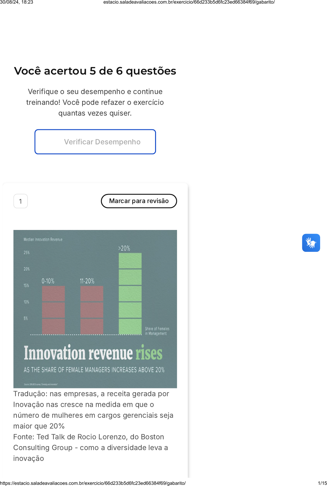 <p>Você acertou 5 de 6 questões</p><p>Verifique o seu desempenho e continue</p><p>treinando! Você pode refazer o exercício</p><p>quantas vezes quiser.</p><p>Verificar Desempenho</p><p>1 Marcar para revisão</p><p>Tradução: nas empresas, a receita gerada por</p><p>Inovação nas cresce na medida em que o</p><p>número de mulheres em cargos gerenciais seja</p><p>maior que 20%</p><p>Fonte: Ted Talk de Rocio Lorenzo, do Boston</p><p>Consulting Group - como a diversidade leva a</p><p>inovação</p><p>30/08/24, 18:23 estacio.saladeavaliacoes.com.br/exercicio/66d233b5d6fc23ed66384f69/gabarito/</p><p>https://estacio.saladeavaliacoes.com.br/exercicio/66d233b5d6fc23ed66384f69/gabarito/ 1/15</p><p>A</p><p>B</p><p>C</p><p>No contexto da diversidade nas equipes de</p><p>trabalho como estratégia profissional e</p><p>empresarial, o que esse gráfico mostra é que:</p><p>é necessário ter pelo 20 mulheres</p><p>trabalhando numa startup para que ela</p><p>consiga receber aporte financeiro de</p><p>investidores anjo</p><p>só quando uma empresa tem</p><p>pelo menos 20 de mulheres no seu</p><p>conselho diretor que ela começa a ter</p><p>lucro</p><p>como as mulheres são mais</p><p>cuidadosas com finanças, a partir do</p><p>momento que 20% dos cargos</p><p>gerenciais são ocupados por</p><p>mulheres, a gestão financeira melhora</p><p>e são evitados gastos desnecessários</p><p>e investimentos de baixo retorno,</p><p>aumentando a receita</p><p>30/08/24, 18:23 estacio.saladeavaliacoes.com.br/exercicio/66d233b5d6fc23ed66384f69/gabarito/</p><p>https://estacio.saladeavaliacoes.com.br/exercicio/66d233b5d6fc23ed66384f69/gabarito/ 2/15</p><p>D</p><p>E</p><p>só a partir do momento que uma</p><p>empresa possui mais de 20% de</p><p>mulheres em cargos de liderança,</p><p>gerencia, diretoria, presidência, é que</p><p>a mudança para o mind-set e os</p><p>processos em torno da inovação</p><p>começam a acontecer efetivamente a</p><p>a receita advinda da inovação começa</p><p>a se tornar significativa</p><p>é preciso ter mais de 20% de</p><p>mulheres em cargos gerenciais para</p><p>que outras mulheres sejam</p><p>contratadas para a empresa, e só uma</p><p>empresa onde todos os funcionários</p><p>são mulheres é capaz de gerar receita</p><p>a partir da inovação</p><p>Resposta correta</p><p>Parabéns, você selecionou a</p><p>alternativa correta. Confira o</p><p>gabarito comentado!</p><p>Gabarito Comentado</p><p>O grafico acima mostra que, para que a</p><p>diversidade de gênero tenha um impacto</p><p>sobre a inovação nas empresas - e na</p><p>geração de resultados financeiros a partir</p><p>dessa inovação - é preciso ter mais de</p><p>20% de mulheres na liderança. A amostra</p><p>da pesquisa foi dividida em três grupos:</p><p>somente no grupo com mais de 20% de</p><p>mulheres na liderança aparece um salto</p><p>claro na receita de inovação para níveis</p><p>acima da média. Assim, a experiência e os</p><p>dados mostram que é necessário massa</p><p>crítica para mover a agulha.</p><p>30/08/24, 18:23 estacio.saladeavaliacoes.com.br/exercicio/66d233b5d6fc23ed66384f69/gabarito/</p><p>https://estacio.saladeavaliacoes.com.br/exercicio/66d233b5d6fc23ed66384f69/gabarito/ 3/15</p><p>A</p><p>B</p><p>C</p><p>2 Marcar para revisão</p><p>O atual cenário do sistema produtivo mundial é</p><p>caracterizado pela chamada revolução técnico-</p><p>científica-informacional, em que a capacidade</p><p>produtiva está diretamente vinculada à</p><p>introdução de novas tecnologias e informação.</p><p>Nesse sentido, alguns setores como a</p><p>informática, a robótica, as telecomunicações, a</p><p>engenharia genética e o uso de novos materiais</p><p>tornam-se cada vez mais importantes no</p><p>cenário econômico mundial. Nesse sentido,</p><p>pode-se afirmar CORRETAMENTE que o Brasil</p><p>tem enfrentado dificuldades para concorrer</p><p>com as grandes potências econômicas do</p><p>globo, sobretudo em função da baixa qualidade</p><p>de sua mão de obra, reflexo de um sistema</p><p>educacional deficiente.</p><p>vem ocupando cada vez mais espaço</p><p>no cenário internacional, estando</p><p>entre os cinco maiores detentores de</p><p>patentes tecnológicas, graças aos</p><p>elevados investimentos públicos em</p><p>pesquisas científicas.</p><p>tem se destacado na produção de</p><p>novas tecnologias graças a uma</p><p>política protecionista do governo que</p><p>tem criado reservas de mercado para</p><p>as indústrias nacionais, a exemplo do</p><p>mercado da informática.</p><p>tem adquirido grande destaque nas</p><p>últimas décadas, sobretudo em virtude</p><p>dos fortes investimentos privados na</p><p>qualificação de sua mão de obra.</p><p>30/08/24, 18:23 estacio.saladeavaliacoes.com.br/exercicio/66d233b5d6fc23ed66384f69/gabarito/</p><p>https://estacio.saladeavaliacoes.com.br/exercicio/66d233b5d6fc23ed66384f69/gabarito/ 4/15</p><p>D</p><p>E</p><p>tem apresentado uma posição</p><p>periférica no cenário técnico-científico</p><p>internacional em razão da sua</p><p>condição de exportador de</p><p>commodities, que ocupam mais de</p><p>90% do valor das exportações</p><p>nacionais.</p><p>tem enfrentado dificuldades para</p><p>concorrer com as grandes potências</p><p>econômicas do globo, sobretudo em</p><p>função da baixa qualidade de sua mão</p><p>de obra, reflexo de um sistema</p><p>educacional deficiente.</p><p>Resposta correta</p><p>Parabéns, você selecionou a</p><p>alternativa correta. Confira o</p><p>gabarito comentado!</p><p>Gabarito Comentado</p><p>Um dos imperativos da economia criativa,</p><p>que está ligado aos desafios do novo</p><p>profissional no contexto do impacto da</p><p>tecnologia na empregabilidade e no</p><p>ambiente de trabalho, é a capacitação e</p><p>formação de indivíduos para a geração de</p><p>capital intelectual e criativo, que depende</p><p>de um interesse e investimento, tanto</p><p>pessoal quanto estrutural de governos e</p><p>so