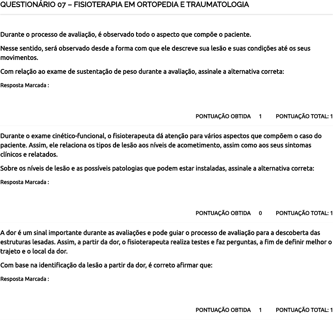 <p>QUESTIONÁRIO 07 – FISIOTERAPIA EM ORTOPEDIA E TRAUMATOLOGIA</p><p>PONTUAÇÃO TOTAL: 1PONTUAÇÃO OBTIDA 1</p><p>Durante o processo de avaliação, é observado todo o aspecto que compõe o paciente.</p><p>Nesse sentido, será observado desde a forma com que ele descreve sua lesão e suas condições até os seus</p><p>movimentos.</p><p>Com relação ao exame de sustentação de peso durante a avaliação, assinale a alternativa correta:</p><p>Resposta Marcada :</p><p>O �sioterapeuta deve ter precaução ao realizar esse teste, visto que em alguns casos o paciente não está liberado</p><p>para fazer a descarga.</p><p>PONTUAÇÃO TOTAL: 1PONTUAÇÃO OBTIDA 0</p><p>Durante o exame cinético-funcional, o �sioterapeuta dá atenção para vários aspectos que compõem o caso do</p><p>paciente. Assim, ele relaciona os tipos de lesão aos níveis de acometimento, assim como aos seus sintomas</p><p>clínicos e relatados.</p><p>Sobre os níveis de lesão e as possíveis patologias que podem estar instaladas, assinale a alternativa correta:</p><p>Resposta Marcada :</p><p>Na lesão neurológica, pode haver o alongamento do nervo �bular profundo devido à tenossinovite dos músculos</p><p>�bulares.</p><p>PONTUAÇÃO TOTAL: 1PONTUAÇÃO OBTIDA 1</p><p>A dor é um sinal importante durante as avaliações e pode guiar o processo de avaliação para a descoberta das</p><p>estruturas lesadas. Assim, a partir da dor, o �sioterapeuta realiza testes e faz perguntas, a �m de de�nir melhor o</p><p>trajeto e o local da dor.</p><p>Com base na identi�cação da lesão a partir da dor, é correto a�rmar que:</p><p>Resposta Marcada :</p><p>São fatores importantes para a avaliação da dor: o horário, o tipo, os movimentos que a reproduzem e o</p><p>mecanismo de lesão.</p><p>29/08/2024, 10:43 Course Status – AVA Saúde Unifaveni</p><p>https://ava.saude.unifaveni.com.br/course-status/ 1/2</p><p>2 / 5</p><p>PONTUAÇÃO TOTAL: 1PONTUAÇÃO OBTIDA 0</p><p>O processo de avaliação cinético-funcional consiste em vários tipos de avaliação no exame físico. Essas avaliações</p><p>serão direcionadas pelo �sioterapeuta a partir da queixa do paciente e da sintomatologia que vai sendo</p><p>descoberta por ele. Nesse sentido, é importante que ele domine todas as técnicas de avaliação para realizar uma</p><p>investigação completa.</p><p>Com relação às técnicas �sioterapêuticas que podem ser adotadas durante a avaliação, assinale a alternativa</p><p>correta:</p><p>Resposta Marcada :</p><p>O teste de pronação da articulação talocalcânea pode ser realizado por �eximetria ou goniometria, e o local de</p><p>avaliação é a linha do tendão de Aquiles.</p><p>PONTUAÇÃO TOTAL: 1PONTUAÇÃO OBTIDA 0</p><p>Há diversos tipos de tratamentos para distúrbios e patologias que envolvem o tornozelo e o pé. Nesse sentido, o</p><p>�sioterapeuta pode contar com diversos recursos, desde os mais simples e acessíveis até os que envolvem maior</p><p>investimento e cursos de especialidades.</p><p>Sobre a aplicação dos métodos e das técnicas nos tratamentos, assinale a alternativa correta:</p><p>Resposta Marcada :</p><p>Os exercícios de equilíbrio e força constituem a fase aguda do tratamento, podendo o �sioterapeuta evoluir a</p><p>cada semana, progredindo o paciente.</p><p>Total de Pontos</p><p>29/08/2024, 10:43 Course Status – AVA Saúde Unifaveni</p><p>https://ava.saude.unifaveni.com.br/course-status/ 2/2</p>