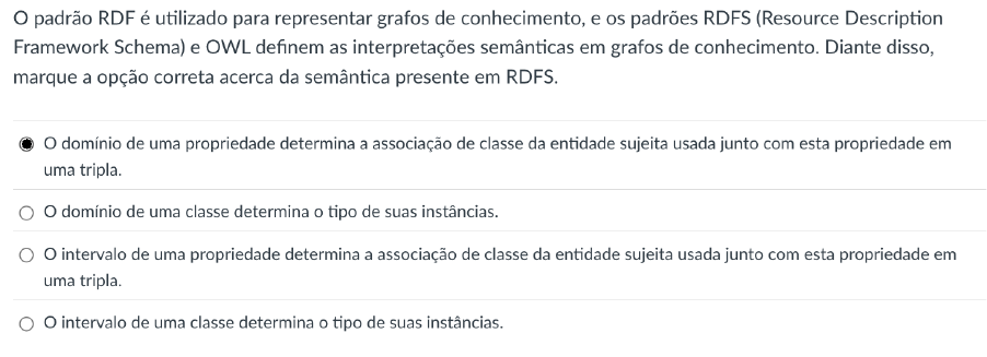 <p>@prefix rdf: <http://www.w3.org/1999/02/22-rdf-syntax-ns#>. @prefix ex:</p><p><http://example.org/StarWars#>. ex:Imperator ex:annoyedBy [ a rdf:Statement ;</p><p>rdf:subject ex:Luke ; rdf:predicate ex:foundOut ; rdf:object [a rdf:Statement ;</p><p>rdf:subject ex:DarthVader ; rdf:predicate ex:fatherOf ; rdf:object ex:Luke] ] .</p><p>O Imperador (ex</p><p>) está irritado (ex</p><p>) porque Luke (ex</p><p>) descobriu (ex</p><p>) que Darth Vader (ex</p><p>) é pai (ex</p><p>) de Luke.</p><p>Os conceitos RDF Schema são fornecidos sob a forma de um vocabulário RDF. A esse</p><p>respeito, registre V, para verdadeiro, ou F, para falso, conforme o tipo de conhecimento</p><p>que pode ser expresso com RDFS: [ ] fatos que não devem ser declarados [ ] domínio e</p><p>intervalo de propriedades [ ] disjunção de classe e propriedade [ ] hierarquias de</p><p>classes e propriedades</p><p>• [F] Fatos que não devem ser declarados: RDF Schema (RDFS) não trata de</p><p>restrições sobre fatos que não devem ser declarados. Sua função é mais</p><p>voltada para a definição de classes e propriedades e suas relações.</p><p>• [V] Domínio e intervalo de propriedades: RDFS permite definir o domínio</p><p>(rdfs:domain) e o intervalo (rdfs:range) das propriedades, especificando a</p><p>que classes essas propriedades pertencem e quais tipos de valores elas podem</p><p>ter.</p><p>• [F] Disjunção de classe e propriedade: RDFS não fornece suporte para a</p><p>disjunção (ou exclusividade) entre classes e propriedades. Esse tipo de</p><p>inferência ou restrição é mais típico de outras linguagens de ontologia, como</p><p>OWL (Web Ontology Language).</p><p>• [V] Hierarquias de classes e propriedades: RDFS permite a definição de</p><p>hierarquias de classes (rdfs:subClassOf) e propriedades</p><p>(rdfs:subPropertyOf), permitindo que se estabeleça relações de herança</p><p>entre classes e propriedades.</p>