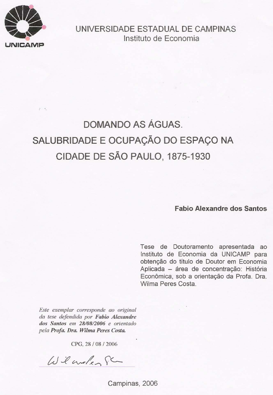 <p>i</p><p>ii</p><p>iii</p><p>AGRADECIMENTOS</p><p>Ao findar este percurso sobre as águas que atravessam a cidade de São Paulo cabe</p><p>agradecer e lembrar a uma série de pessoas e instituições o quão fundamentais elas foram</p><p>para que se pudesse chegar ao “porto final”, que ora este texto se encontra.</p><p>À minha família, Penteado, Sônia, Viviane e Adriano, que mais uma vez</p><p>acompanharam uma viagem acadêmica, às vezes sobre águas revoltas.</p><p>Aos imprescindíveis amigos de todos os lugares que prefiro não nomeá-los para não</p><p>incorrer em possíveis injustiças, mas que acompanharam a pesquisa e a redação da tese, e</p><p>que agüentaram e me amparam nas angústias e nas ansiedades, mas também nas realizações</p><p>e nas alegrias. Em especial a três pessoas de extrema força: Aparecida Maria (Ciça) e</p><p>Cláudia Tessari; e, ainda, a Lisandra Castro, pela presença e incentivo na reta final.</p><p>À Wilma Peres Costa, orientadora e amiga, pela paciência, competência,</p><p>responsabilidade e comprometimento na condução da pesquisa, consolidada ao longo dos</p><p>anos de trabalho acadêmico conjunto.</p><p>Aos demais Mestres do Instituto de Economia da Unicamp, que sempre revelaram</p><p>novas formas de interpretar este mundo permeado de problemas e contradições, e que me</p><p>instrumentalizaram a refletir sobre ele. Com a mesma consideração e respeito, aos</p><p>funcionários e amigos da Secretaria de pós-graduação, da Biblioteca e do SPD do Instituto</p><p>de Economia. Todos foram muito importantes neste navegar.</p><p>Aos muitos e muitos funcionários dos inúmeros arquivos, museus e instituições que</p><p>abrigam as fontes que dão vida à pesquisa histórica e que serviram para o embasamento</p><p>deste trabalho.</p><p>À Fundação de Amparo à Pesquisa do Estado de São Paulo (Fapesp), a quem</p><p>agradeço pelo financiamento desta pesquisa que ora se finda, e também pelos apoios e</p><p>financiamentos a mim concedidos desde a graduação. Da mesma forma, aos professores</p><p>pareceristas que acompanham anonimante o andar das pesquisas.</p><p>Com todos compartilho as contribuições que este estudo possa dar para a</p><p>compreensão de uma pequena parte da história paulistana. Exceto as lacunas e os possíveis</p><p>problemas que possam surgir ao longo do texto, os quais cabem unicamente a mim.</p><p>iv</p><p>v</p><p>ÍNDICE</p><p>RESUMO ........................................................................................................................... VII</p><p>ABSTRACTS .......................................................................................................................IX</p><p>ABREVIATURAS ...............................................................................................................XI</p><p>ÍNDICE DE TABELAS .................................................................................................... XIII</p><p>PRÓLOGO ............................................................................................................................. 1</p><p>INTRODUÇÃO...................................................................................................................... 3</p><p>PARTE I – PRA DENTRO DAS PONTES ........................................................................... 9</p><p>CAPÍTULO 1 – AS NASCENTES ...................................................................................... 11</p><p>As águas e a capitania........................................................................................................... 15</p><p>Do núcleo de jesuítas à cidade.............................................................................................. 22</p><p>As águas e a cidade............................................................................................................... 32</p><p>CAPÍTULO 2 – A CIDADE SOB OS MARCOS DO CAFÉ.............................................. 41</p><p>As ligações férreas e a cidade de São Paulo......................................................................... 43</p><p>Uma nova fase na cidade ...................................................................................................... 49</p><p>PARTE II – O DIVISOR DE ÁGUAS................................................................................. 65</p><p>CAPÍTULO 3 – ARCABOUÇO INSTITUCIONAL E ESTRUTURAÇÃO SANITÁRIA 67</p><p>Trabalhadores e mercado de trabalho................................................................................... 76</p><p>Serviço sanitário e salubridade ............................................................................................. 84</p><p>Serviços de água e esgotos ................................................................................................... 92</p><p>CAPÍTULO 4 – MODERNIZAÇÃO REPUBLICANA.................................................... 107</p><p>Uma empresa de capital estrangeiro em São Paulo............................................................ 110</p><p>Dimensões da riqueza......................................................................................................... 115</p><p>CAPÍTULO 5 – BELLE ÉPOQUE PAULISTANA .......................................................... 121</p><p>Mercado imobiliário ........................................................................................................... 132</p><p>Companhias imobiliárias e ocupação do espaço ................................................................ 143</p><p>PARTE III – CONTROLANDO AS ÁGUAS ................................................................... 155</p><p>CAPÍTULO 6 – UMA CIDADE EM EBULIÇÃO............................................................ 157</p><p>Melhoramentos e nacionalismo.......................................................................................... 159</p><p>Nas á