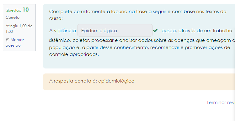 <p>Questão 10 Complete corretamente a lacuna na frase a seguir e com base nos textos do Correto curso: Atingiu 1,00 de 1,00 A vigilância Epidemiológico busca, através de um trabalho P Marcar sistêmico, coletar, processar e analisar dados sobre as doenças que ameaçam a questão população e, a partir desse conhecimento, recomendar e promover ações de controle apropriadas. A resposta correta é: epidemiológica Terminar revi</p>