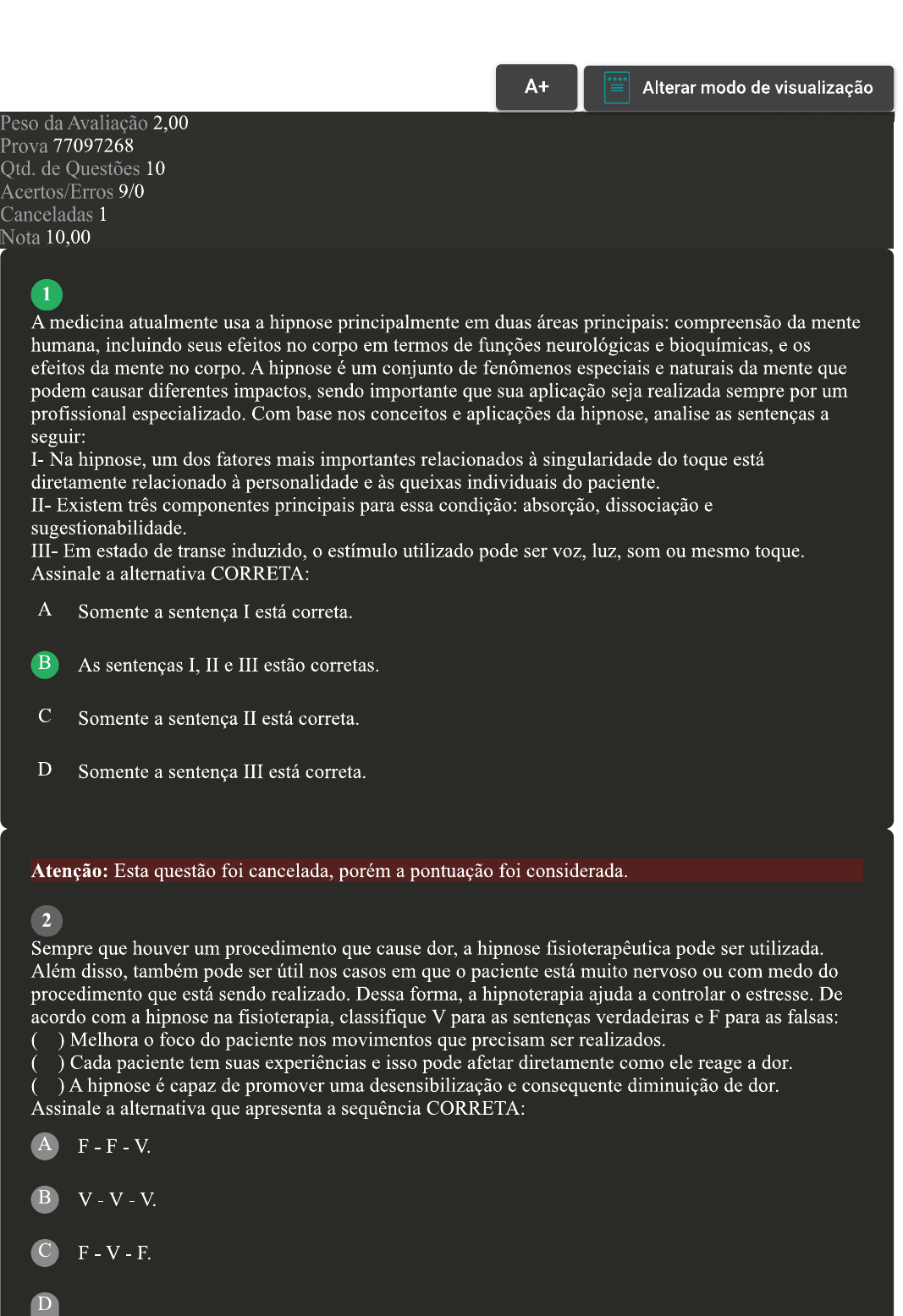 <p>A+ Alterar modo de visualização Peso da Avaliação 2,00 Prova 77097268 Qtd. de Questões 10 Acertos/Erros 9/0 Canceladas 1 Nota 10,00 1 A medicina atualmente usa a hipnose principalmente em duas áreas principais: compreensão da mente humana, incluindo seus efeitos no corpo em termos de funções neurológicas e bioquímicas, e os efeitos da mente no corpo. A hipnose é um conjunto de fenômenos especiais e naturais da mente que podem causar diferentes impactos, sendo importante que sua aplicação seja realizada sempre por um profissional especializado. Com base nos conceitos e aplicações da hipnose, analise as sentenças a seguir: I- Na hipnose, um dos fatores mais importantes relacionados à singularidade do toque está diretamente relacionado à personalidade e às queixas individuais do paciente. II- Existem três componentes principais para essa condição: absorção, dissociação e sugestionabilidade. III- Em estado de transe induzido, estímulo utilizado pode ser luz, som ou mesmo toque. Assinale a alternativa CORRETA: A Somente a sentença I está correta. B As sentenças I, II e III estão corretas. C Somente a sentença II está correta. D Somente a sentença III está correta. Atenção: Esta questão foi cancelada, porém a pontuação foi considerada. 2 Sempre que houver um procedimento que cause dor, a hipnose fisioterapêutica pode ser utilizada. Além disso, também pode ser útil nos casos em que paciente está muito nervoso ou com medo do procedimento que está sendo realizado. Dessa forma, a hipnoterapia ajuda a controlar estresse. De acordo com a hipnose na fisioterapia, classifique V para as sentenças verdadeiras e F para as falsas: ( ) Melhora foco do paciente nos movimentos que precisam ser realizados. ( ) Cada paciente tem suas experiências e isso pode afetar diretamente como ele reage a dor. ( ) A hipnose é capaz de promover uma desensibilização e consequente diminuição de dor. Assinale a alternativa que apresenta a sequência CORRETA: A F F V. B V-V-V D</p><p>V F F. 3 O uso da hipnose na fisioterapia é regulamentado pela resolução COFFITO n° 380/2010. Com a combinação dessas duas técnicas, é possível trabalhar a dor do paciente não apenas com ferramentas utilizadas na profissão, mas também por resignação. A resolução, portanto, determina que a prática da hipnose na fisioterapia deve ser considerada um valioso elemento auxiliar em diversos tratamentos. Sobre os benefícios da hipnose na fisioterapia, classifique V para as sentenças verdadeiras e F para as falsas: ( ) Aumenta foco do paciente no movimento que está sendo realizado. ( ) Cessa a dor na realização dos exercícios. ) Facilita a comunicação entre fisioterapeuta e paciente. ( ) Reduz a ansiedade e reduz controle emocional, levando ao relaxamento muscular. Assinale a alternativa que apresenta a sequência CORRETA: Fonte: https://www.coffito.gov.br/nsite/?p=1437. Acesso em: 21 nov. 2022. A B C D F V - F V. 4 O uso de plantas para restaurar a saúde tem sido utilizado ao longo dos séculos por diferentes culturas, hoje combinando saberes populares das mais diversas origens e complementando descobertas científicas, novos aprendizados. A utilização adequada de plantas medicinais na Atenção Primária à Saúde representa um passo importante e mais uma opção medicamentosa a ser destinada à população na tentativa de melhorar sua saúde e qualidade de vida. De acordo com uso da fitoterapia na Atenção Primária à Saúde, classifique V para as sentenças verdadeiras e F para as falsas: ( A população atendida em Unidades Básicas de Saúde faz uso de plantas medicinais com fins terapêuticos e muitas vezes desconhece a existência de possível toxicidade e ação terapêutica comprovada. ( ) É necessário ter conhecimentos sobre as propriedades terapêuticas das plantas medicinais utilizadas, seu preparo, cuidados, dosagem e indicação, além de compreender como as pessoas dessas comunidades percebem processo saúde/doença. ( A utilização do saber popular como base para a pesquisa científica sobre plantas medicinais tem ganhado impacto nos últimos anos e tem guiado muitos profissionais da área de saúde a investigar subsídios para a introdução de espécies em programas de fitoterapia na rede de atendimento básico à saúde. Assinale a alternativa que apresenta a sequência CORRETA: A V V V. B F F V. C</p><p>D 5 A fisioterapia pode atuar em conjunto com a fitoterapia, como complemento, para complementar e promover a melhora do quadro do paciente, embora ainda pouco utilizada. Contudo, muito se tem para avançar na formação do profissional fisioterapeuta, no que diz respeito ao uso das plantas e de outras formulações terapêuticas como parte integrante no tratamento. De acordo com a fitoterapia, classifique V para as sentenças verdadeiras e F para as falsas: ( ) Segundo Código de Ética Profissional de Fisioterapia, fisioterapeuta possui autorização para prescrever medicamentos, desde que compreenda os princípios básicos da farmacologia. ( ) Não há proibições para uso de produtos naturais à base de plantas, também conhecido como fitoterapia, na prática da fisioterapia. ( ) A prática da fitoterapia deve ser realizada por um profissional que tenha a qualificação para uso de plantas medicinais durante a fisioterapia. Assinale a alternativa que apresenta a sequência CORRETA: A B C D 6 A regulamentação da acupuntura no Brasil teve início em 1984, com Projeto de Lei Federal n° 3.838 da Câmara dos Deputados, propondo a regulamentação do exercício da acupuntura em nível multiprofissional, com a ressalva à exigência da boa formação deles. Com intuito de salvaguardar essa boa formação, os Conselhos Federais profissionais iniciaram regulamentações próprias, estabelecendo parâmetros para a prática e fiscalização dos profissionais filiados. Considerando os profissionais considerados qualificados para a aplicação da acu