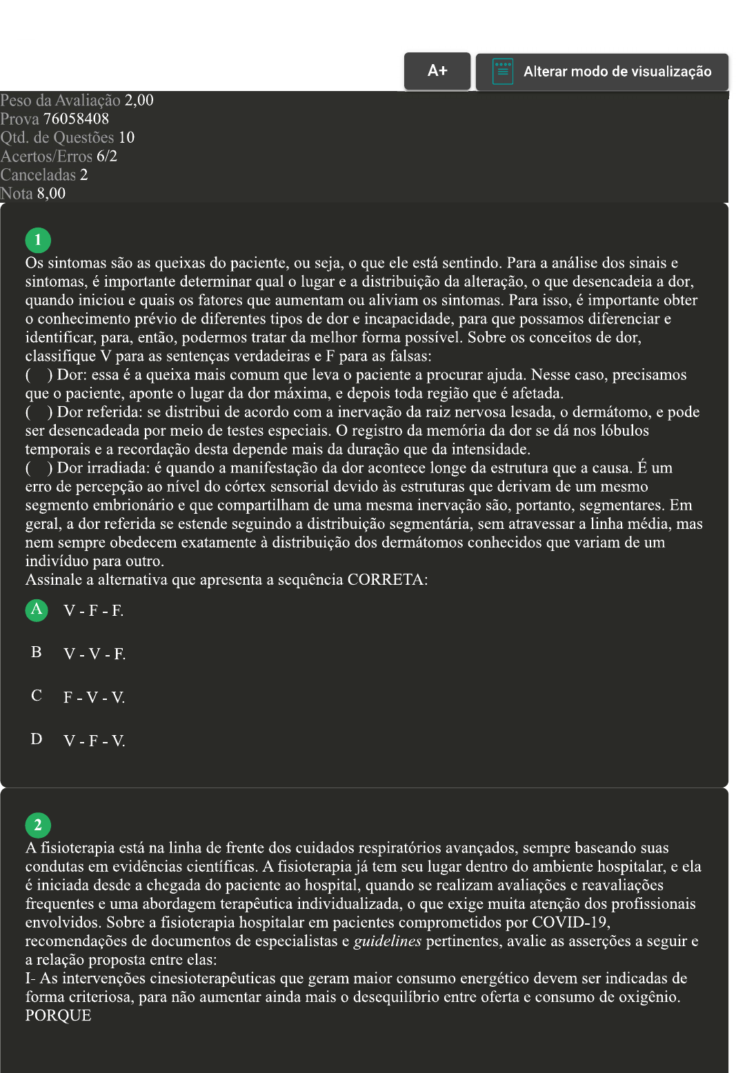 <p>A+ Alterar modo de visualização Peso da Avaliação 2,00 Prova 76058408 Qtd. de Questões 10 Acertos/Erros 6/2 Canceladas 2 Nota 8,00 1 Os sintomas são as queixas do paciente, ou seja, que ele está sentindo. Para a análise dos sinais e sintomas, é importante determinar qual lugar e a distribuição da alteração, que desencadeia a dor, quando iniciou e quais os fatores que aumentam ou aliviam os sintomas. Para isso, é importante obter conhecimento prévio de diferentes tipos de dor e incapacidade, para que possamos diferenciar e identificar, para, então, podermos tratar da melhor forma possível. Sobre os conceitos de dor, classifique V para as sentenças verdadeiras e F para as falsas: ( ) Dor: essa é a queixa mais comum que leva paciente a procurar ajuda. Nesse caso, precisamos que paciente, aponte lugar da dor e depois toda região que é afetada. ( ) Dor referida: se distribui de acordo com a inervação da raiz nervosa lesada, dermátomo, e pode ser desencadeada por meio de testes especiais. O registro da memória da dor se dá nos lóbulos temporais e a recordação desta depende mais da duração que da intensidade. ( ) Dor irradiada: é quando a manifestação da dor acontece longe da estrutura que a causa. É um erro de percepção ao nível do córtex sensorial devido às estruturas que derivam de um mesmo segmento embrionário e que compartilham de uma mesma inervação são, portanto, segmentares. Em geral, a dor referida se estende seguindo a distribuição segmentária, sem atravessar a linha média, mas nem sempre obedecem exatamente à distribuição dos dermátomos conhecidos que variam de um indivíduo para outro. Assinale a alternativa que apresenta a sequência CORRETA: A V F F. B C D 2 A fisioterapia está na linha de frente dos cuidados respiratórios avançados, sempre baseando suas condutas em evidências científicas. A fisioterapia já tem seu lugar dentro do ambiente hospitalar, e ela é iniciada desde a chegada do paciente ao hospital, quando se realizam avaliações e reavaliações frequentes e uma abordagem terapêutica individualizada, que exige muita atenção dos profissionais envolvidos. Sobre a fisioterapia hospitalar em pacientes comprometidos por COVID-19, recomendações de documentos de especialistas e guidelines pertinentes, avalie as asserções a seguir e a relação proposta entre elas: I- As intervenções que geram maior consumo energético devem ser indicadas de forma criteriosa, para não aumentar ainda mais desequilíbrio entre oferta e consumo de oxigênio. PORQUE</p><p>II- O volume (séries e repetições) e a frequência diária deverão ser avaliados de forma individualizada, respeitando os critérios de segurança. Assinale a alternativa CORRETA: A A asserção I é uma proposição verdadeira, e a II, uma proposição falsa. B A asserção I é uma proposição falsa, e a II, uma proposição verdadeira. As asserções I e II são proposições verdadeiras, e a segunda é uma justificativa correta da primeira. D As asserções I e II são proposições verdadeiras, mas a segunda não é uma justificativa correta da primeira. Atenção: Esta questão foi cancelada, porém a pontuação foi considerada. 3 Osteoartrite é a forma mais comum de artrite, caracterizada por degeneração das cartilagens acompanhada de alterações das estruturas ósseas vizinhas. Sendo uma doença crônica bastante comum em idades avançadas, é considerada uma doença reumática, causando dor, rigidez e perda da função. Sobre tratamento fisioterapêutico direcionado ao paciente com osteoartrite, assinale a alternativa CORRETA: Nas fases iniciais, quando a dor e a sensação de rigidez são as queixas mais comuns, deve-se evitar a movimentação para prevenir, retardar ou corrigir possíveis limitações mecânicas. As técnicas de autoalongamento e flexibilidade, apesar de auxiliarem no aumento da mobilidade, não podem ser ensinadas ao paciente para diminuir as restrições resultantes da patologia, por serem muito específicas e de difícil execução. O paciente deve ser orientado sobre a realização de exercícios de intensidade baixa, moderada ou alta para melhorar a função cardiopulmonar, sendo recomendados exercícios de baixo impacto nas articulações, como caminhar, pedalar e nadar. D Exercícios resistidos não devem fazer parte do programa de tratamento, pois causam sobrecarga nas articulações, agravando quadro da doença. Atenção: Esta questão foi cancelada, porém a pontuação foi considerada. 4 Os sinais, diferente dos sintomas, se referem a manifestações que outro nota na pessoa que está doente. Para observação dos sinais nas doenças reumáticas é necessário realizar uma inspeção em repouso, uma inspeção durante movimento e a palpação. Sobre os sinais apresentados nas doenças reumáticas, assinale a alternativa CORRETA A Edema, qual apresenta diminuição do líquido sinovial ou alteração dos tecidos moles. B A dor não é localizada. Alterações posturais, podendo causar inclusive deformidades.</p><p>D Pele fria, com sinais de inflamação. 5 O conceito de Atenção Primária surgiu na Conferência Internacional sobre Cuidados Primários de Saúde, realizado em setembro de 1978, em Alma-Ata, URSS. A APS ou Atenção Básica (AB) cria uma estrutura de trabalho para todas as áreas dos sistemas de saúde, organizando e melhorando uso dos recursos para promover, prevenir e manter a saúde. Sobre as ações desenvolvidas pelo fisioterapeuta na atenção primária às condições músculo esqueléticas, classifique V para as sentenças verdadeiras e F para as falsas: ( ) Acolhimento e triagem às demandas de pacientes com dor e/ou limitação funcional. ( ) Ações de vigilância à saúde ocupacional para a busca ativa de fatores de risco e vulnerabilidade. ( ) Promoção da saúde musculoesquelética por meio de exercícios terapêuticos na comunidade. ( ) Atendimento domiciliar nas condições que n