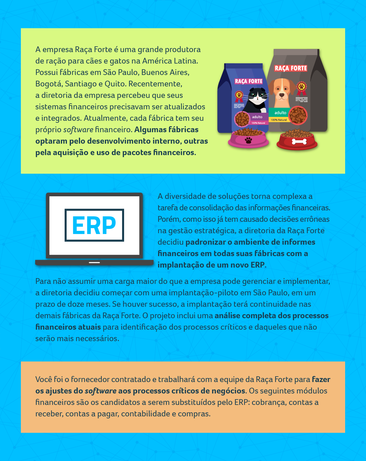 <p>A empresa Raça Forte é uma grande produtora de ração para cães e gatos na América Latina. Possui fábricas em São Paulo, Buenos Aires, RAÇA FORTE Bogotá, Santiago e Quito. Recentemente, RAÇA FORTE a diretoria da empresa percebeu que seus sistemas financeiros precisavam ser atualizados adulto e integrados. Atualmente, cada fábrica tem seu adulto 100% Natural 100% Natural próprio software financeiro. Algumas fábricas optaram pelo desenvolvimento interno, outras pela aquisição e uso de pacotes financeiros. A diversidade de soluções torna complexa a tarefa de consolidação das informações financeiras. ERP Porém, como isso já tem causado decisões errôneas na gestão estratégica, a diretoria da Raça Forte decidiu padronizar o ambiente de informes financeiros em todas suas fábricas com a implantação de um novo ERP. Para não assumir uma carga maior do que a empresa pode gerenciar e implementar, a diretoria decidiu começar com uma implantação-piloto em São Paulo, em um prazo de doze meses. Se houver sucesso, a implantação terá continuidade nas demais fábricas da Raça Forte. projeto inclui uma análise completa dos processos financeiros atuais para identificação dos processos críticos e daqueles que não serão mais necessários. Você foi o fornecedor contratado e trabalhará com a equipe da Raça Forte para fazer os ajustes do software aos processos críticos de negócios. Os seguintes módulos financeiros são os candidatos a serem substituídos pelo ERP: cobrança, contas a receber, contas a pagar, contabilidade e compras.</p>