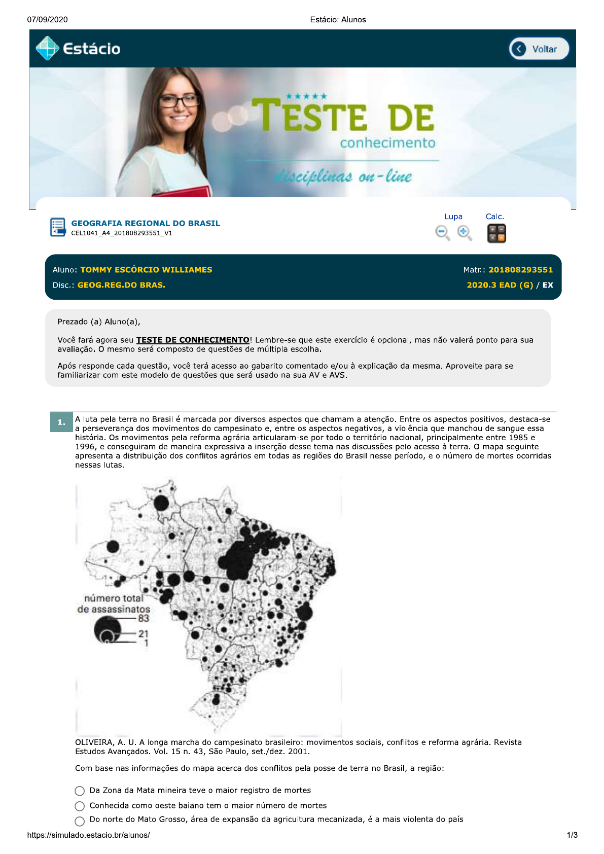 <p>07/09/2020 Estácio: Alunos Estácio < Voltar TESTE DE conhecimento isciplinas -line Lupa Calc. GEOGRAFIA REGIONAL DO BRASIL CEL1041_A4_201808293551_V1 Aluno: TOMMY ESCÓRCIO WILLIAMES Matr.: 201808293551 Disc.: GEOG.REG.DO BRAS. 2020.3 EAD (G) / EX Prezado (a) Aluno(a), Você fará agora seu TESTE DE CONHECIMENTO! Lembre-se que este exercício é opcional, mas não valerá ponto para sua avaliação. o mesmo será composto de questões de múltipla escolha. Após responde cada questão, você terá acesso ao gabarito comentado e/ou à explicação da mesma. Aproveite para se familiarizar com este modelo de questões que será usado na sua AV e AVS. 1. A luta pela terra no Brasil é marcada por diversos aspectos que chamam a atenção. Entre os aspectos positivos, destaca-se a perseverança dos movimentos do campesinato e, entre os aspectos negativos, a violência que manchou de sangue essa Os movimentos pela reforma agrária articularam-se por todo o território nacional, principalmente entre 1985 e 1996, e conseguiram de maneira expressiva a inserção desse tema nas discussões pelo acesso à terra. o mapa seguinte apresenta a distribuição dos conflitos agrários em todas as regiões do Brasil nesse período, e o número de mortes ocorridas nessas lutas. número total de assassinatos 83 21 1 OLIVEIRA, A. U. A longa marcha do campesinato brasileiro: movimentos sociais, conflitos e reforma agrária. Revista Estudos Avançados. Vol. 15 n. 43, São Paulo, set./dez. 2001. Com base nas informações do mapa acerca dos conflitos pela posse de terra no Brasil, a região: Da Zona da Mata mineira teve o maior registro de mortes Conhecida como oeste tem o maior número de mortes Do norte do Mato Grosso, área de expansão da agricultura mecanizada, é a mais violenta do país https://simulado.estacio.br/alunos/ 1/3</p><p>07/09/2020 Estácio: Alunos Conhecida historicamente como das Missões Jesuíticas é a de maior violência Do Bico do Papagaio apresenta os números mais expressivos Explicação: A região no qual os conflitos pela posse da terra são mais intensos é a do Bico do Papagaio, localizado na divisa entre os estados do Tocantins, Maranhão e Pará, resultado das disputas entre os proprietários de terras, posseiros, grileiros, indígenas e sem-terra, este último articulados com movimentos sociais com o âmbito de conseguir a reforma agrária nesta região. Muitas pessoas acabam sendo assassinadas, por existir interesses políticos e econômicos na manutenção dos latifúndios. 2. Brasil Escola Leia o trecho do texto, a seguir. Assiste ao enterro de um trabalhador de eito e ouve o que dizem do morto os amigos que o levaram ao cemitério Esta cova em que estás, com palmos medida, é a conta menor que tiraste em vida. É de bom tamanho, nem largo nem fundo é a parte que te cabe deste latifúndio Não é cova grande é cova medida é a terra que querias ver dividida. MELO NETO, J. C. Morte e vida severina. In: Obra Completa. Rio de Janeiro: Nova Aguilar, 2003, p.183. poema de João Cabral de Melo Neto evidencia duas questões bastante debatidas e vivenciadas no âmbito da fronteira agrícola e na configuração do espaço agrário brasileiro, que são, respectivamente: A taxa de mortalidade rural e a distribuição de terras A expansão do desmatamento e a violência no meio agropecuário A concentração fundiária e a mecanização do campo Os conflitos no campo e a reforma agrária A discriminação social e a cultura rural Explicação: No poema de João Cabral de Melo Neto, é possível destacar, no âmbito da questão agrária e da fronteira agrícola do Brasil, dois pontos: a morte de um trabalhador ocorrida por conflitos pela terra (a parte que te cabe deste latifúndio) e a reforma agrária (é a terra que querias ver dividida). 3. Leia o texto abaixo: A Amazônia é extensa e pouco povoada apenas 25 milhões de habitantes, 70% concentrados em núcleos urbanos. No novo Atlas do IBGE, é o pequeno número de estabelecimentos agropecuários na região, em contraste com a grande e desproporcional expansão de desmatamento. São raras as cadeias produtivas e geralmente incompletas, pois a agregação de valor acontece fora da região. Não há economia organizada, mas destruição dos recursos naturais, sem benefício à população local. Para o futuro, é lícito reconhecer, portanto, que a Amazônia já é verde, mas necessita de uma base econômica capaz de assim mantê-la. MONTEIRO, Eduardo. Bertha Becker, pelo desenvolvimento da região amazônica. Disponível em https://simulado.estacio.br/alunos/ 2/3</p><p>07/09/2020 Estácio: Alunos 679035.shtml Acesso em 12 jan 2016. Diversas atividades econômicas foram implantadas na região Amazônica. Assinale a afirmativa correta que explica essa consequência do desmatamento. A floresta passa a dar lugar à criação extensiva de gado de corte, onde são criados soltos nas áreas de além da expansão rápida e desordenada da agropecuária, a oeste do país A região nunca contou com grande importância econômica, no contexto brasileiro, por isso, não houve interesse de ocupação, pelos diferentes governos que marcaram a historiografia brasileira A maior causa do desmatamento foi a crescimento populacional nas cidades, exploração da madeira e a produção agrícola, principalmente da o que provocou grandes impactos ambientais irreversíveis na região desmatamento nessa região está associado à ampliação de áreas monocultoras (soja), que são as frentes agrícolas, localizada na faixa sul da floresta, designada como Arco de Desmatamento As duas principais ameaças à biodiversidade do bioma estão relacionadas à expansão de lavouras comerciais, com destaque para o café e o trigo, muito adaptáveis à região Explicação: Os campeões de desmatamento e queimadas na Amazônia são dominados pelo gado e pela soja. Avanço da soja em áreas de desmatamento na Amazônia é o maior em cinco anos. Col@bore Sugira! S