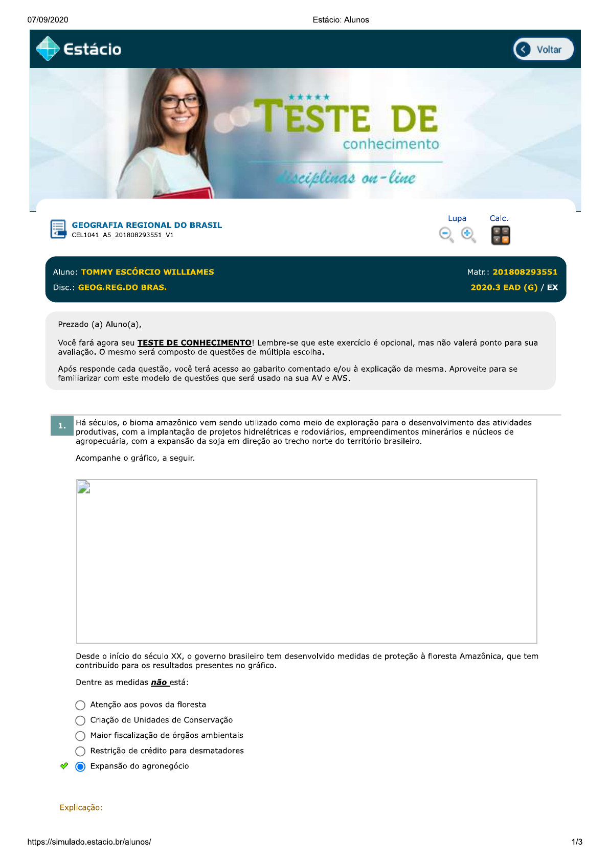 <p>07/09/2020 Estácio: Alunos Estácio Voltar TESTE DE conhecimento sciplinas on-line Lupa Calc. GEOGRAFIA REGIONAL DO BRASIL CEL1041_A5_201808293551_V1 Aluno: TOMMY ESCÓRCIO WILLIAMES Matr.: 201808293551 Disc.: GEOG.REG.DO BRAS. 2020.3 EAD (G) / EX Prezado (a) Aluno(a), Você fará agora seu TESTE DE CONHECIMENTO! Lembre-se que este exercício é opcional, mas não valerá ponto para sua avaliação. o mesmo será composto de questões de múltipla escolha. Após responde cada questão, você terá acesso ao gabarito comentado e/ou à explicação da mesma. Aproveite para se familiarizar com este modelo de questões que será usado na sua AV e AVS. 1. Há séculos, o bioma amazônico vem sendo utilizado como meio de exploração para o desenvolvimento das atividades produtivas, com a implantação de projetos hidrelétricas e rodoviários, empreendimentos minerários e núcleos de agropecuária, com a expansão da soja em direção ao trecho norte do território Acompanhe o gráfico, a Desde o início do século XX, o governo brasileiro tem desenvolvido medidas de proteção à floresta Amazônica, que tem contribuído para os resultados presentes no gráfico. Dentre as medidas não está: Atenção aos povos da floresta Criação de Unidades de Conservação Maior fiscalização de órgãos ambientais Restrição de crédito para desmatadores Expansão do agronegócio Explicação: https://simulado.estacio.br/alunos/ 1/3</p><p>07/09/2020 Estácio: Alunos agronegócio principalmente na forma de produção de soja ou pecuária extensiva tem sido um dos grandes vilões do desmatamento na Amazônia. 2. Adaptado de IESES 2019 A Lei N.9.985/2000 regulamentou o art. 225, § 1°, incisos I, II, III e VII da Constituição Federal e instituiu o Sistema Nacional de Unidades de Conservação da Natureza. Sobre ela podemos afirmar: I. Sistema Nacional de Unidades de Conservação da Natureza SNUC é constituído pelo conjunto das unidades de conservação federais, estaduais e municipais. II. SNUC é regido por diretrizes que asseguram a participação efetiva das populações locais na criação e implantação das unidades de conservação, a gestão é incumbência restrita do órgão ambiental. III. grupo das Unidades de Proteção Integral é composto pelas seguintes categorias de unidade de conservação: Estação Ecológica, Reserva Biológica, Parque Nacional e Área de Relevante Interesse Ecológico. IV. A desafetação ou redução dos limites de uma unidade de conservação só pode ser feita mediante lei específica. A sequência de afirmativas corretas é: Apenas as alternativas II, III e IV estão corretas Apenas as alternativas III e IV estão corretas Apenas as alternativas I, III e IV estão corretas Apenas as alternativas I e IV estão corretas Apenas as alternativas I e III estão corretas Explicação: II - INCORRETA: No artigo quinto da lei diz que o SNUC será regido por diretrizes que assegurem a participação efetiva das populações locais na criação, implantação e gestão das unidades de conservação. III INCORRETA: grupo das Unidades de Proteção Integral é composto pelas seguintes categorias de unidade de conservação: I Estação Ecológica; II - Reserva Biológica; III - Parque Nacional; IV - Monumento Natural; V Refúgio de Vida Silvestre. 3. Leia o texto, a seguir. Dormimos na beira do rio mesmo, só não foi dentro porque estamos em época de seca na Amazônia. Nesta época, o rio encolhe vários metros, deixando a nossa palafita no alto, sobre suas pernas finas. Disponível em em 18 jan 2020. texto se refere à comunidade de dentro de uma Floresta Nacional, às margens de qual rio Amazônico? Negro Xingu Madeira Solimões Tapajós Explicação: Na Floresta Nacional (FLONA) Tapajós, no Pará, existe uma comunidade que pratica o turismo de base comunitária, de forma organizada, desde 2005, a comunidade Jamaraquá, nas margens do rio Tapajós. Col@bore Sugira! Sinalize! Construa! Antes de finalizar, clique aqui para dar a sua opinião sobre as questões deste Não Respondida Não Gravada Gravada https://simulado.estacio.br/alunos/ 2/3</p><p>07/09/2020 Estácio: Alunos Exercício inciado em 07/09/2020 https://simulado.estacio.br/alunos/ 3/3</p>