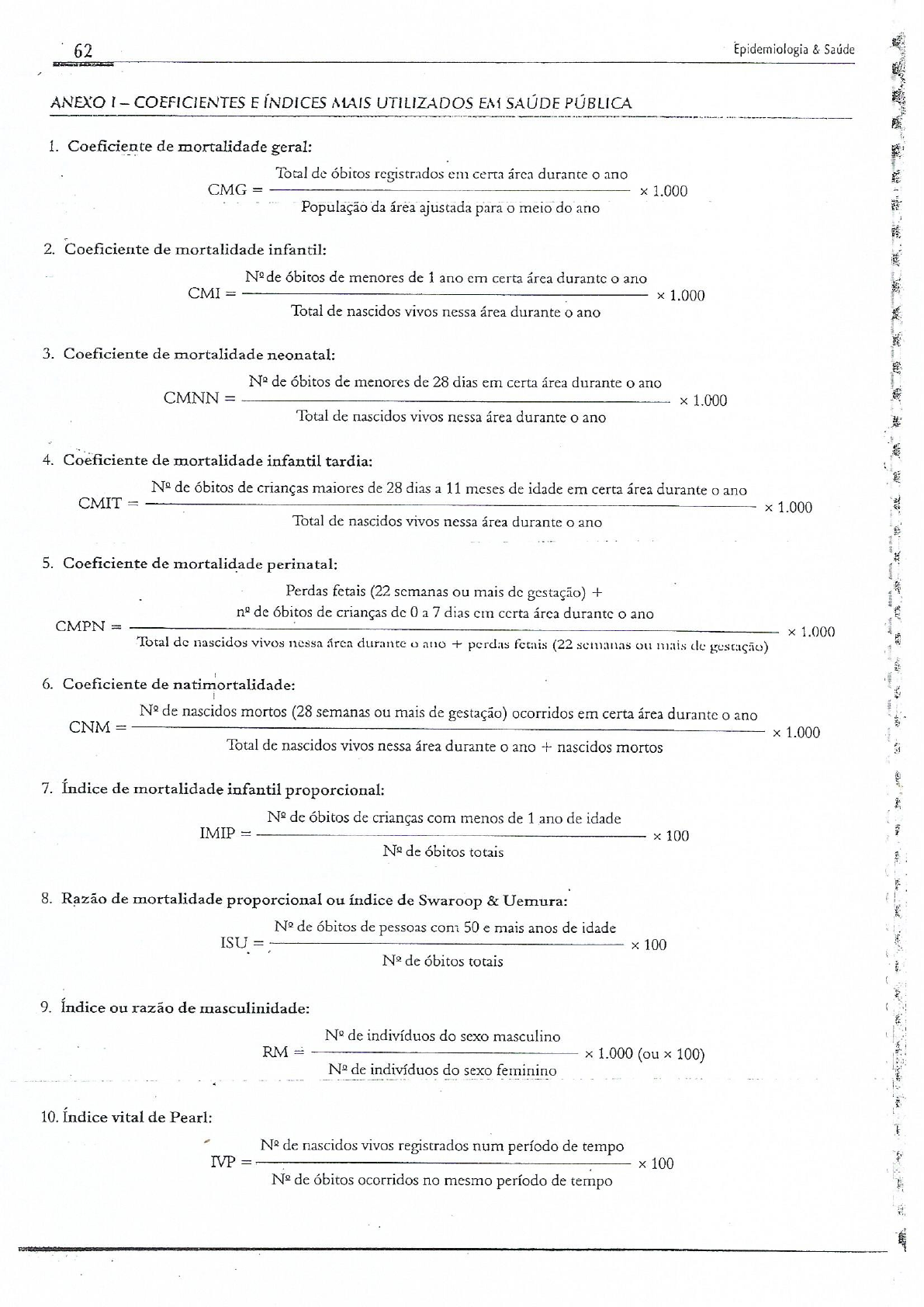 <p>62 Epidemiologia & Saúde ANEXO I - COEFICIENTES E ÍNDICES MAIS UTILIZADOS EM SAÚDE PÚBLICA 1. Coeficiente de mortalidade geral: Total de óbitos registrados em certa durante o ano CMG = 1.000 População da área ajustada para o meio do ano 2. Coeficiente de mortalidade infantil: óbitos de menores de 1 ano em certa área durante o ano CMI = 1.000 Total de nascidos vivos nessa área durante o ano 3. Coeficiente de mortalidade neonatal: de óbitos de menores de 28 dias em certa área durante o ano CMNN = 1.000 Total de nascidos vivos nessa área durante o ano 4. Coeficiente de mortalidade infantil tardia: de óbitos de crianças maiores de 28 dias a 11 meses de idade em certa área durante o ano CMIT = 1.000 Total de nascidos vivos nessa área durante ano 5. Coeficiente de mortalidade perinatal: Perdas fetais (22 semanas ou mais de gestação) + n° de óbitos de crianças de 0 a 7 dias cm ccrta durante o ano CMPN = 1.000 Total de nascidos vivos nessa área durante ano + perdas fetais (22 semanas ou mais de gestação) 6. Coeficiente de de nascidos mortos (28 semanas ou mais de gestação) ocorridos em certa área durante o ano CNM 1.000 Total de nascidos vivos nessa área durante o ano + nascidos mortos 7. Índice de mortalidade infantil proporcional: de óbitos de crianças com menos de 1 ano de idade IMIP = 100 de óbitos totais 8. Razão de mortalidade proporcional ou índice de Swaroop & Uemura: de óbitos de pessoas com 50 e mais anos de idade ISU X 100 de óbitos totais 9. Índice ou razão de masculinidade: de indivíduos do sexo masculino RM = 1.000 (ou X 100) de indivíduos do sexo feminino 10. Índice vital de Pearl: de nascidos vivos registrados num período de tempo IVP 100 de óbitos ocorridos no mesmo período de tempo</p><p>Medida da Saúde Coletiva 63 11. Coeficiente de letalidade: CL = de óbitos de determinada doença em determinado período de tempo 100 de casos dessa doença nesse mesmo período de tempo 12. Coeficiente de mortalidade materna: CMM = No de óbitos por causas ligadas a gestação, parto e puerpério em determinada área no ano x 100.000 Nascidos vivos no mesmo período 13. Coeficiente geral de fecundidade: de nascidos vivos numa determinada área no ano CGF = 1.000 População de mulheres de 15 a 49 anos no mesmo período 14. Coeficiente de natalidade de nascidos vivos numa determinada área no ano CNG = 1.000 População da área ajustada para o meio do ano 15. Coeficiente de mortalidade por determinada doença: CMD = de óbitos por determinada docnça ocorridos na população numa determinada área no ano População da área ajustada para o meio do ano 100.000 16. Coeficiente de mortalidade específico por idade: CPId = de óbitos ocorridos num dado grupo ctário na população numa determinada área no ano População da árca ajustada para o meio do ano para o mesmo grupo etário 100.000 17. Coeficiente de mortalidade específico por sexo: de óbitos específicos ocorridos naquele sexo numa determinada área no ano CMS 100.000 População da área ajustada para o meio do ano para mesmo sexo 18. Coeficiente de incidência: de casos novos (iniciados) num determinado período numa área CI = 100.000 População exposta ao risco neste período, na área 19. Coeficiente de prevalência por período: de casos existentes (novos + antigos) num determinado período numa área CP = 100.000 População da área no mesmo período 20. Coeficiente de ataque secundário: de casos surgidos a partir de contato com caso-índice CAS = 100 total de pessoas que tiveram contato com o caso-índice</p>