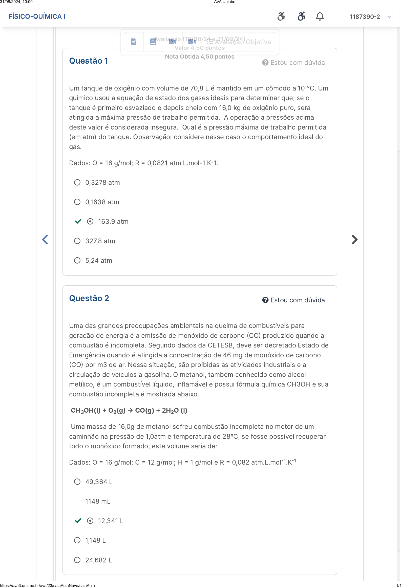 <p></p><p>Questão 1 Estou com dúvida</p><p>Um tanque de oxigênio com volume de 70,8 L é mantido em um cômodo a 10 °C. Um</p><p>químico usou a equação de estado dos gases ideais para determinar que, se o</p><p>tanque é primeiro esvaziado e depois cheio com 16,0 kg de oxigênio puro, será</p><p>atingida a máxima pressão de trabalho permitida. A operação a pressões acima</p><p>deste valor é considerada insegura. Qual é a pressão máxima de trabalho permitida</p><p>(em atm) do tanque. Observação: considere nesse caso o comportamento ideal do</p><p>gás.</p><p>Dados: O � 16 g/mol; R � 0,0821 atm.L.mol-1.K�1.</p><p> 0,3278 atm</p><p> 0,1638 atm</p><p> 163,9 atm</p><p> 327,8 atm</p><p> 5,24 atm</p><p>Questão 2 Estou com dúvida</p><p>Uma das grandes preocupações ambientais na queima de combustíveis para</p><p>geração de energia é a emissão de monóxido de carbono �CO� produzido quando a</p><p>combustão é incompleta. Segundo dados da CETESB, deve ser decretado Estado de</p><p>Emergência quando é atingida a concentração de 46 mg de monóxido de carbono</p><p>�CO� por m3 de ar. Nessa situação, são proibidas as atividades industriais e a</p><p>circulação de veículos a gasolina. O metanol, também conhecido como álcool</p><p>metílico, é um combustível líquido, inflamável e possui fórmula química CH3OH e sua</p><p>combustão incompleta é mostrada abaixo.</p><p>CH OH(l) � O (g) � CO(g) � 2H O (l)</p><p>Uma massa de 16,0g de metanol sofreu combustão incompleta no motor de um</p><p>caminhão na pressão de 1,0atm e temperatura de 28ºC, se fosse possível recuperar</p><p>todo o monóxido formado, este volume seria de:</p><p>Dados: O � 16 g/mol; C � 12 g/mol; H � 1 g/mol e R � 0,082 atm.L.mol .K</p><p> 49,364 L</p><p> 1148 mL</p><p> 12,341 L</p><p> 1,148 L</p><p> 24,682 L</p><p>Avaliação �10/08/24 a 31/08/24�</p><p>Valor 4,50 pontos</p><p>Nota Obtida 4,50 pontos</p><p>3 2 2</p><p>�1 �1</p><p></p><p> Avaliação Objetiva</p><p>FÍSICO�QUÍMICA I 1187390�2</p><p>31/08/2024, 10:00 AVA Uniube</p><p>https://ava3.uniube.br/ava/23/salaAulaNovo/salaAula 1/1</p>