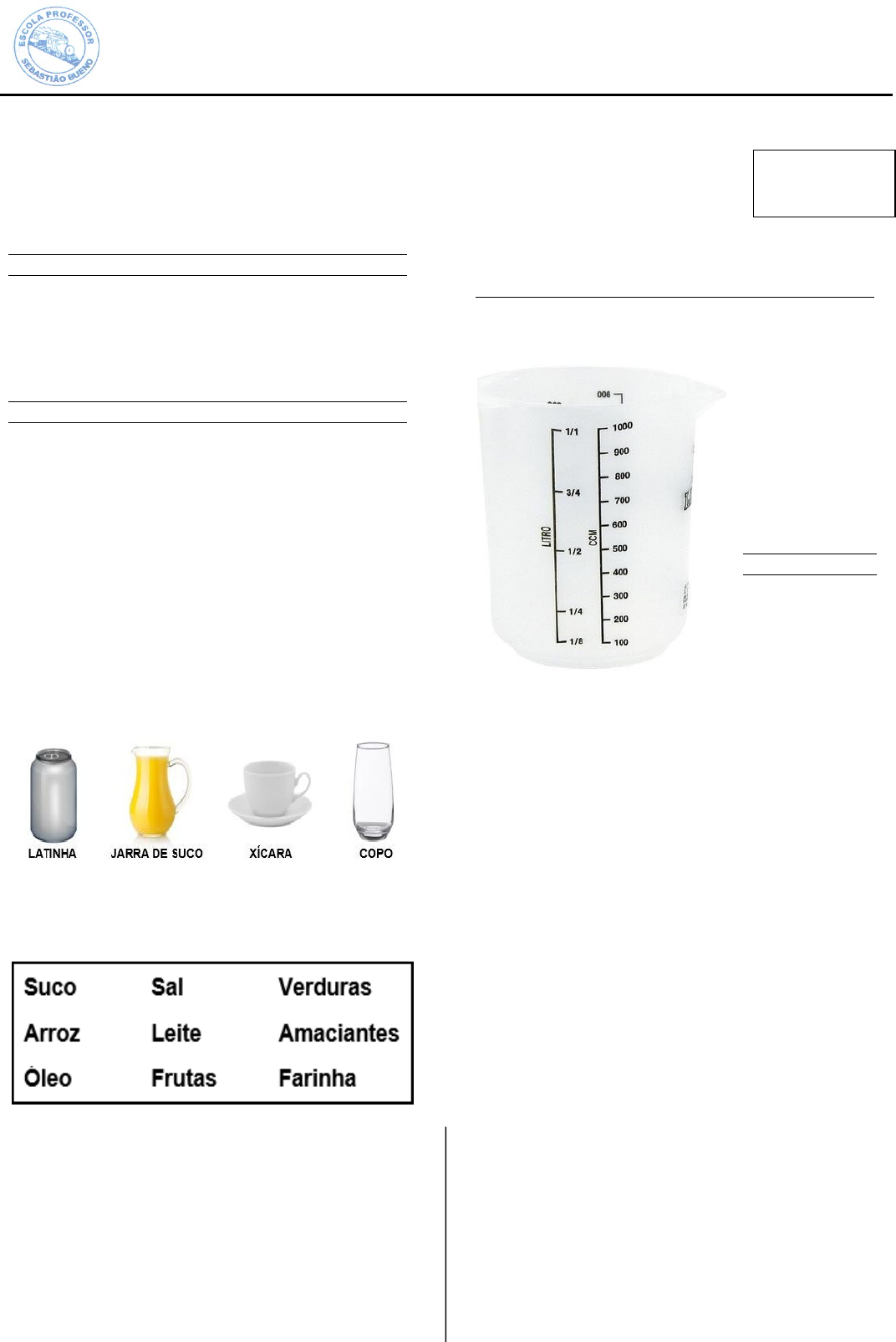 <p>Escola Professor Sebastião Bueno.</p><p>Vianópolis, _____/_____/______ Professora: Nayra Araújo</p><p>Aluno (a): ______________________________________ Série: 3º ano</p><p>TRABALHO AVALIATIVO DE MATEMÁTICA – 3º BIMESTRE</p><p>VALOR: 4,0</p><p>NOTA:</p><p>1. Quais é a unidade de medida que utilizamos para calcular a quantidade dos líquidos?</p><p>2. Lucas comprou 1 litro de leite e distribuirá em copos cuja capacidade é de 200 mililitros cada um. Quantos copos ele conseguirá encher?</p><p>3. Marcos irá fazer uma festa em sua casa. Ele comprou uma garrafa de 2 litros de refrigerante para dividir igualmente entre ele e os seus 4 amigos. Qual é a quantidade de refrigerante que cada amigo irá ganhar?</p><p>a) 400 ml.</p><p>b) 300 ml.</p><p>c) 350 ml.</p><p>d) 500 ml.</p><p>:</p><p>4. Marque um X no recipiente onde cabe a maior quantidade de líquido:</p><p>5. Circule no quadro abaixo os nomes dos produtos que compramos a litros</p><p>6. O carro de Bernardo suporta até 50 litros de gasolina. Sabe-se que no tanque há apenas 20 litros. Quantos litros de gasolina faltam para completar o tanque do seu carro?</p><p>a) 20 litros. b) 30 litros.</p><p>c) 40 litros. d) 50 litros.</p><p>7. Se uma torneira com vazamento desperdiça 20 litros de água em um dia, depois de 4 dias, qual será o desperdício total de água?</p><p>8. Observe a imagem a seguir:</p><p>Qual é a medida máxima de ml que cabe no copo medidor?</p><p>9. Quantos milímetros de água cabem em uma jarra cuja capacidade é de 2 litros?</p><p>a) 200 ml. b) 700 ml.</p><p>c) 1000 ml. d) 2000 ml.</p><p>10. Quantas garrafas de 500 ml serão necessárias para encher um recipiente com capacidade para 3 litros?</p><p>a) 2 garrafas. b) 4 garrafas.</p><p>c) 5 garrafas. d) 6 garrafas.</p><p>11- Decomponha os números abaixo: (0,5)</p><p>a) 1235:______________________________</p><p>b) - 2348: _____________________________</p><p>c) - 3650: ____________________________</p><p>d) - 1209: ________________________</p><p>e) 7045:____________________________</p><p>image1.png</p><p>image2.jpeg</p><p>image3.png</p><p>image4.jpeg</p><p>image5.jpg</p>