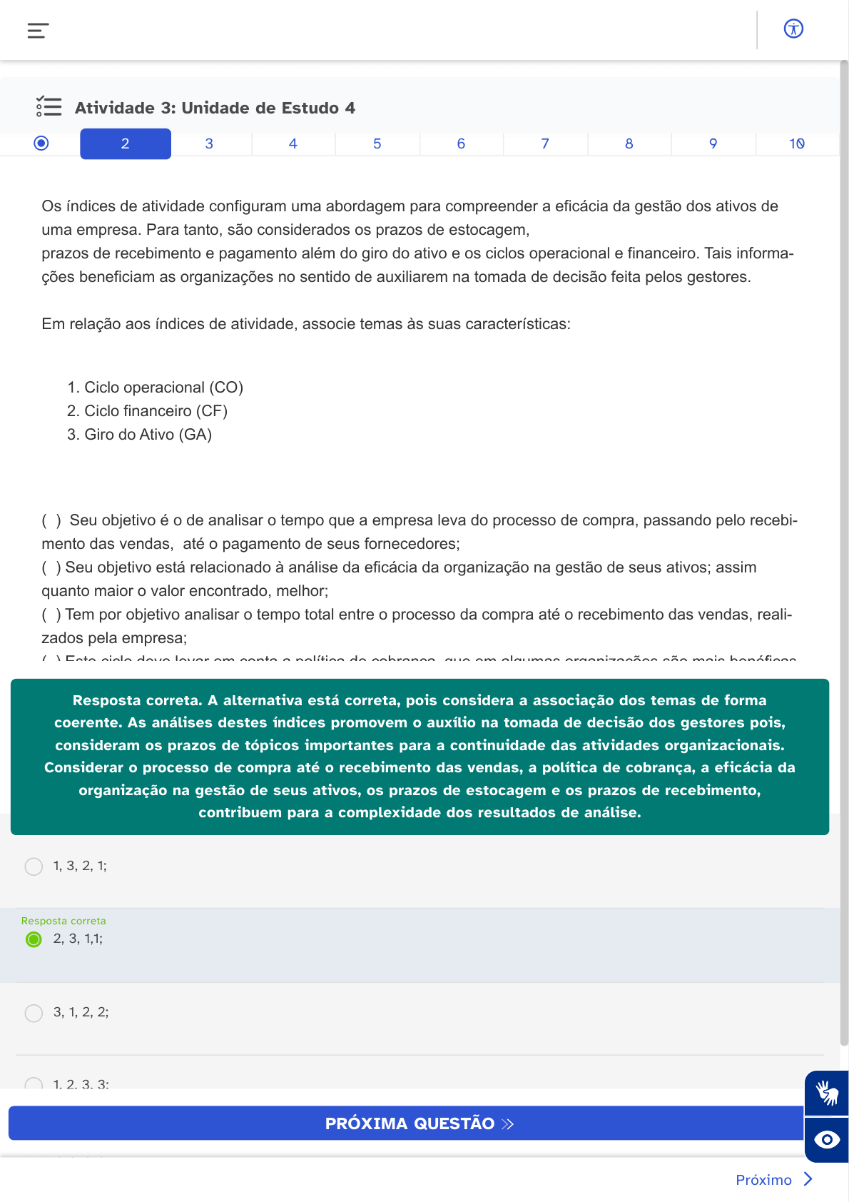 <p>Atividade 3: Unidade de Estudo 4</p><p>Os índices de atividade configuram uma abordagem para compreender a eficácia da gestão dos ativos de</p><p>uma empresa. Para tanto, são considerados os prazos de estocagem,</p><p>prazos de recebimento e pagamento além do giro do ativo e os ciclos operacional e financeiro. Tais informa-</p><p>ções beneficiam as organizações no sentido de auxiliarem na tomada de decisão feita pelos gestores.</p><p>Em relação aos índices de atividade, associe temas às suas características:</p><p>1. Ciclo operacional (CO)</p><p>2. Ciclo financeiro (CF)</p><p>3. Giro do Ativo (GA)</p><p>( ) Seu objetivo é o de analisar o tempo que a empresa leva do processo de compra, passando pelo recebi-</p><p>mento das vendas, até o pagamento de seus fornecedores;</p><p>( ) Seu objetivo está relacionado à análise da eficácia da organização na gestão de seus ativos; assim</p><p>quanto maior o valor encontrado, melhor;</p><p>( ) Tem por objetivo analisar o tempo total entre o processo da compra até o recebimento das vendas, reali-</p><p>zados pela empresa;</p><p>( ) Este ciclo deve levar em conta a política de cobrança que em algumas organizações são mais benéficas</p><p>Resposta correta. A alternativa está correta, pois considera a associação dos temas de forma</p><p>coerente. As análises destes índices promovem o auxílio na tomada de decisão dos gestores pois,</p><p>consideram os prazos de tópicos importantes para a continuidade das atividades organizacionais.</p><p>Considerar o processo de compra até o recebimento das vendas, a política de cobrança, a eficácia da</p><p>organização na gestão de seus ativos, os prazos de estocagem e os prazos de recebimento,</p><p>contribuem para a complexidade dos resultados de análise.</p><p>1, 3, 2, 1;</p><p>2, 3, 1,1;</p><p>Resposta correta</p><p>3, 1, 2, 2;</p><p>1, 2, 3, 3;</p><p>2 1 3 1</p><p>PRÓXIMA QUESTÃO</p><p> 2 3 4 5 6 7 8 9 10</p><p>Próximo </p><p></p>