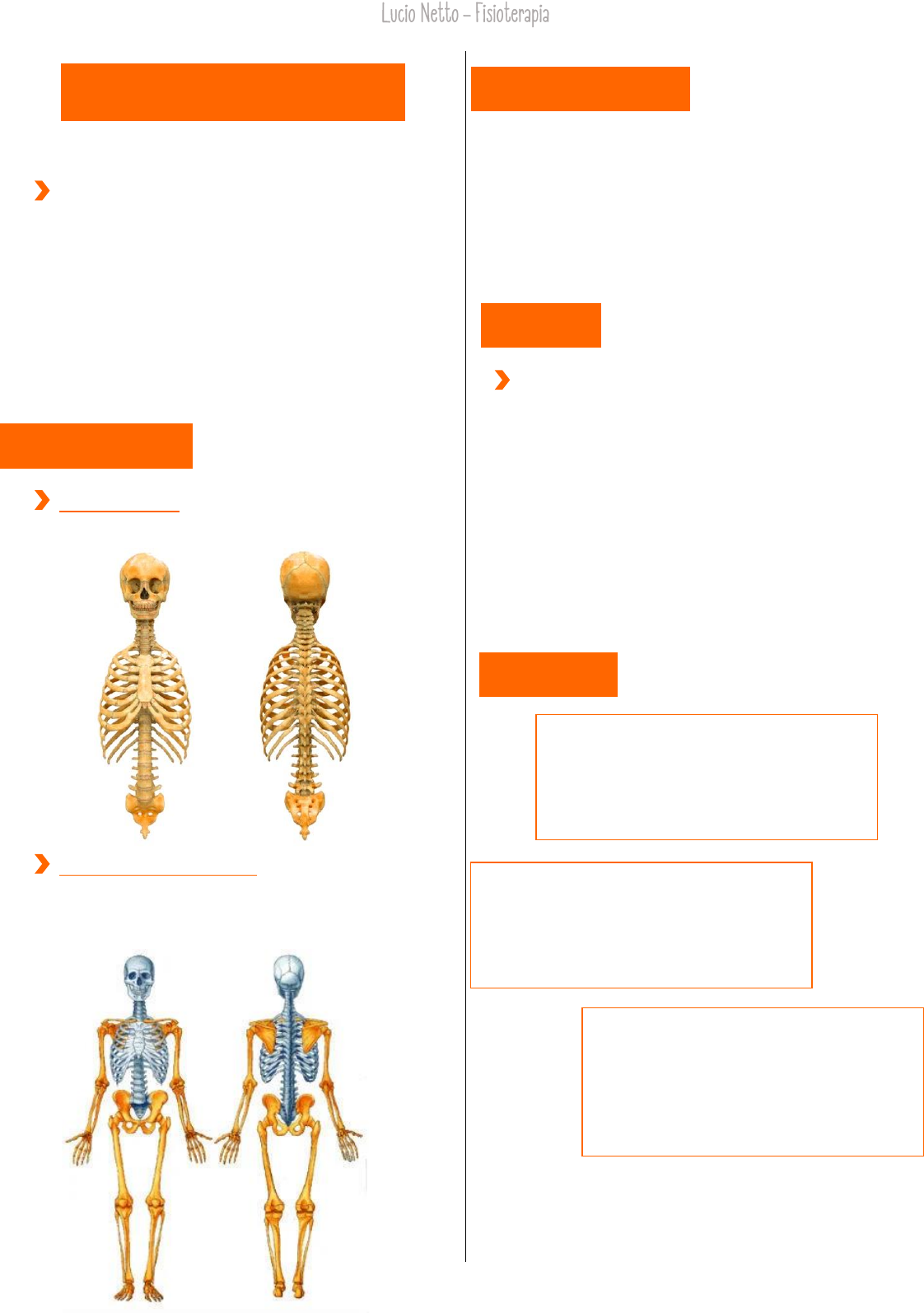 <p>Classificação dos ossos:</p><p>Cartilagem:</p><p>Articulações:</p><p>INTRODUÇÃO</p><p>O sistema esquelético é composto por um</p><p>conjunto de ossos e cartilagens que se interligam</p><p>para formar o arcabouço do corpo e desempenha as</p><p>seguintes funções: sustentação; base mecânica para</p><p>os movimentos, proteção; articulação dos</p><p>movimentos e produção de algumas células</p><p>sanguíneas através da medula óssea. Adultos, com</p><p>o desenvolvimento completo possuem 206 ossos,</p><p>já um recém-nascido tem cerca de 270 ossos.</p><p>Esqueleto axial: cabeça, pescoço e tronco. (axial</p><p>quer dizer eixo/sustentação/central.)</p><p>Esqueleto apendicular: MMSS: membros</p><p>superiores e MMII: membros inferiores.</p><p>(apendicular vem da palavra pendulo/solto e são</p><p>interligados ao eixo por causa das suas cinturas.)</p><p>• Ossos longos: apresentam maior comprimento em</p><p>relação à largura e espessura, constituídos por um</p><p>corpo e duas extremidades. Ex.: fêmur e ulna.</p><p>• Ossos curtos: todas as dimensões são</p><p>equivalentes. (comprimento, espessura e largura).</p><p>Ex.: tarso e carpo.</p><p>A cartilagem é um tipo de tecido conjuntivo</p><p>rígido encontrado em várias partes do corpo, que</p><p>incluem a superfície das articulações, a orelha, o</p><p>nariz e os discos intervertebrais. Embora mais</p><p>rígida e menos flexível do que o músculo, a</p><p>cartilagem não é tão rígida quanto o osso. Essas</p><p>propriedades permitem que ela tenha funções</p><p>importantes no organismo. O revestimento das</p><p>superfícies articulares, por exemplo, permite a</p><p>absorção de impactos e o deslizamento entre os</p><p>ossos.</p><p>Sistema Esquelético</p><p>Divisão do esqueleto:</p><p>• Articulações sinoviais: presença de uma cápsula que</p><p>delimita uma cavidade articular. Nessa cavidade é</p><p>encontrado um líquido viscoso que recebe o nome de líquido</p><p>sinovial, o qual é rico em ácido hialurônico. Esse ácido</p><p>apresenta um importante efeito lubrificante. Esse tipo de</p><p>articulação pode ser conferido na complexa articulação do</p><p>joelho.</p><p>V00,,,/nbvcxz\</p><p>,,0eja mais sobre "Sistema esquelético" em:</p><p>https://brasilescola.uol.com.br/biologia/sistema-</p><p>esqueletico.htm</p><p>• Articulações cartilaginosas: presença de tecido</p><p>cartilaginoso entre os ossos e da redução de mobilidade.</p><p>Podemos classificar essas articulações em sincondroses,</p><p>formadas por cartilagem hialina, e em sínfises, que</p><p>apresentam cartilagem fibrosa. Um exemplo de articulação</p><p>cartilaginosa é a presente entre as porções púbicas dos ossos</p><p>do quadril.</p><p>Veja mais sobre "Sistema esquelético" em:</p><p>https://brasilescola.uol.com.br/biologia/sistema-</p><p>esqueletico.htm</p><p>Veja mais sobre "Sistema esquelético" em:</p><p>https://brasilescola.uol.com.br/biologia/sistema-</p><p>esqueletico.htm</p><p>• Articulações fibrosas: presença de tecido conjuntivo</p><p>fibroso entre os ossos. Essas articulações apresentam</p><p>mobilidade reduzida ou são imóveis. Existem dois tipos de</p><p>articulações fibrosas: as suturas e as sindesmoses. As suturas</p><p>são encontradas nos ossos do crânio, e a membrana de tecido</p><p>conjuntivo observada entre esses é muito fina. As</p><p>sindesmoses apresentam características similares às suturas,</p><p>porém não são observadas no crânio."</p><p>Veja mais sobre "Sistema esquelético" em:</p><p>https://brasilescola.uol.com.br/biologia/sistema-</p><p>esqueletico.htm</p><p>Veja mais sobre "Sistema esquelético" em:</p><p>https://brasilescola.uol.com.br/biologia/sistema-</p><p>esqueletico.htm</p><p>A primeira é chamada de</p><p>coluna cervical e possui 7</p><p>pares de vértebras, sendo</p><p>considerada muito móvel,</p><p>e sua curvatura é côncava.</p><p>A segunda de coluna torácica possui</p><p>12 pares, e é considerada pouco</p><p>móvel, executando movimentos</p><p>apenas na inspiração e espiração,</p><p>possui curvatura convexa.</p><p>A terceira é a coluna lombar com 5</p><p>pares e assim como a cervical é</p><p>considerada muito móvel, realizando</p><p>flexão, extensão, inclinação e rotação,</p><p>sua rotação também é côncava.</p><p>logo em seguida a coluna sacral com 5</p><p>pares também e a coccígea com 4 pares</p><p>ambos são imóveis já que suas vertebras</p><p>são fundidas em um único osso, as duas</p><p>possuem curvatura convexa.</p><p>Esqueleto Axial</p><p>A carlota craniana está dividida em neurocrânio</p><p>e viscerocrânio. O neurocrânio está dividido</p><p>basicamente em oito ossos sendo eles: frontal</p><p>(osso da frente, pertence também a face); parietais</p><p>(osso par, localizados no topo do crânio); occipital</p><p>(base do crânio e é onde está localizado o forame</p><p>magno que é o maior forame do corpo humano e</p><p>por onde desce a medula espinal); ossos temporais</p><p>(lateral, direita e esquerda); esfenoide (conhecido</p><p>por osso morcego, pertence também a face) e o</p><p>etmoide (osso encontrado atrás do lacrimal</p><p>extremante frágil). Já o viscerocrânio é composto</p><p>pelos seguintes ossos: zigomático (maçã do rosto);</p><p>palatino (céu da boca); maxila (sustentação dos</p><p>dentes superiores e está envolvido na formação do</p><p>palatino e do nariz); lacrimal (é o menor e mais</p><p>frágil osso da face e está localizado na porção</p><p>anterior da órbita); mandíbula (A mandíbula é o</p><p>maior osso da face, e é o único osso móvel do</p><p>crânio); nasal (são dois ossos pequenos e</p><p>simétricos da face, que constituem a ponte do</p><p>nariz).</p><p>O tronco é dividido em duas vistas uma anterior</p><p>e outra posterior. Na parte anterior temos a caixa</p><p>torácica (que é formada pelo esterno e pelos 12</p><p>pares de costela, tendo como sua principal função</p><