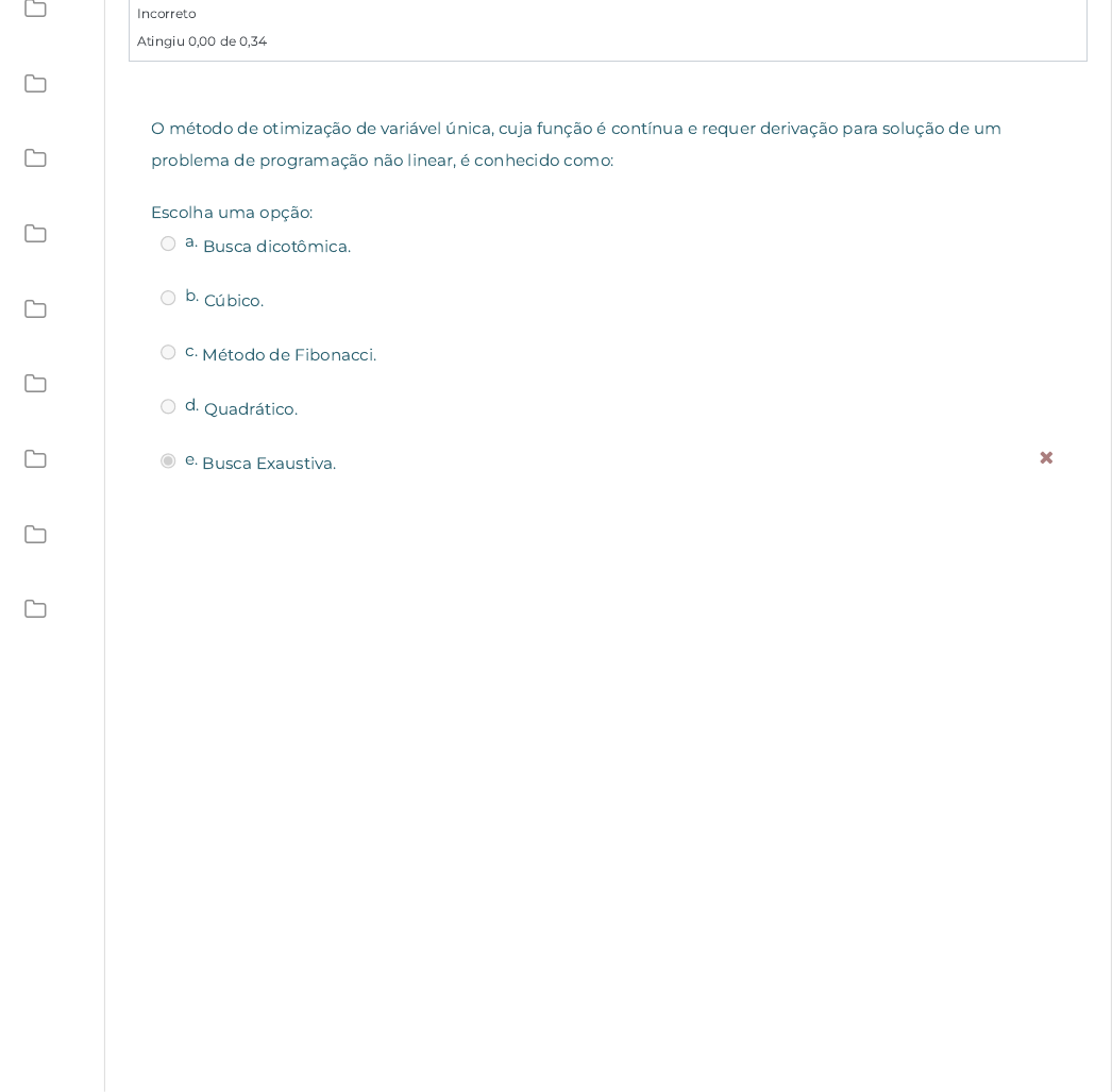 <p>Incorreto</p><p>Atingiu 0,00 de 0,34</p><p>O método de otimização de variável única, cuja função é contínua e requer derivação para solução de um</p><p>problema de programação não linear, é conhecido como:</p><p>Escolha uma opção:</p><p>a. Busca dicotômica.</p><p>b. Cúbico.</p><p>c. Método de Fibonacci.</p><p>d. Quadrático.</p><p>e. Busca Exaustiva. </p><p></p><p></p><p></p><p></p><p></p><p></p><p></p><p></p><p></p><p>https://avap.multivix.edu.br/my/</p><p>https://avap.multivix.edu.br/course/view.php?id=26435</p><p>https://avap.multivix.edu.br/course/view.php?id=26435§ion=6</p><p>https://avap.multivix.edu.br/mod/quiz/view.php?id=1640098</p><p>https://avap.multivix.edu.br/my/</p><p>https://avap.multivix.edu.br/course/view.php?id=26435</p><p>https://avap.multivix.edu.br/user/index.php?id=26435</p><p>https://avap.multivix.edu.br/course/view.php?id=26435§ion=1</p><p>https://avap.multivix.edu.br/course/view.php?id=26435§ion=2</p><p>https://avap.multivix.edu.br/course/view.php?id=26435§ion=3</p><p>https://avap.multivix.edu.br/course/view.php?id=26435§ion=4</p><p>https://avap.multivix.edu.br/course/view.php?id=26435§ion=5</p><p>https://avap.multivix.edu.br/course/view.php?id=26435§ion=6</p><p>https://avap.multivix.edu.br/course/view.php?id=26435§ion=7</p><p>https://avap.multivix.edu.br/course/view.php?id=26435§ion=8</p><p>https://avap.multivix.edu.br/course/view.php?id=26435§ion=9</p><p>https://avap.multivix.edu.br/course/view.php?id=26435§ion=10</p><p>https://avap.multivix.edu.br/</p><p>https://avap.multivix.edu.br/</p><p>https://avap.multivix.edu.br/</p><p>https://avap.multivix.edu.br/</p><p>https://avap.multivix.edu.br/</p><p></p><p></p><p></p><p></p><p></p><p></p><p></p><p></p><p></p><p>https://avap.multivix.edu.br/my/</p><p>https://avap.multivix.edu.br/course/view.php?id=26435</p><p>https://avap.multivix.edu.br/user/index.php?id=26435</p><p>https://avap.multivix.edu.br/course/view.php?id=26435§ion=1</p><p>https://avap.multivix.edu.br/course/view.php?id=26435§ion=2</p><p>https://avap.multivix.edu.br/course/view.php?id=26435§ion=3</p><p>https://avap.multivix.edu.br/course/view.php?id=26435§ion=4</p><p>https://avap.multivix.edu.br/course/view.php?id=26435§ion=5</p><p>https://avap.multivix.edu.br/course/view.php?id=26435§ion=6</p><p>https://avap.multivix.edu.br/course/view.php?id=26435§ion=7</p><p>https://avap.multivix.edu.br/course/view.php?id=26435§ion=8</p><p>https://avap.multivix.edu.br/course/view.php?id=26435§ion=9</p><p>https://avap.multivix.edu.br/course/view.php?id=26435§ion=10</p><p>https://avap.multivix.edu.br/</p><p>https://avap.multivix.edu.br/</p><p>https://avap.multivix.edu.br/</p><p>https://avap.multivix.edu.br/</p><p>https://avap.multivix.edu.br/</p><p>Questão 4</p><p>Correto</p><p>Atingiu 0,34 de 0,34</p><p>c. Método de Gauss Jordan.</p><p>d. Método Jacobi.</p><p>e. Cálculo Diferencial.</p><p>Acerca das características gerais de programação não linear, analise as alternativas a seguir marque a que</p><p>apresenta uma a�rmativa correta.</p><p>Escolha uma opção:</p><p>a. Devido a existir poucos tipos de problemas de programação não linear, o é particularmente curto.</p><p>b. Não foram desenvolvidos pacotes de software con�áveis e de alta qualidade para uso geral na aplicação</p><p>dos melhores desses algoritmos.</p><p>c. Em pesquisa operacional, raramente é necessário lidar de forma direta com problemas de programação</p><p>não linear.</p><p>d. Poucos são os tipos de problemas de programação não linear, de acordo com as características das</p><p>funções</p><p>e. Há formas e formatos de problemas de programação não linear. </p><p></p><p></p><p></p><p></p><p></p><p></p><p></p><p></p><p></p><p>https://avap.multivix.edu.br/my/</p><p>https://avap.multivix.edu.br/course/view.php?id=26435</p><p>https://avap.multivix.edu.br/user/index.php?id=26435</p><p>https://avap.multivix.edu.br/course/view.php?id=26435§ion=1</p><p>https://avap.multivix.edu.br/course/view.php?id=26435§ion=2</p><p>https://avap.multivix.edu.br/course/view.php?id=26435§ion=3</p><p>https://avap.multivix.edu.br/course/view.php?id=26435§ion=4</p><p>https://avap.multivix.edu.br/course/view.php?id=26435§ion=5</p><p>https://avap.multivix.edu.br/course/view.php?id=26435§ion=6</p><p>https://avap.multivix.edu.br/course/view.php?id=26435§ion=7</p><p>https://avap.multivix.edu.br/course/view.php?id=26435§ion=8</p><p>https://avap.multivix.edu.br/course/view.php?id=26435§ion=9</p><p>https://avap.multivix.edu.br/course/view.php?id=26435§ion=10</p><p>https://avap.multivix.edu.br/</p><p>https://avap.multivix.edu.br/</p><p>https://avap.multivix.edu.br/</p><p>https://avap.multivix.edu.br/</p><p>https://avap.multivix.edu.br/</p><p>d. Gauss Jordan.</p><p>e. Leibniz.</p><p>◄ Conteúdo Online</p><p>Seguir para...</p><p>Conteúdo Online ►</p><p></p><p></p><p></p><p></p><p></p><p></p><p></p><p></p><p></p><p>https://avap.multivix.edu.br/mod/scorm/view.php?id=1640097&forceview=1</p><p>https://avap.multivix.edu.br/mod/scorm/view.php?id=1640099&forceview=1</p><p>https://avap.multivix.edu.br/my/</p><p>https://avap.multivix.edu.br/course/view.php?id=26435</p><p>https://avap.multivix.edu.br/user/index.php?id=26435</p><p>https://avap.multivix.edu.br/course/view.php?id=26435§ion=1</p><p>https://avap.multivix.edu.br/course/view.php?id=26435§ion=2</p><p>https://avap.multivix.edu.br/course/view.php?id=26435§ion=3</p><p>https://avap.multivix.edu.br/course/view.php?id=26435§ion=4</p><p>https://avap.multivix.edu.br/course/view.php?id=26435§ion=5</p><p>https://avap.multivix.edu.br/course/view.php?id=26435§ion=6</p><p>https://avap.multivix.edu.br/course/view.php?id=26435§ion=7</p><p>https://avap.multivix.edu.br/course/view.php?id=26435§ion=8</p><p>https://avap.multivix.edu.br/course/view.php?id=26435§ion=9</p><p>https://avap.multivix.edu.br/course/view.php?id=26435§ion=10</p><p>https://avap.multivix.edu.br/</p><p>https://avap.multivix.edu.br/</p><p>http